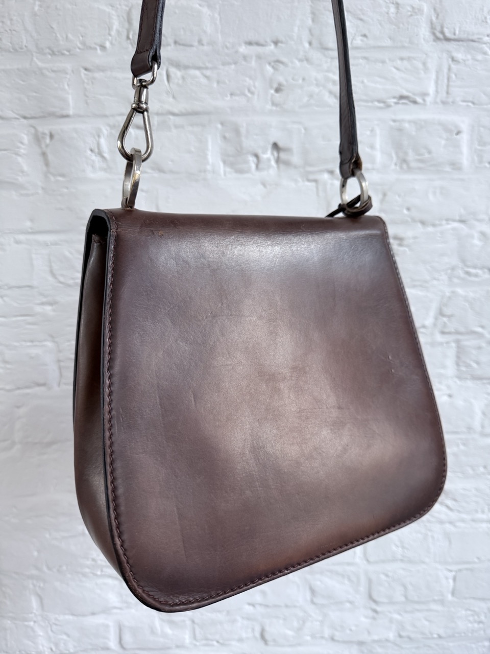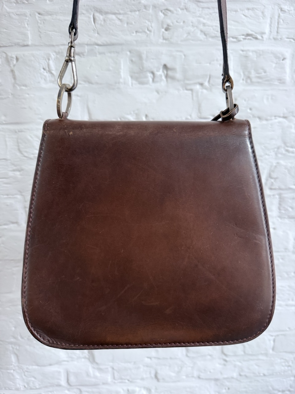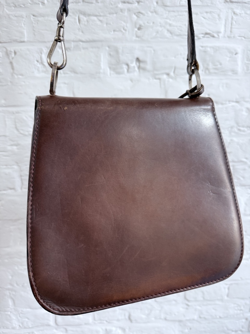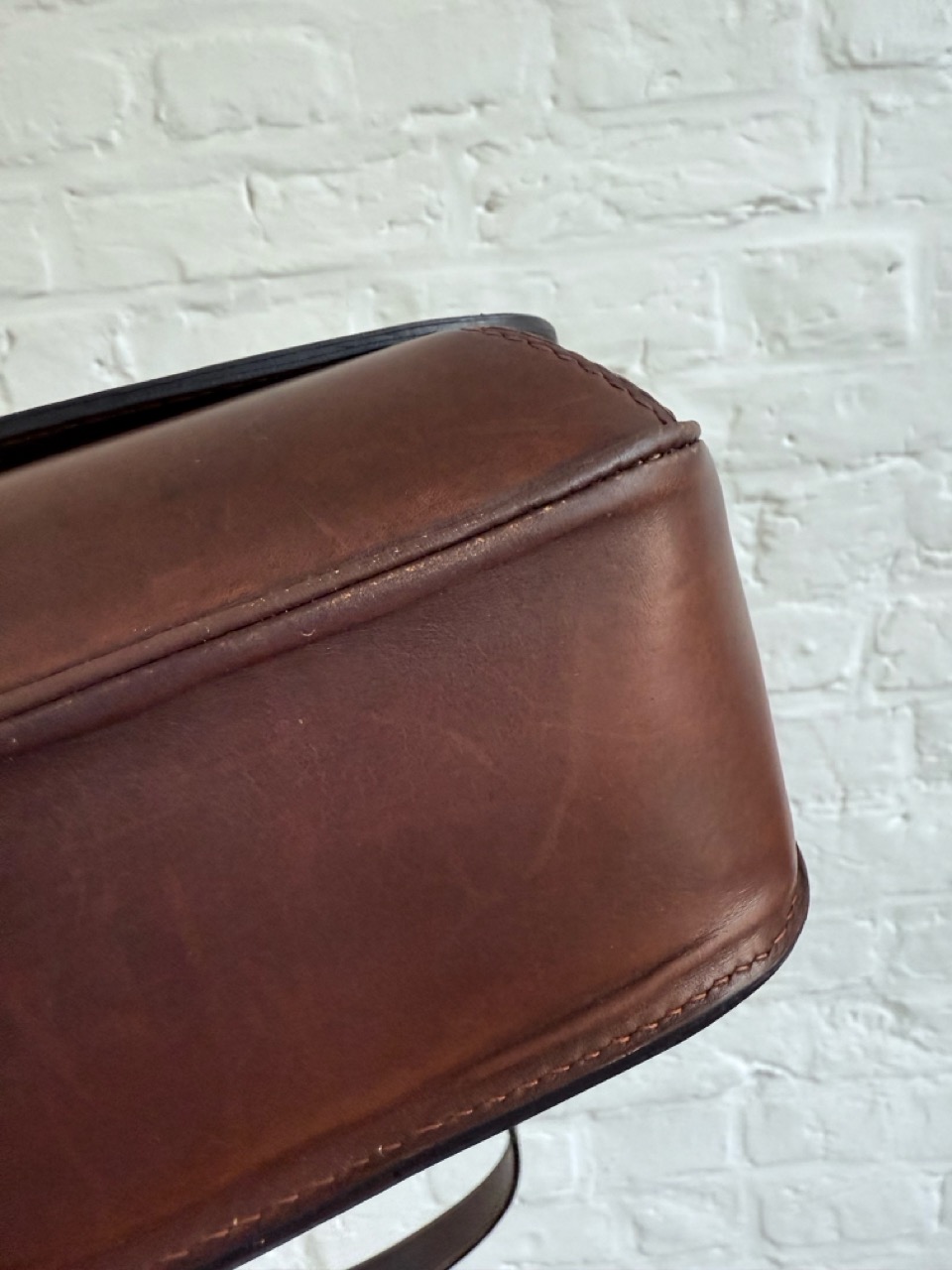 Een Schoudertas in een heel stevig kalfsleder met een waanzinnig mooie patina.