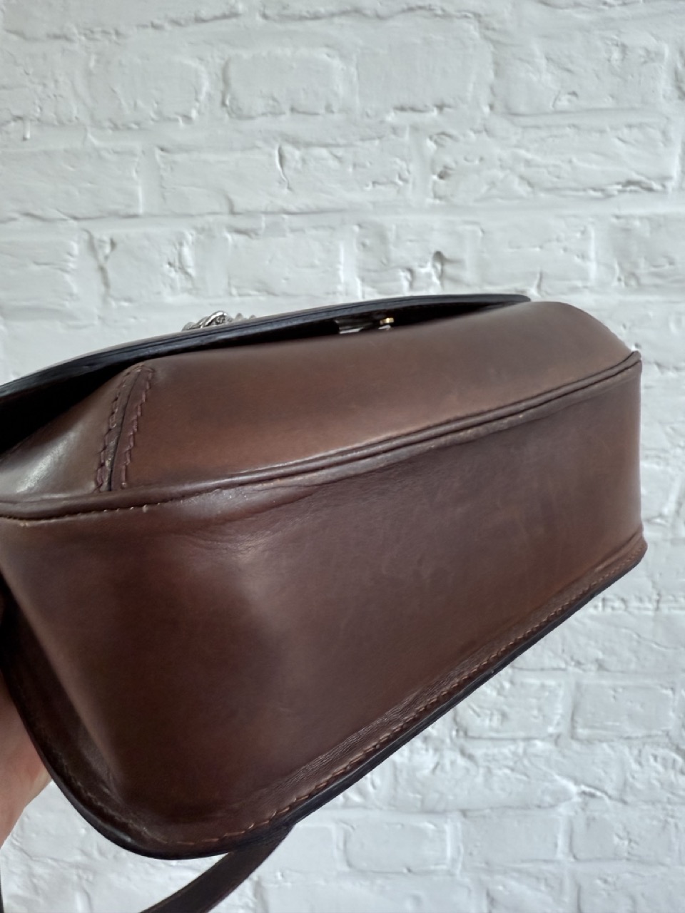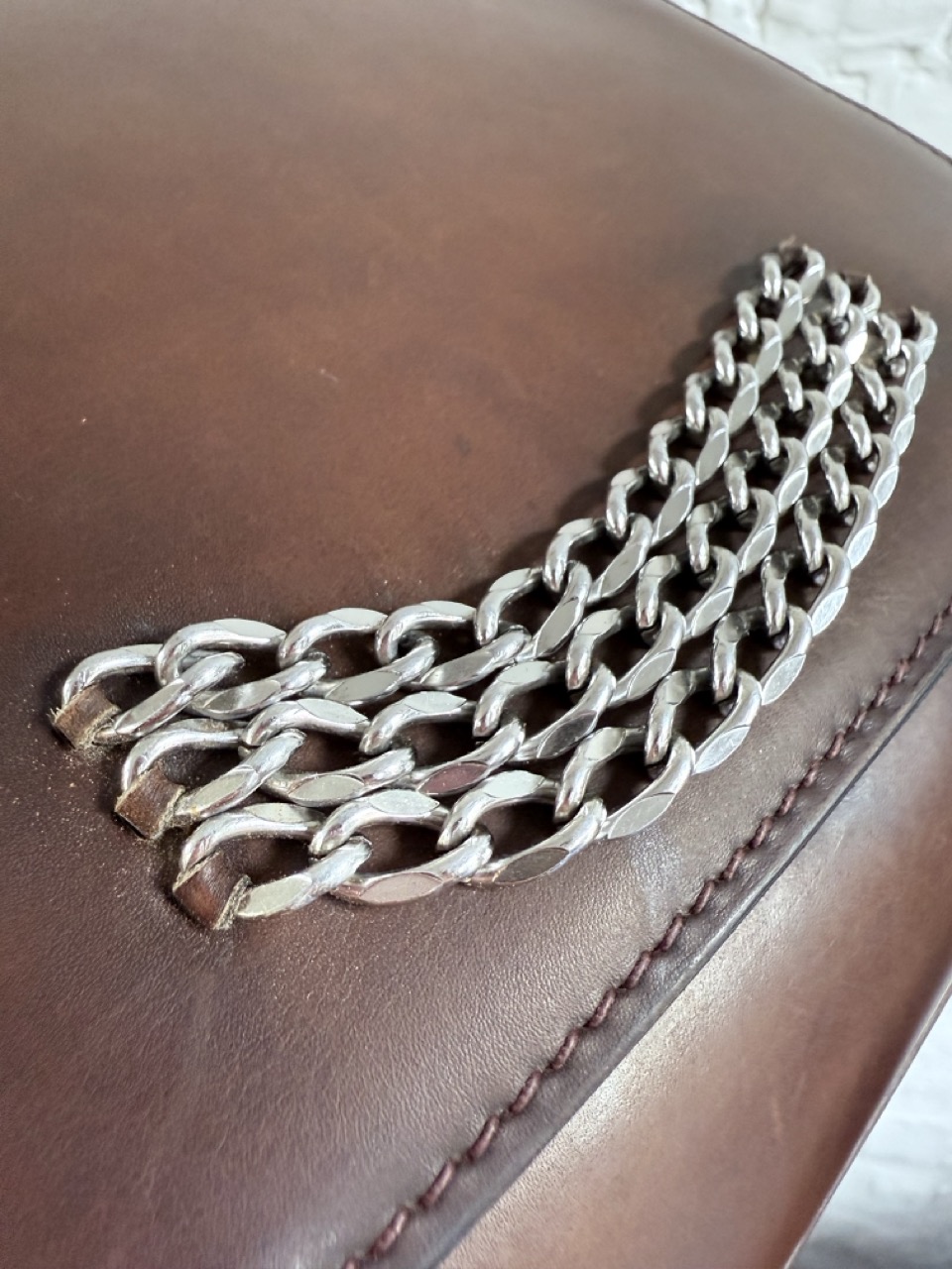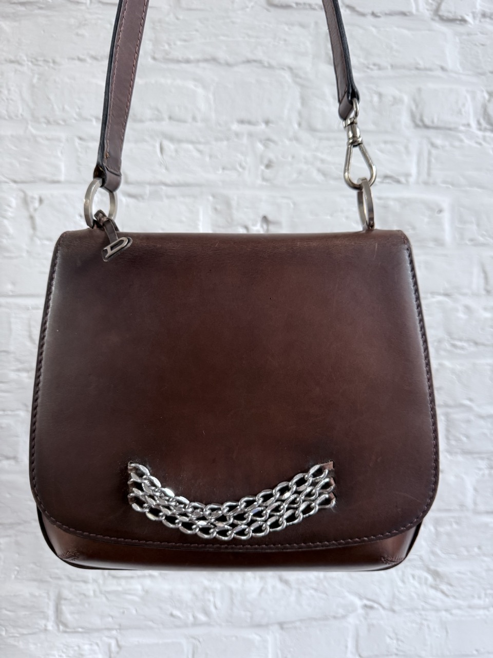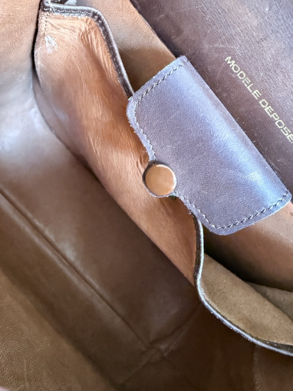 Een Schoudertas in een heel stevig kalfsleder met een waanzinnig mooie patina.