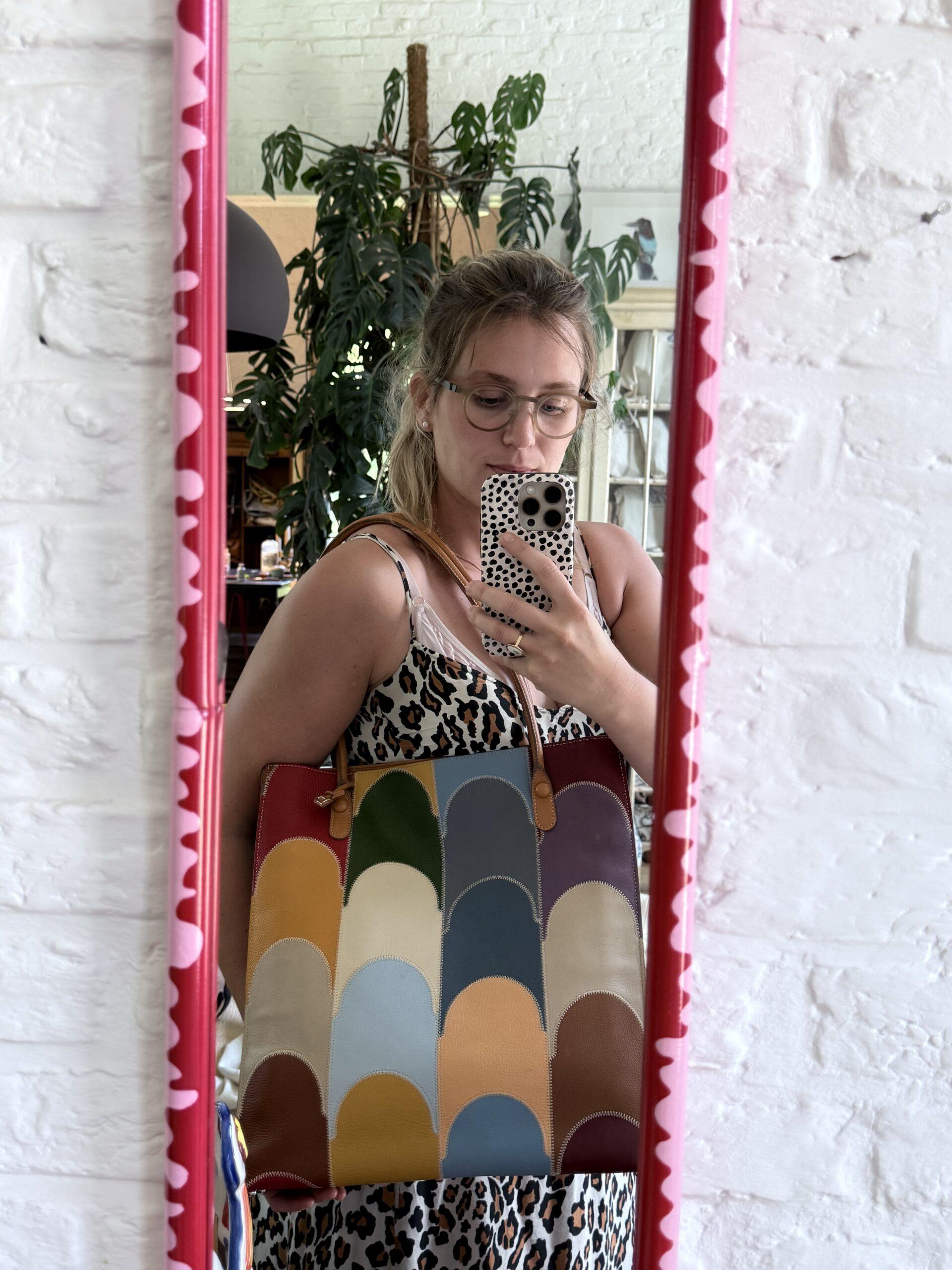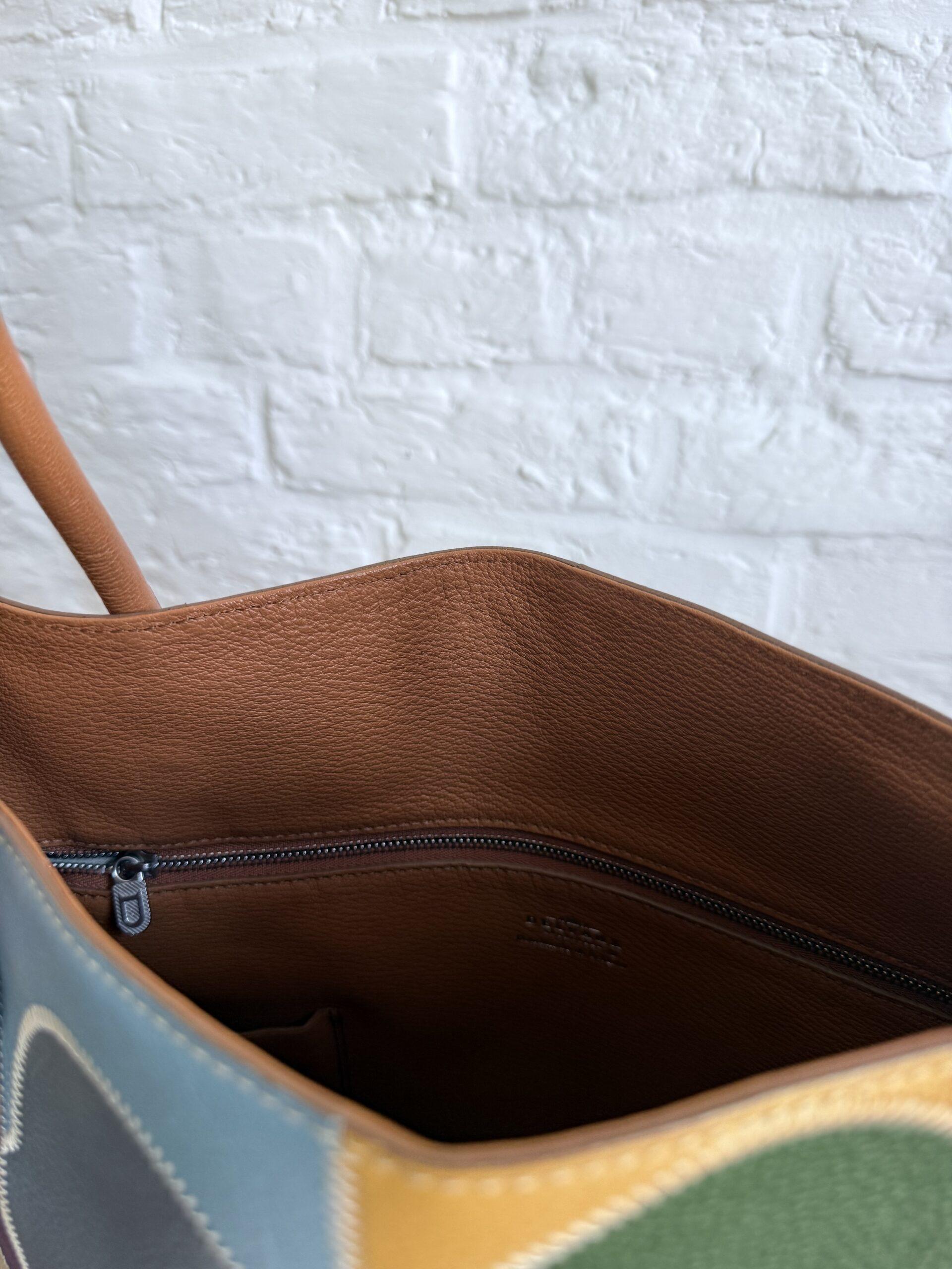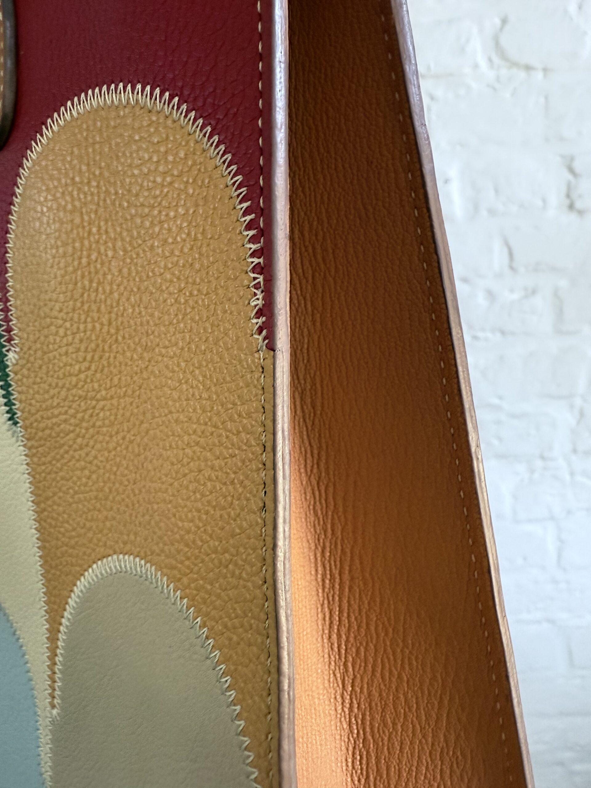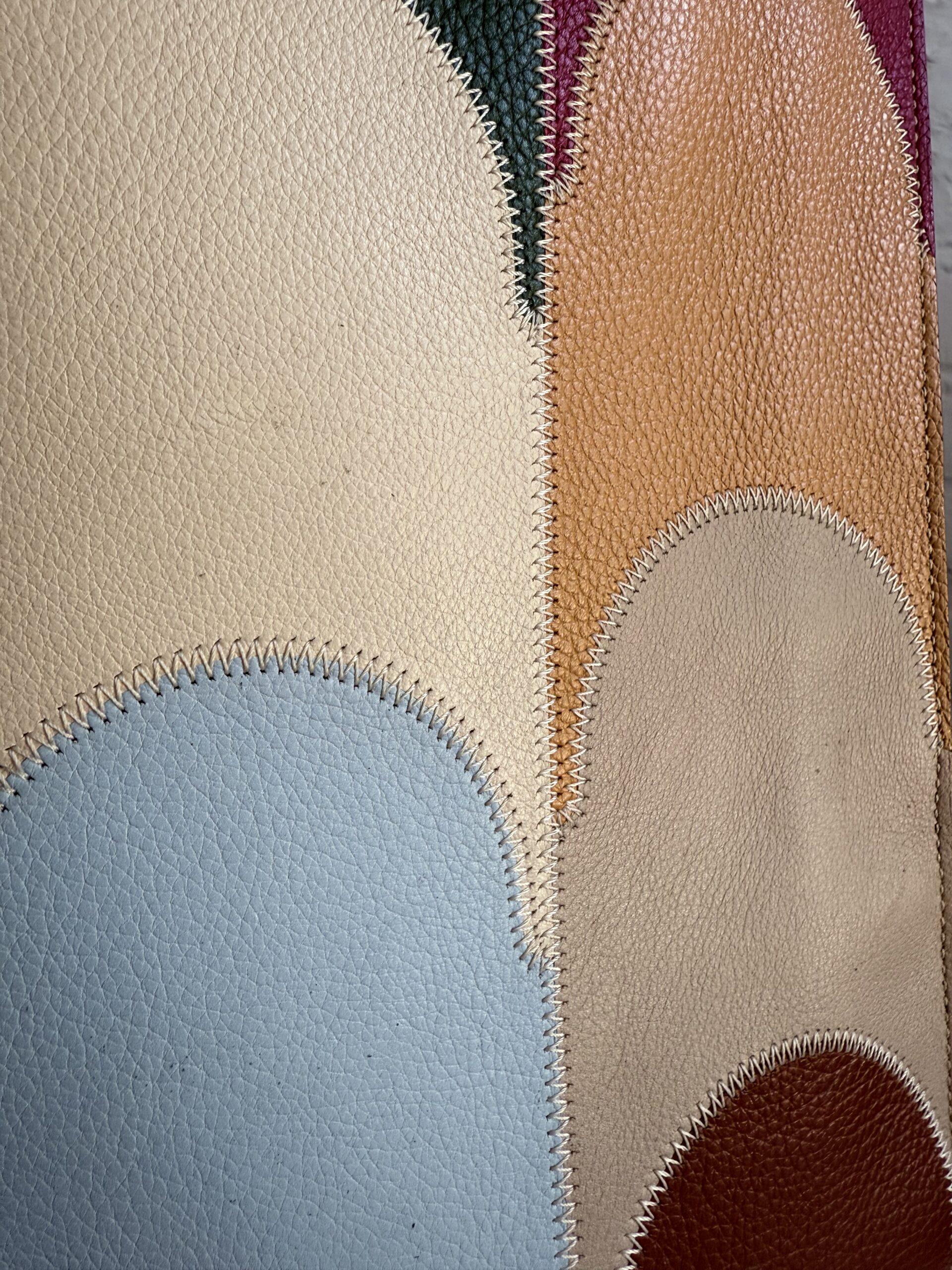 De tas is opgebouwd uit een patchwork van verschillende ledersoorten en -kleuren.