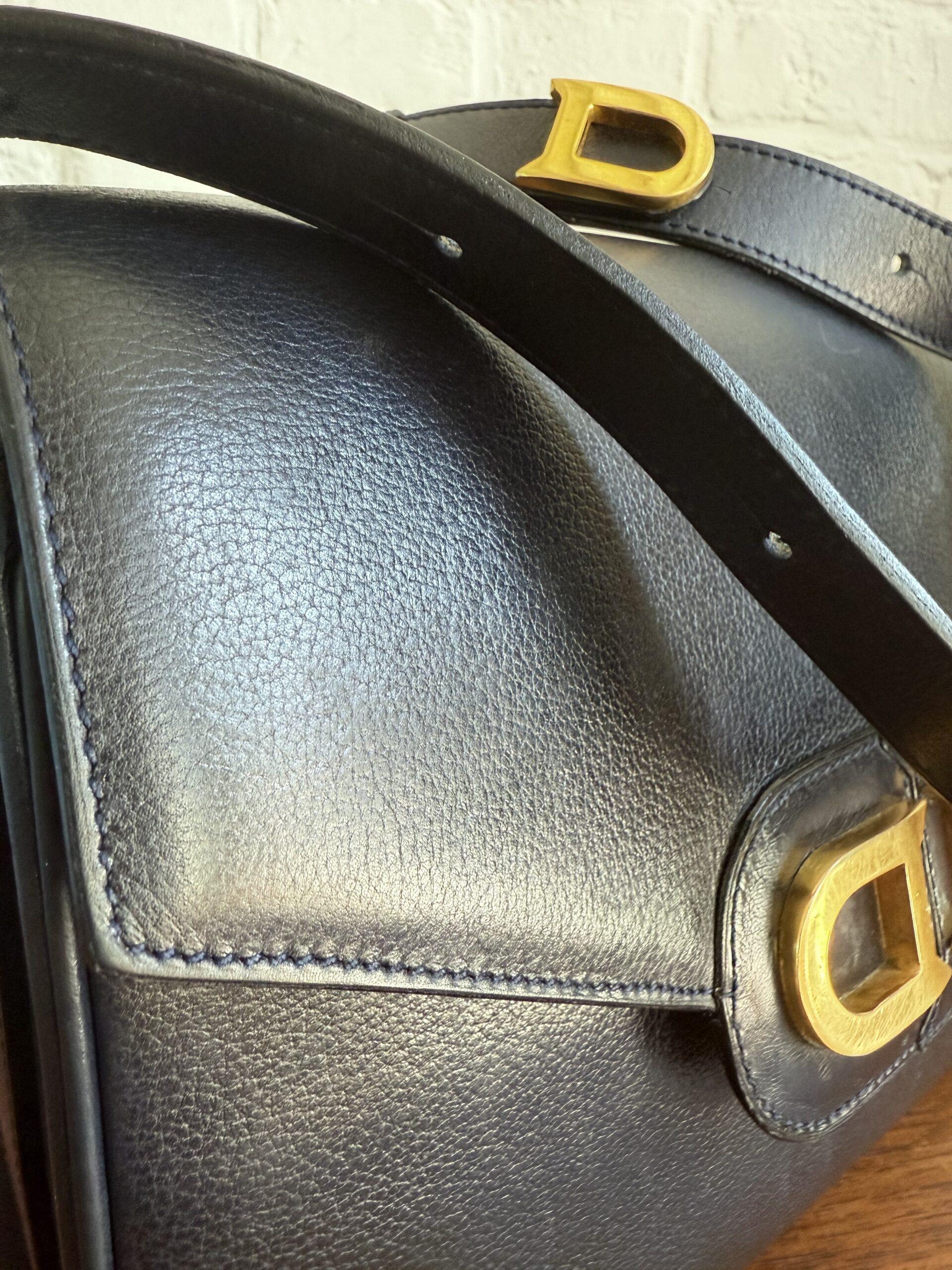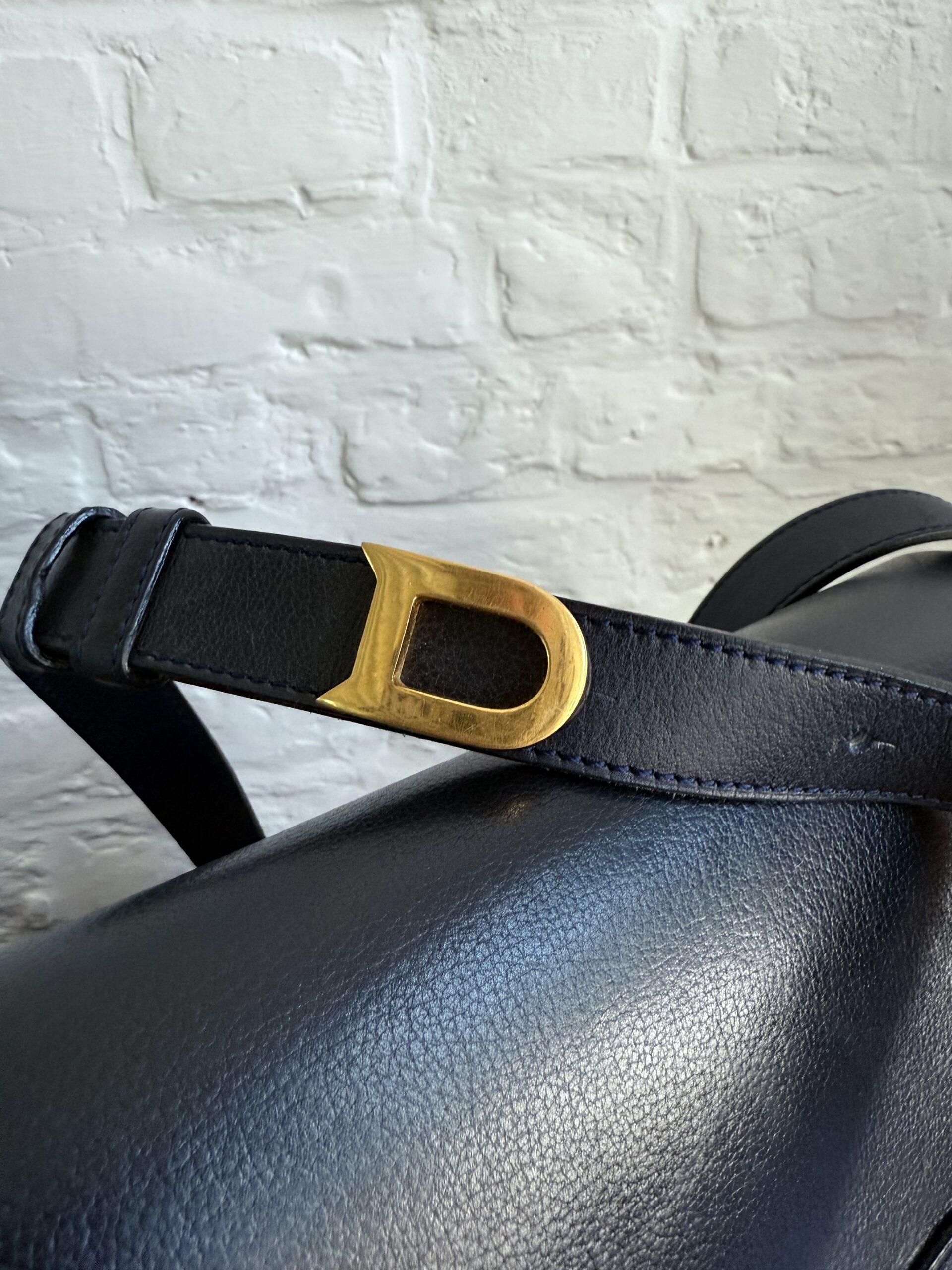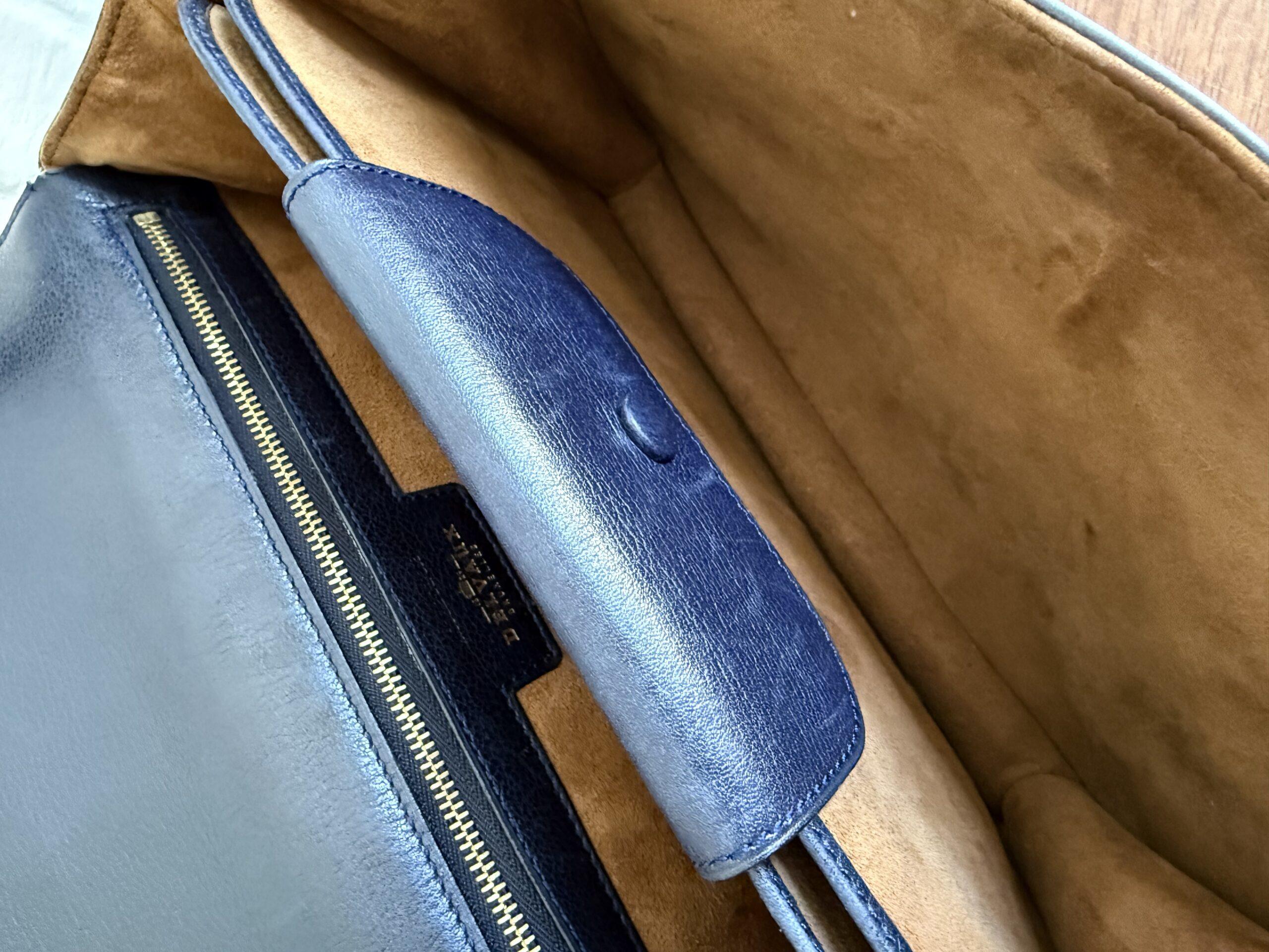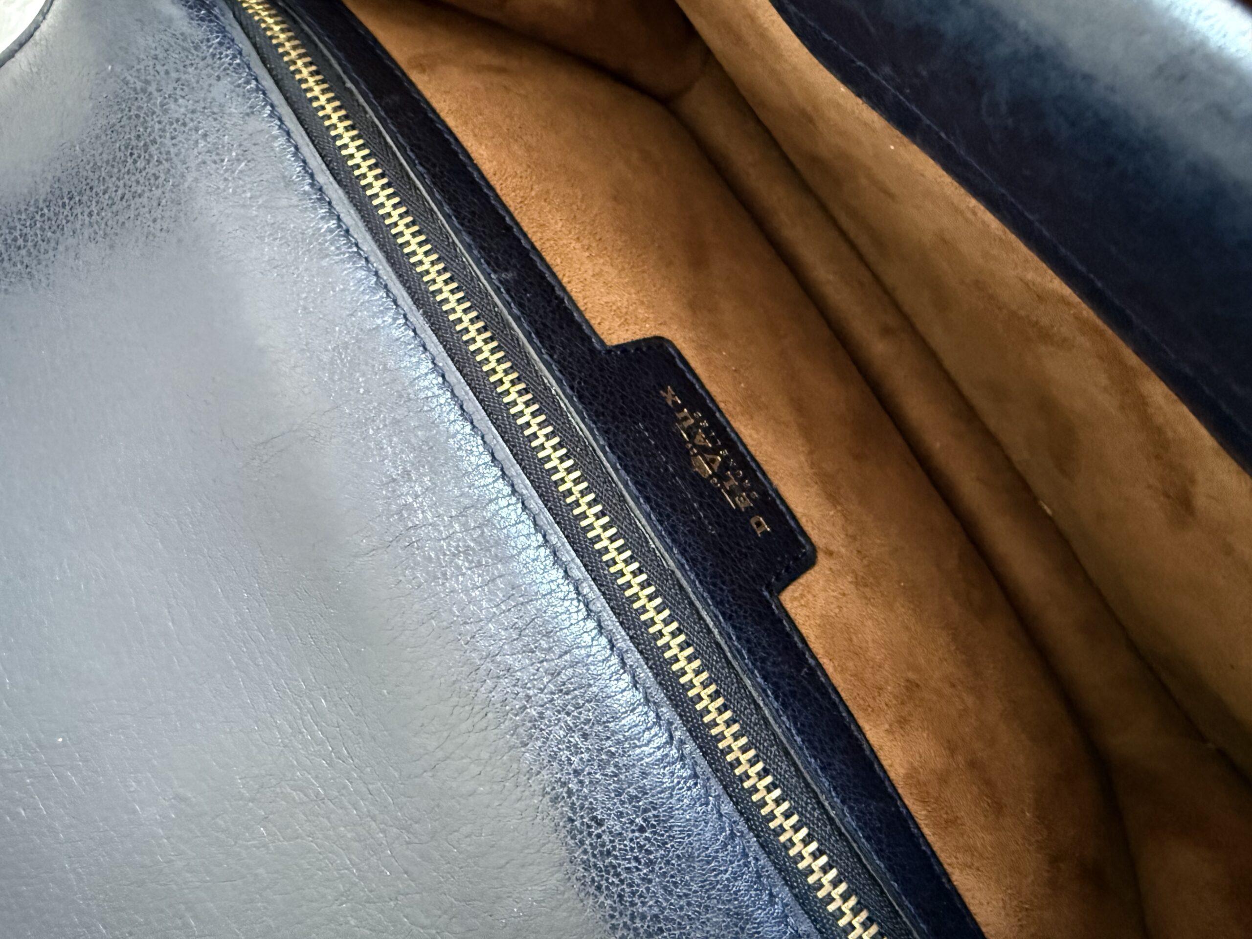 Deze uitvoering van de Bourgogne (of soortgelijk) is buitengewoon knap. In marine jumping calf, met de iconische vintage gesp en met de typische dubbele D op de sluiting.