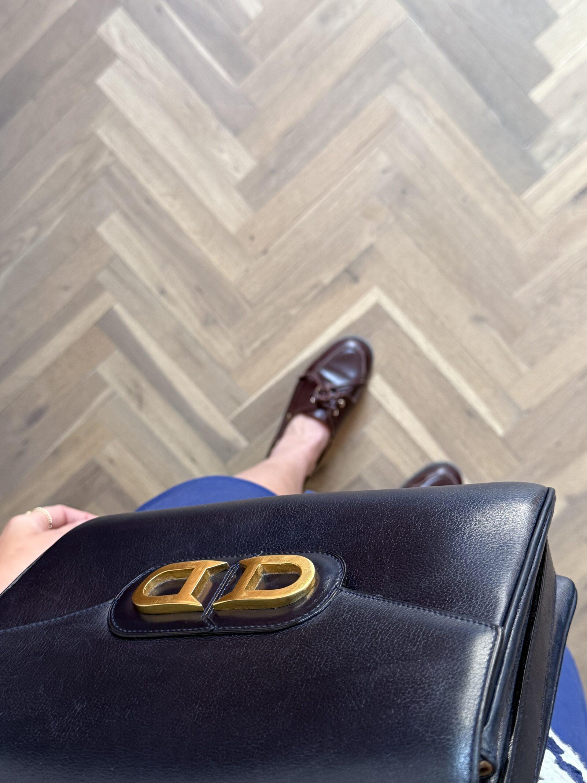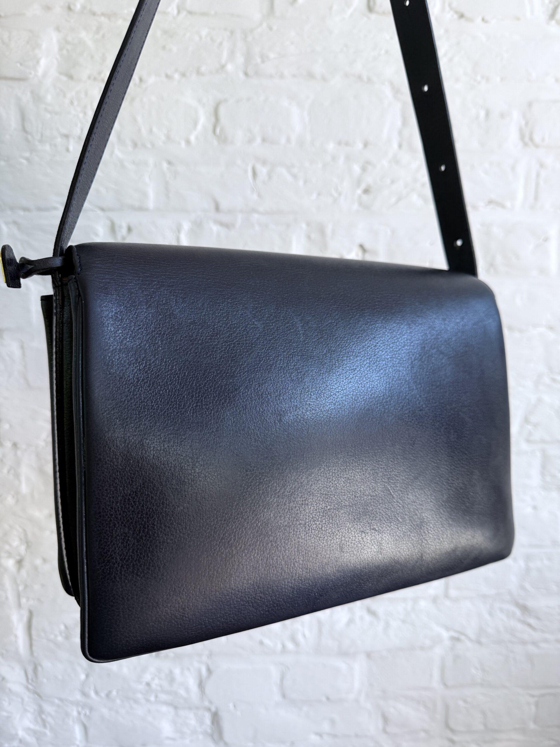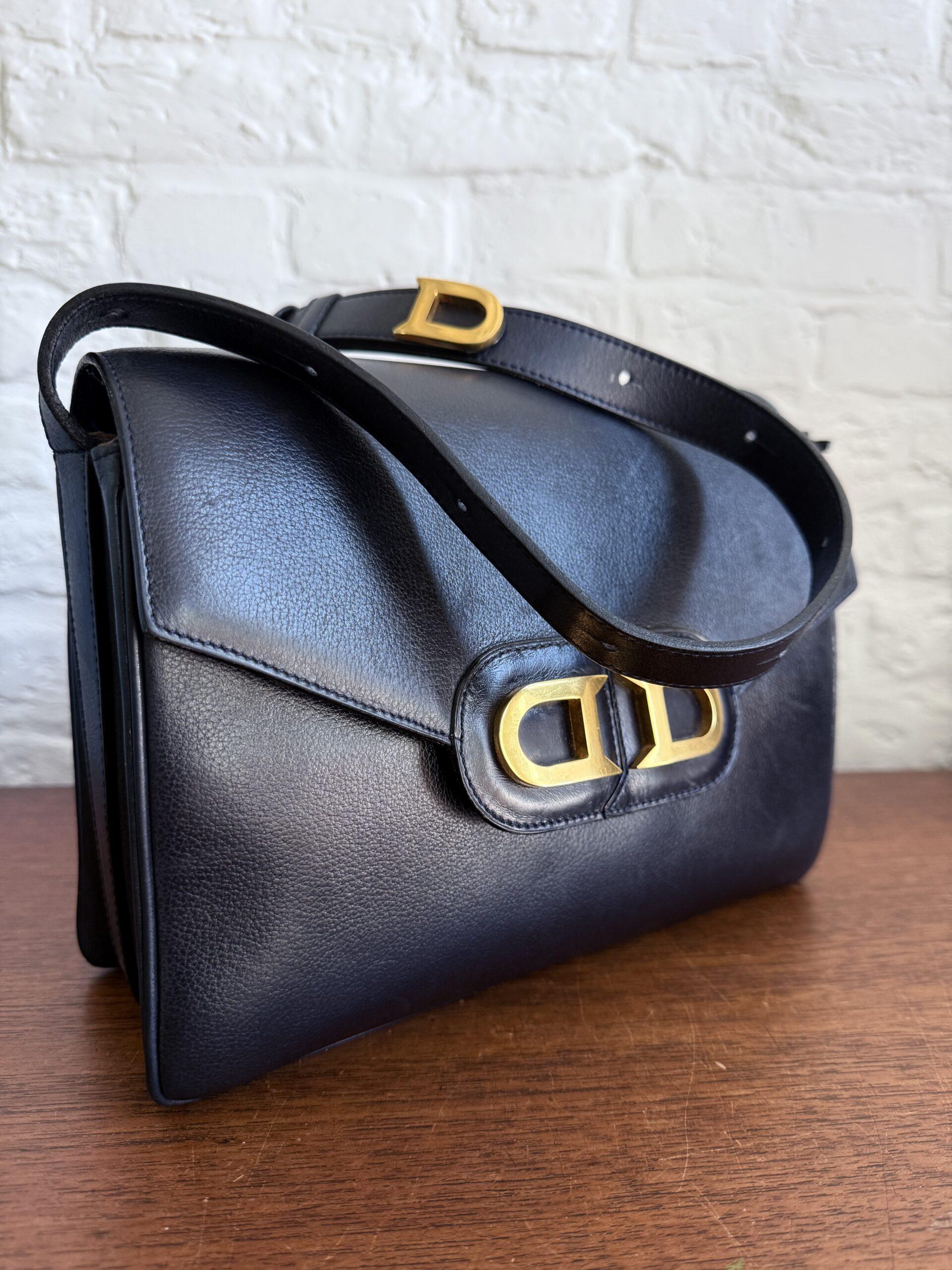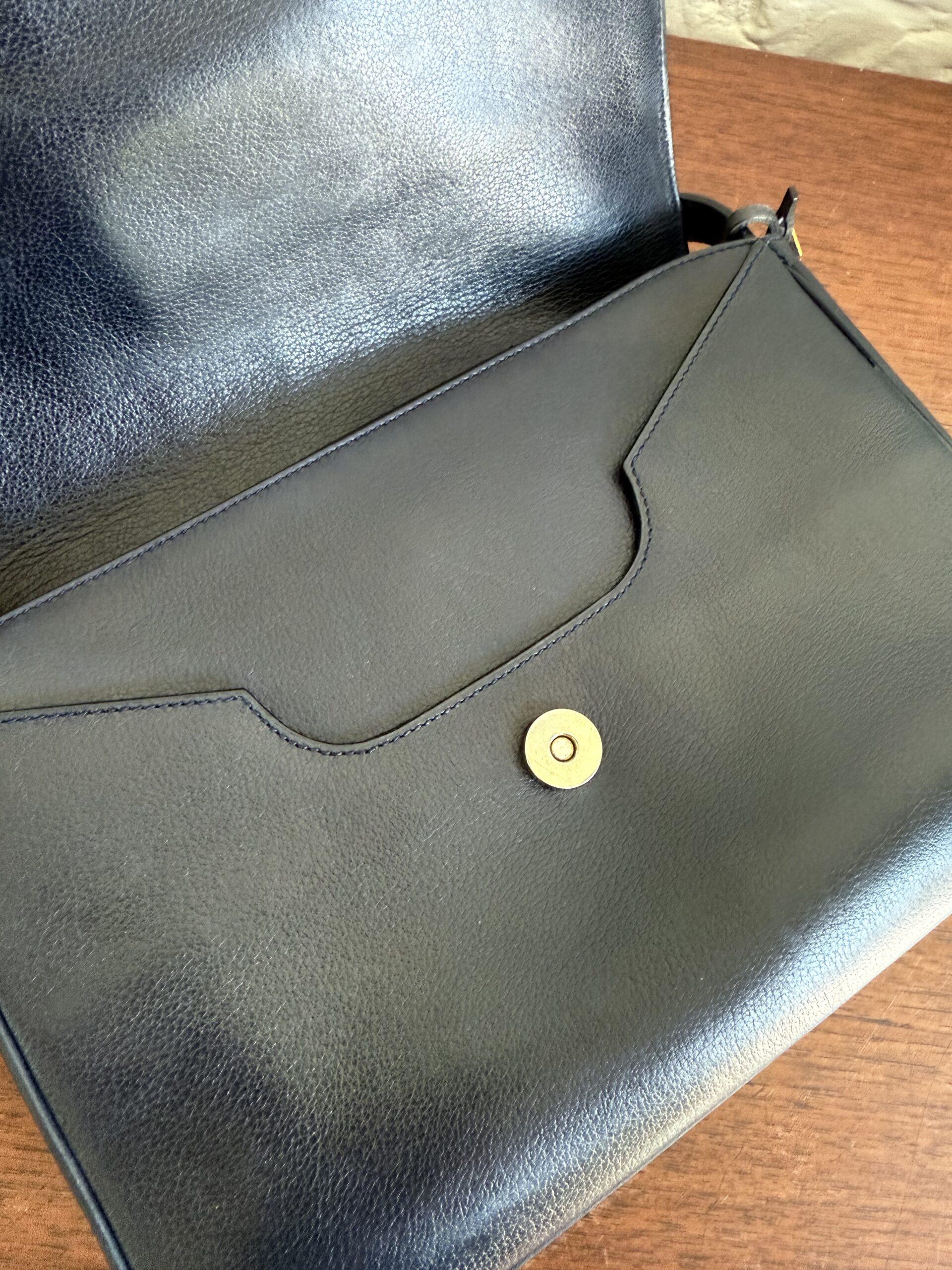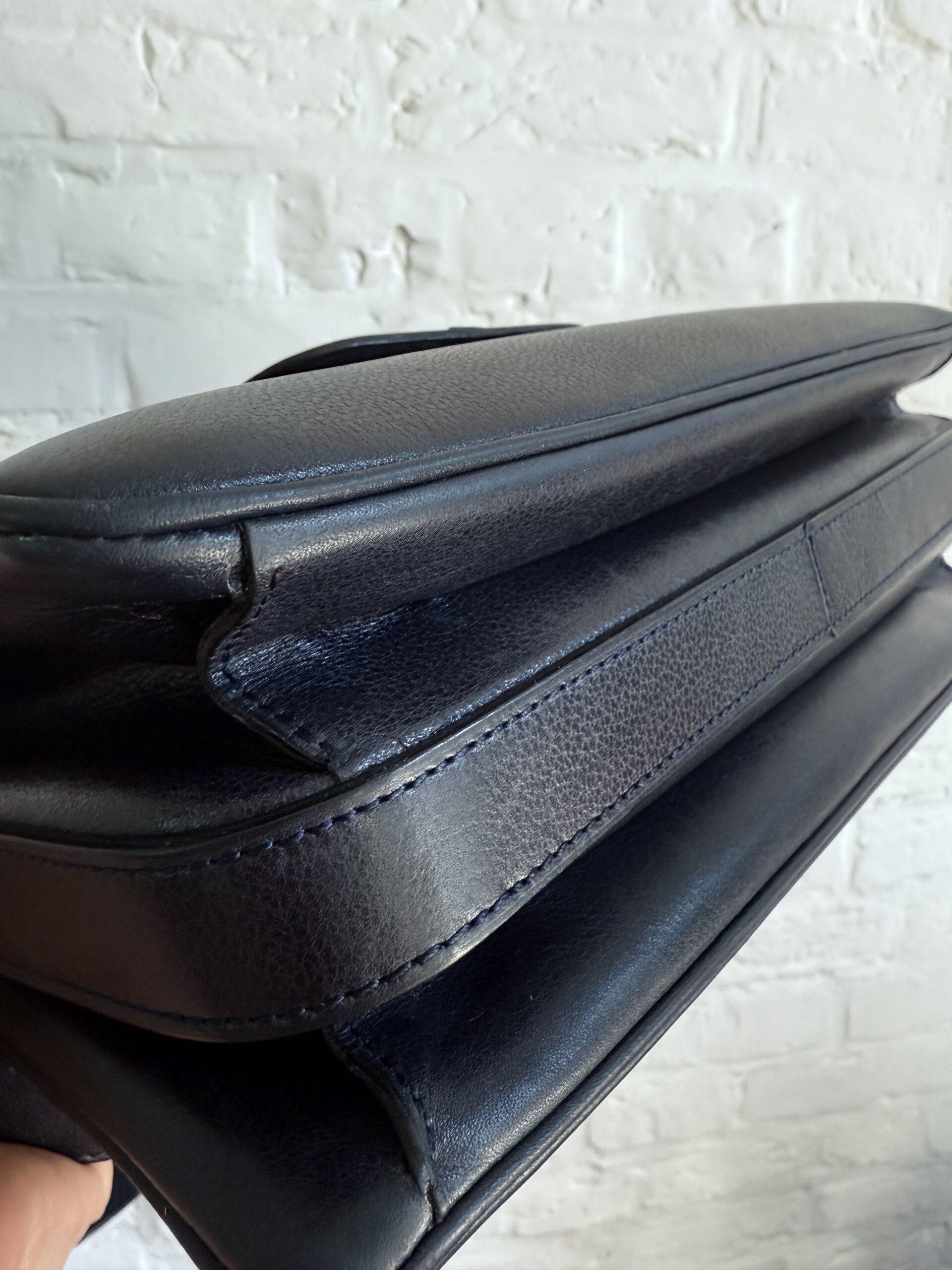 Deze uitvoering van de Bourgogne (of soortgelijk) is buitengewoon knap. In marine jumping calf, met de iconische vintage gesp en met de typische dubbele D op de sluiting.