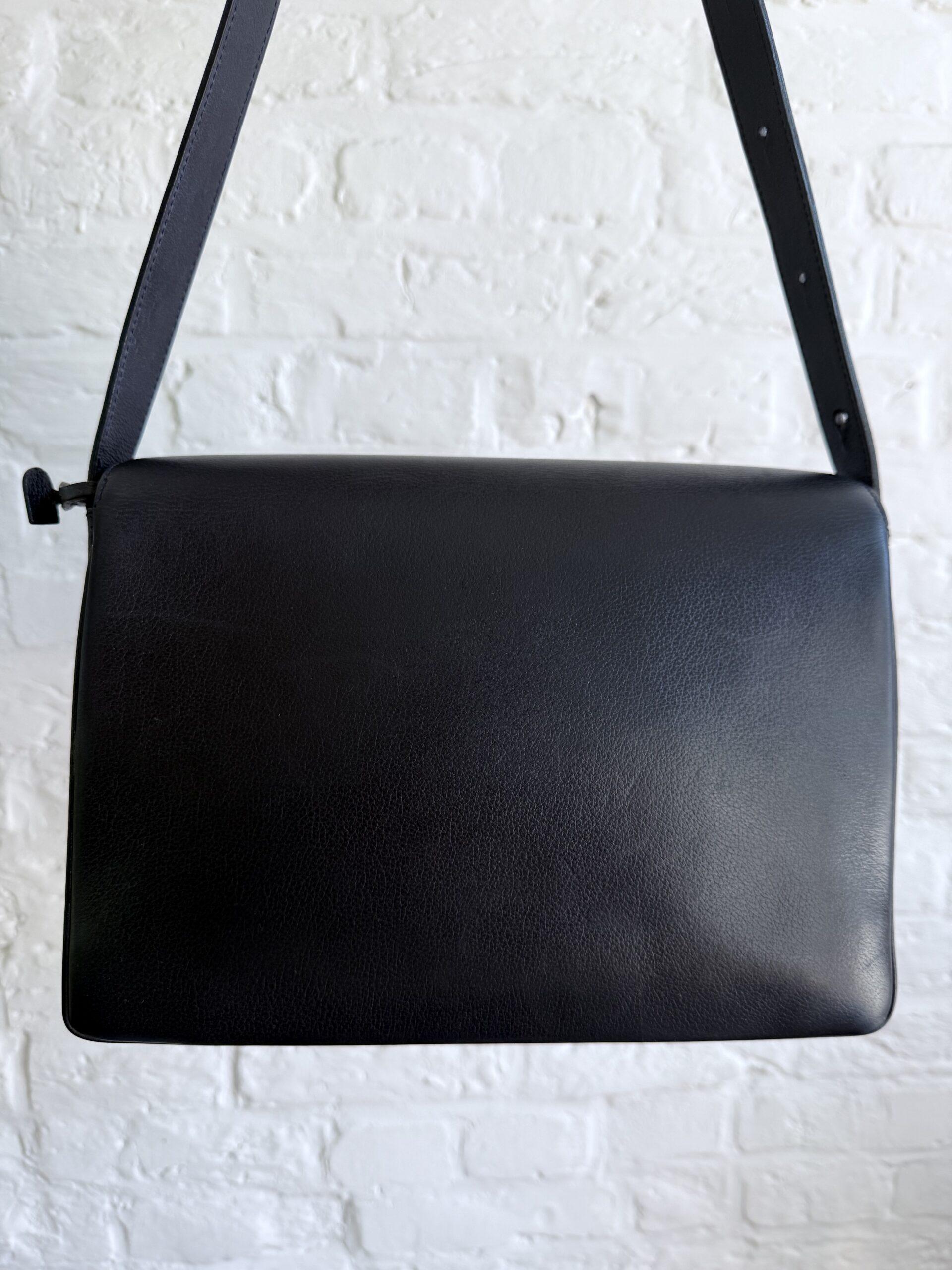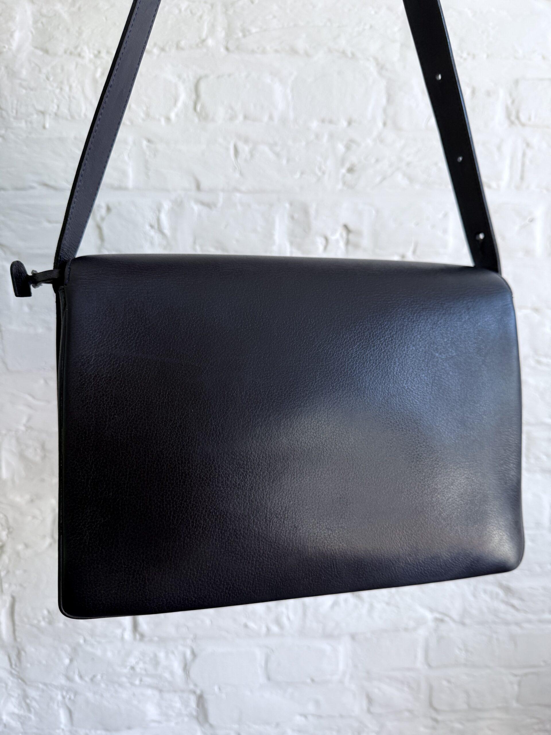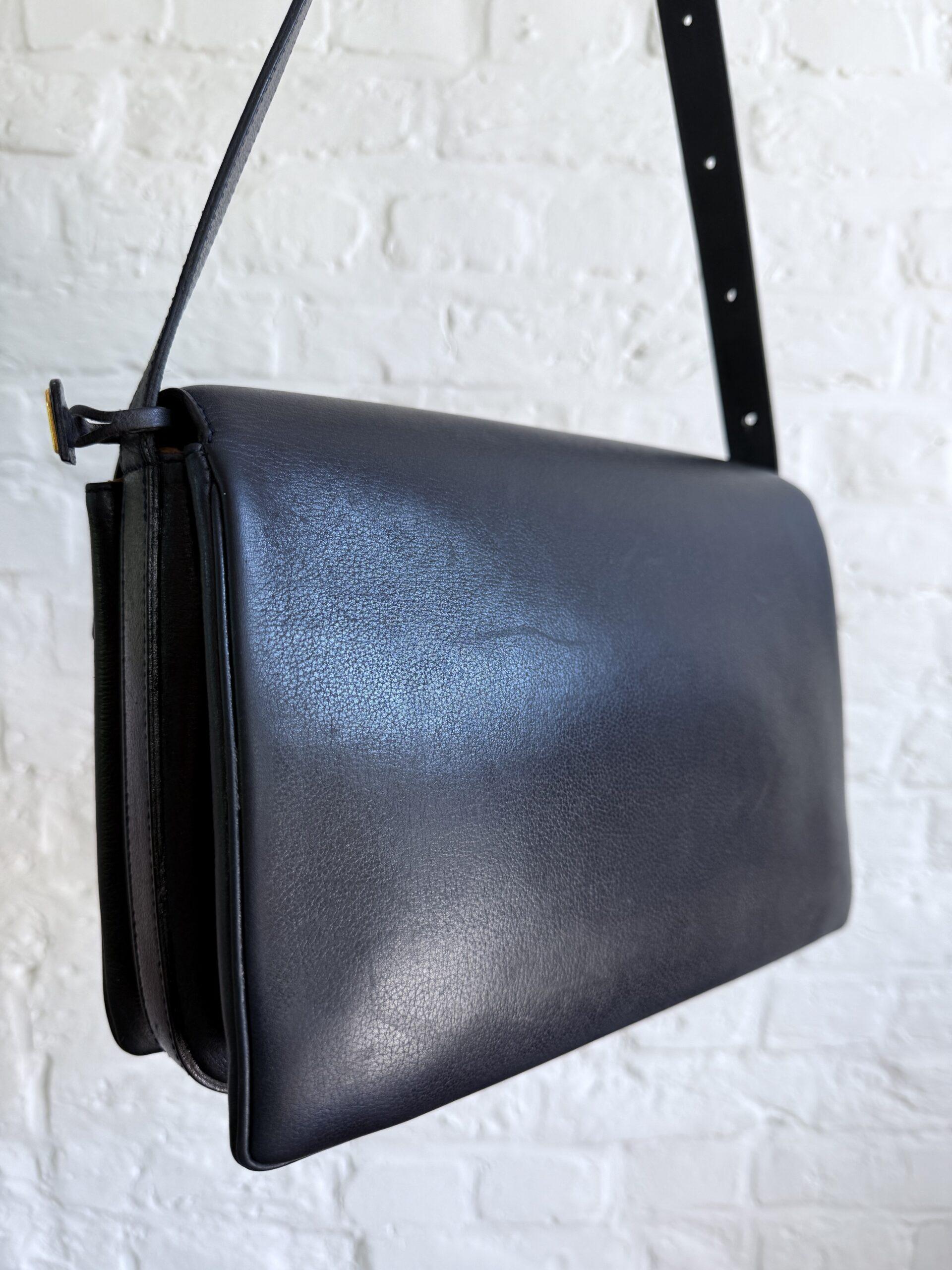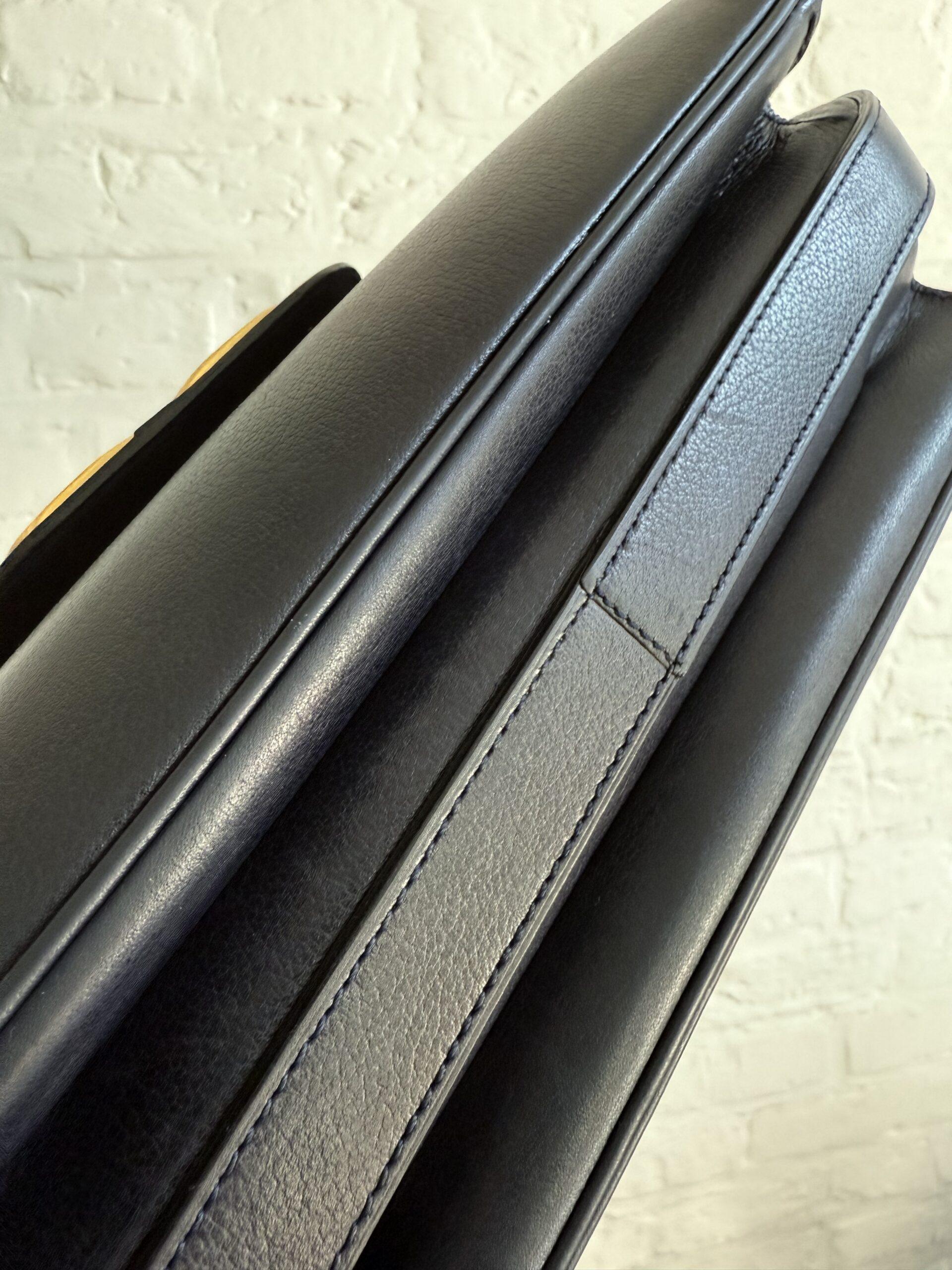 Deze uitvoering van de Bourgogne (of soortgelijk) is buitengewoon knap. In marine jumping calf, met de iconische vintage gesp en met de typische dubbele D op de sluiting.