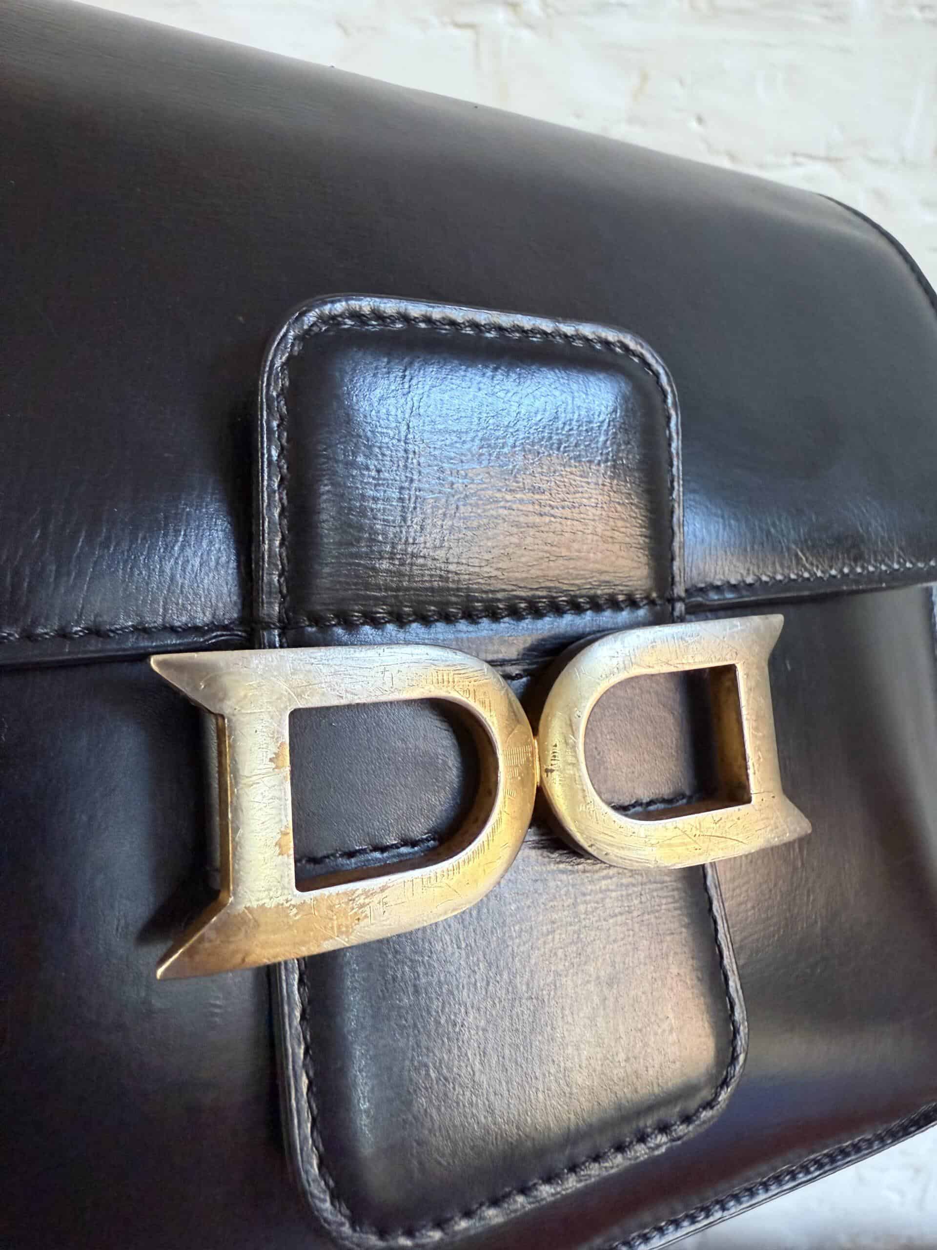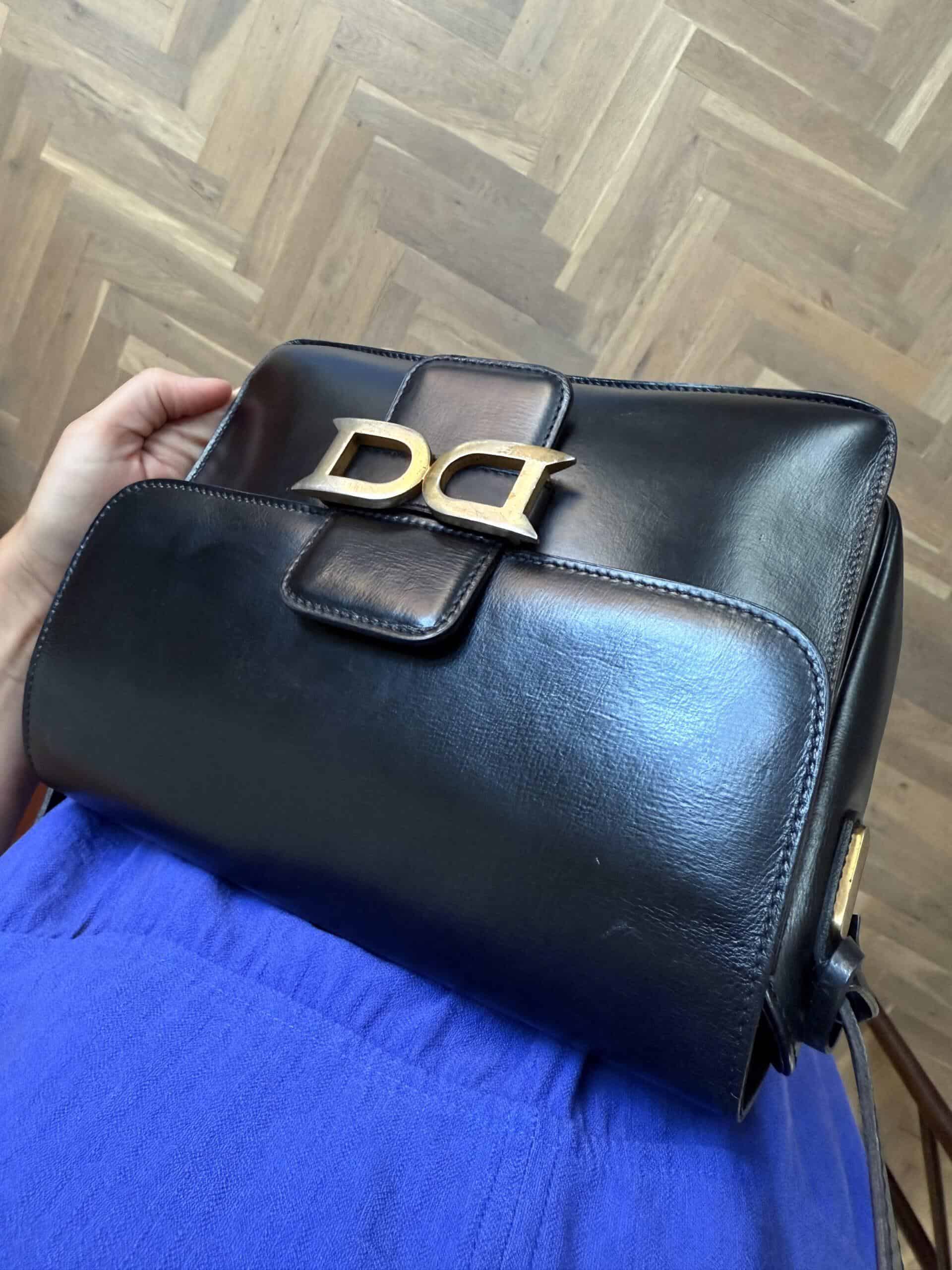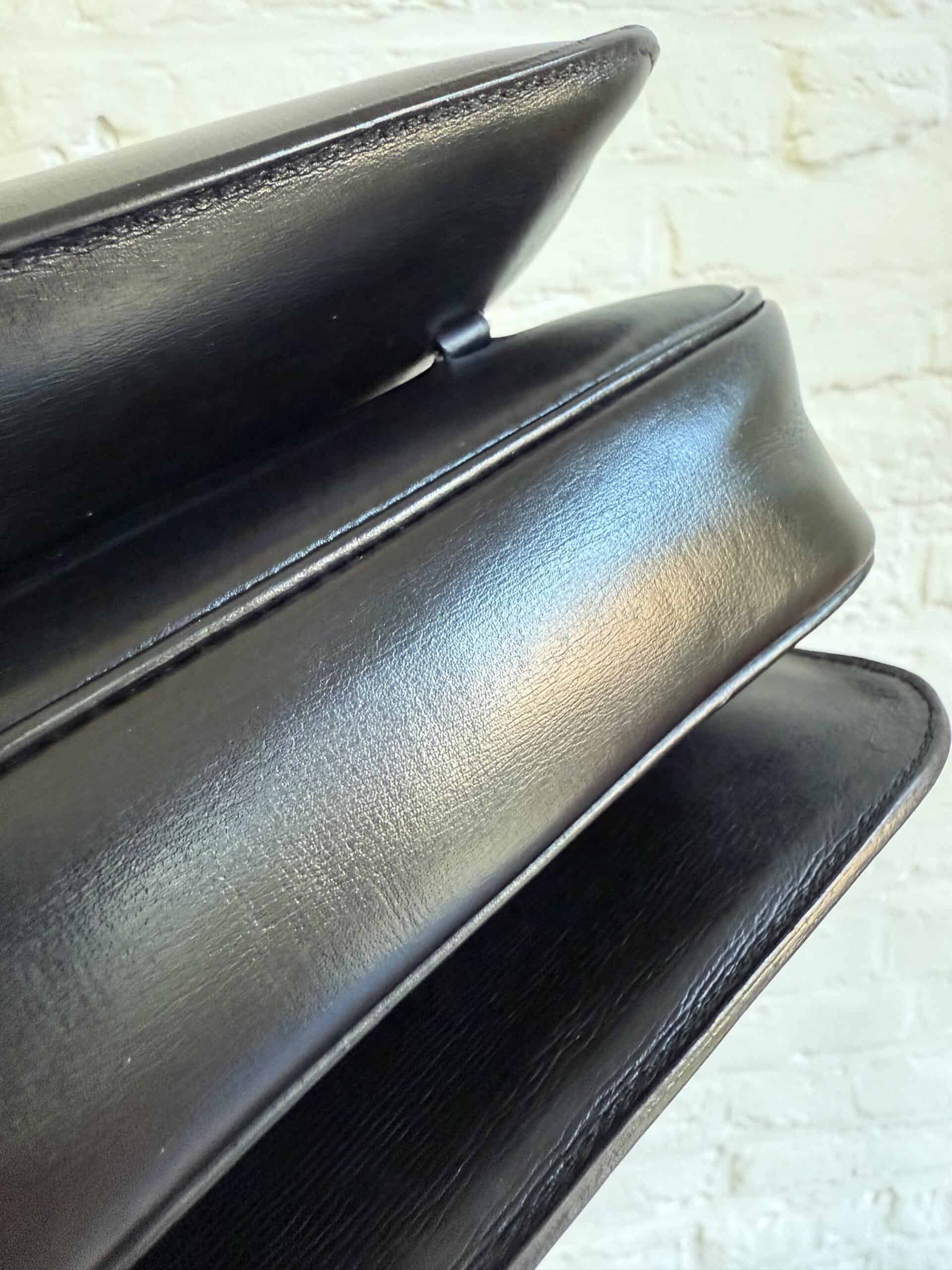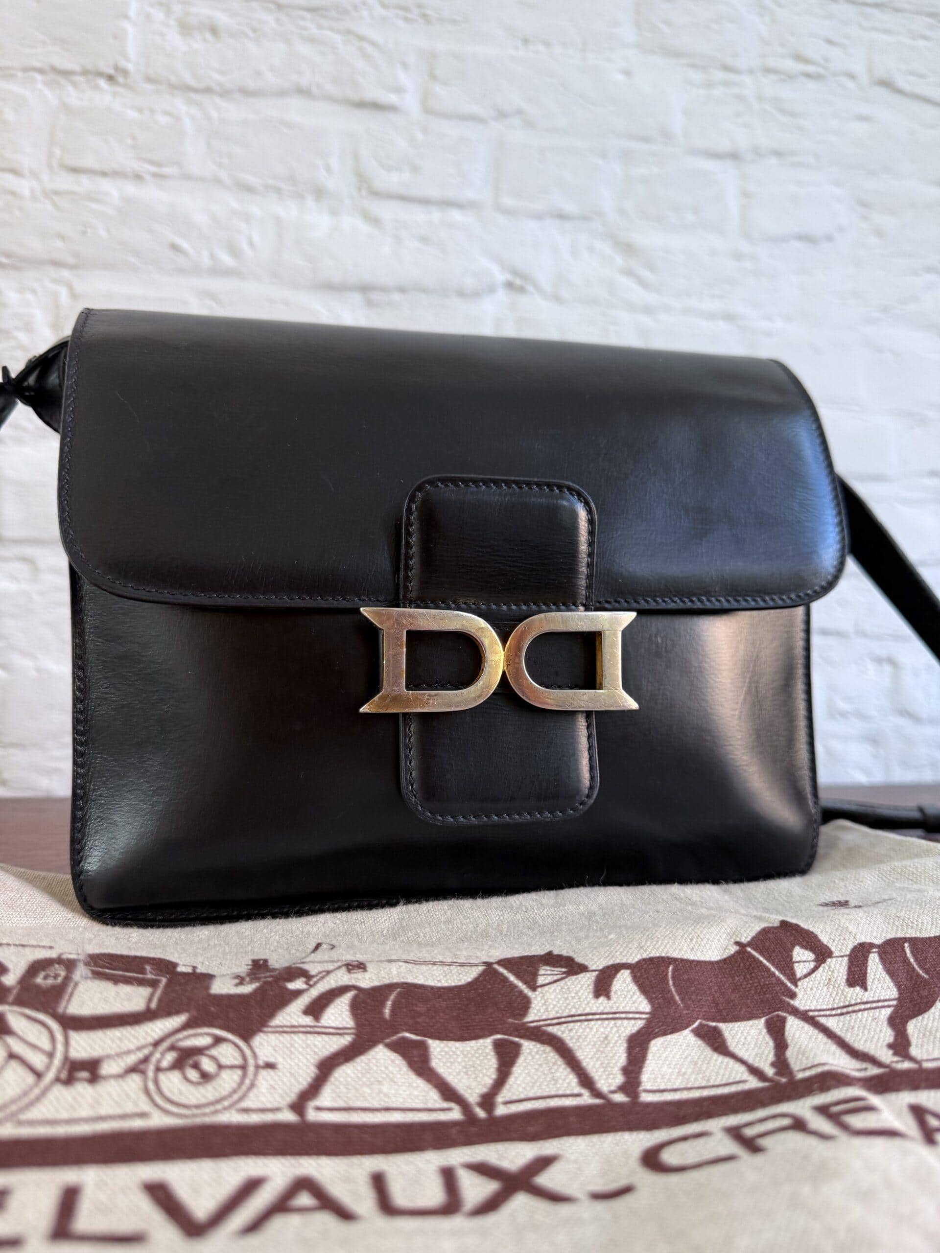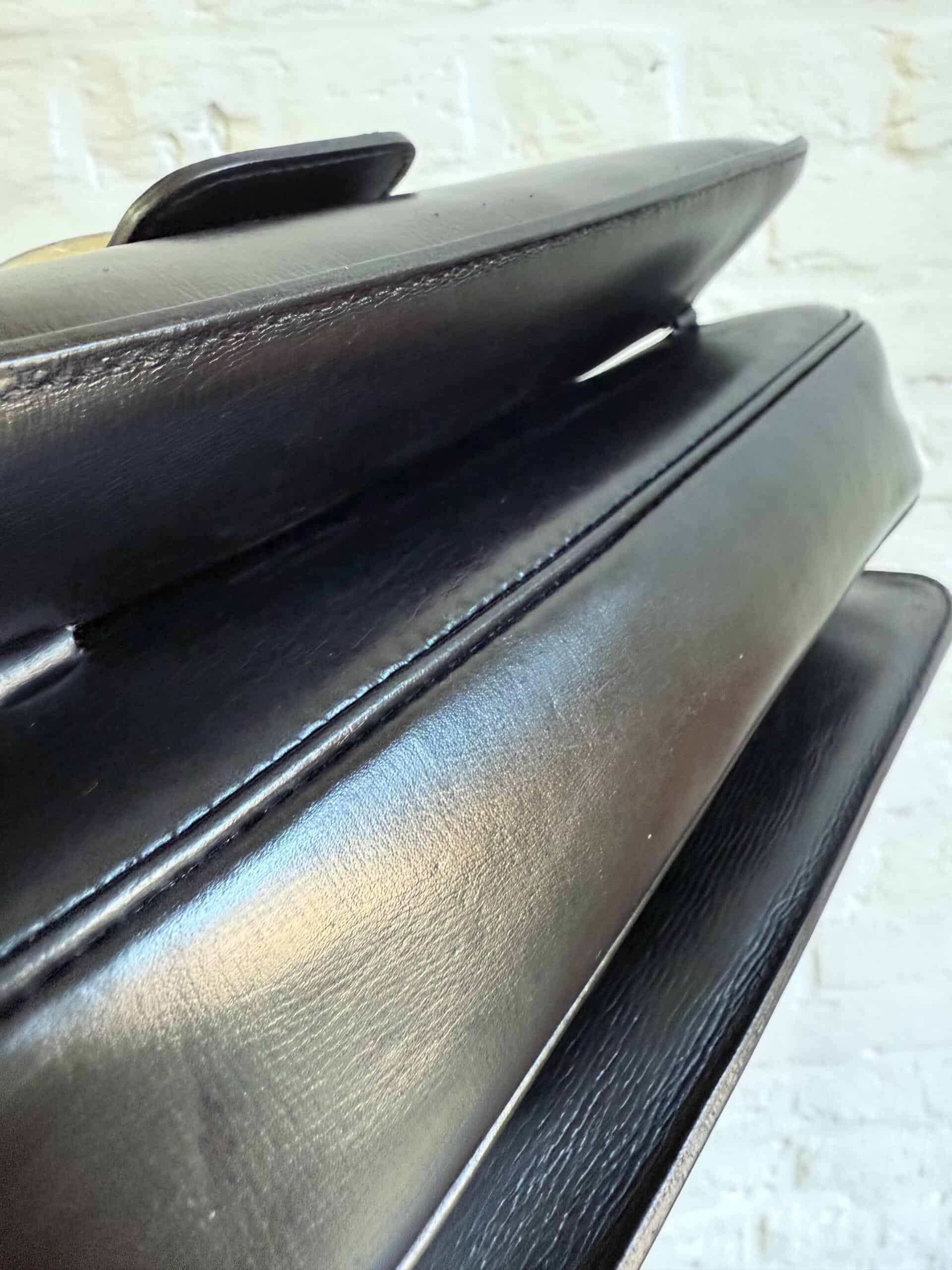 Deze uitvoering van de Bourgogne is buitengewoon knap. In zwarte jumping calf, met de iconische vintage gesp en met de typische dubbele D op de sluiting, in het goud.