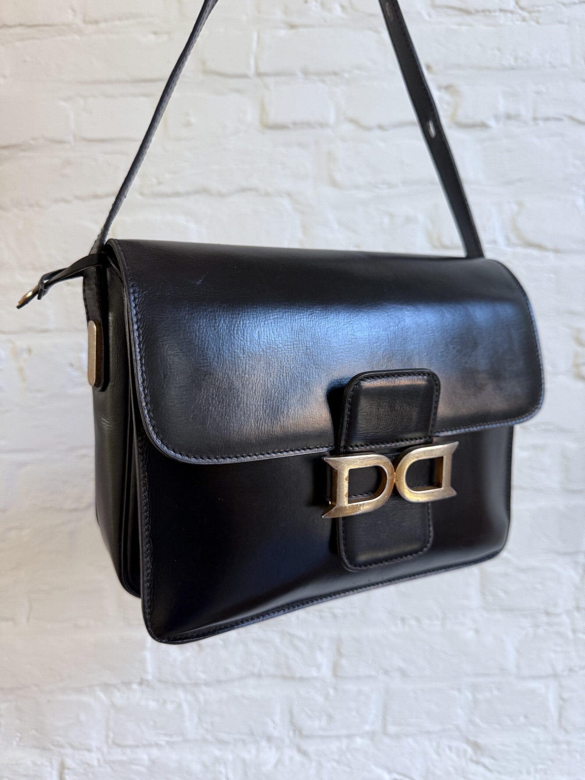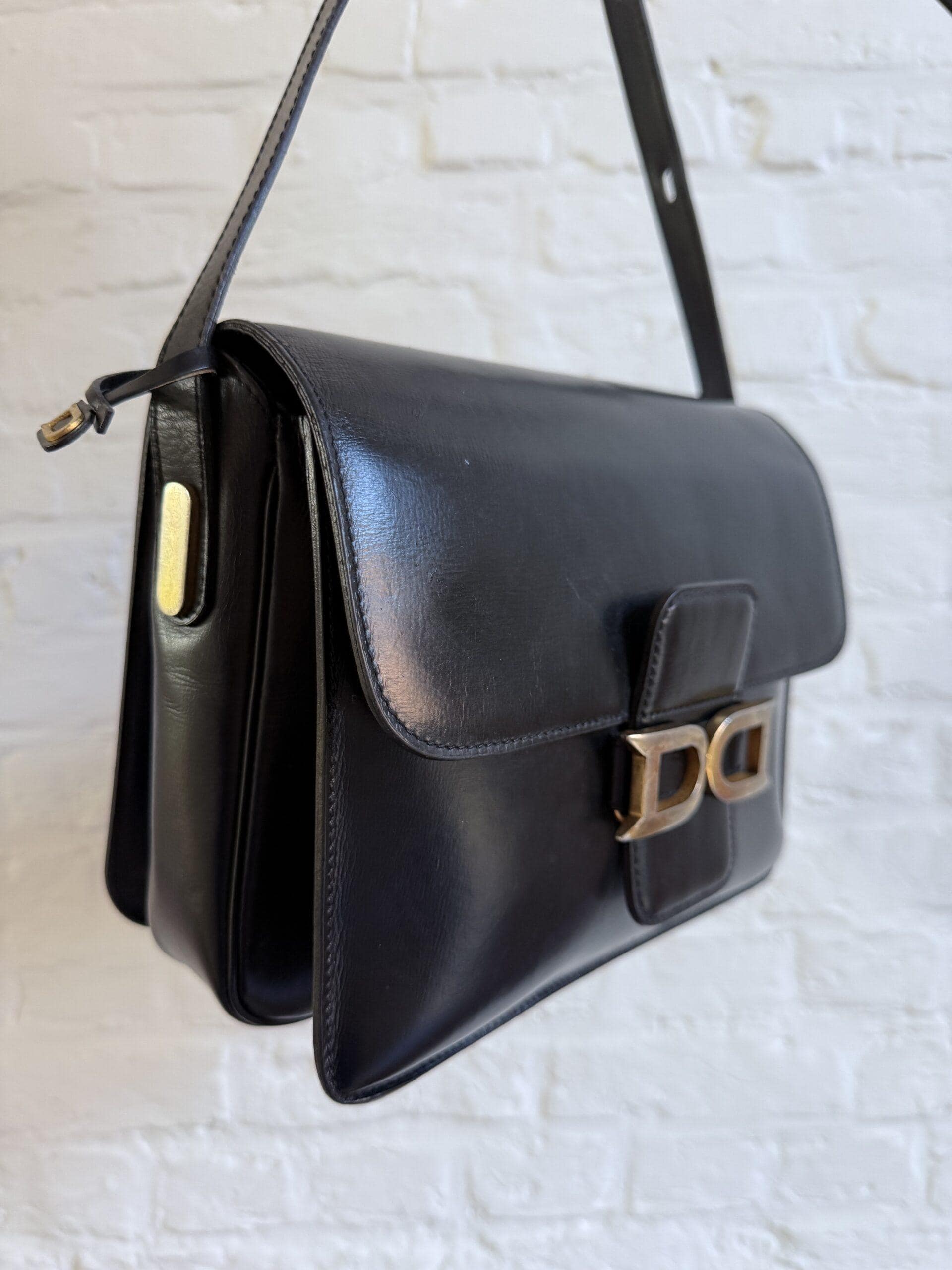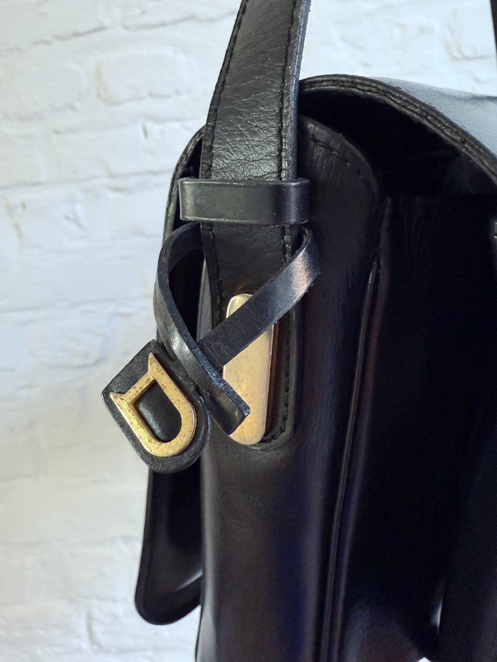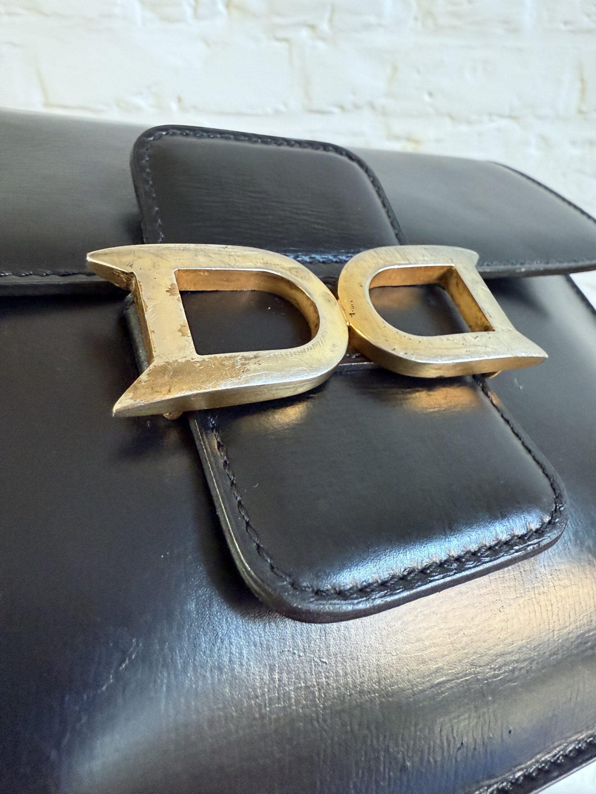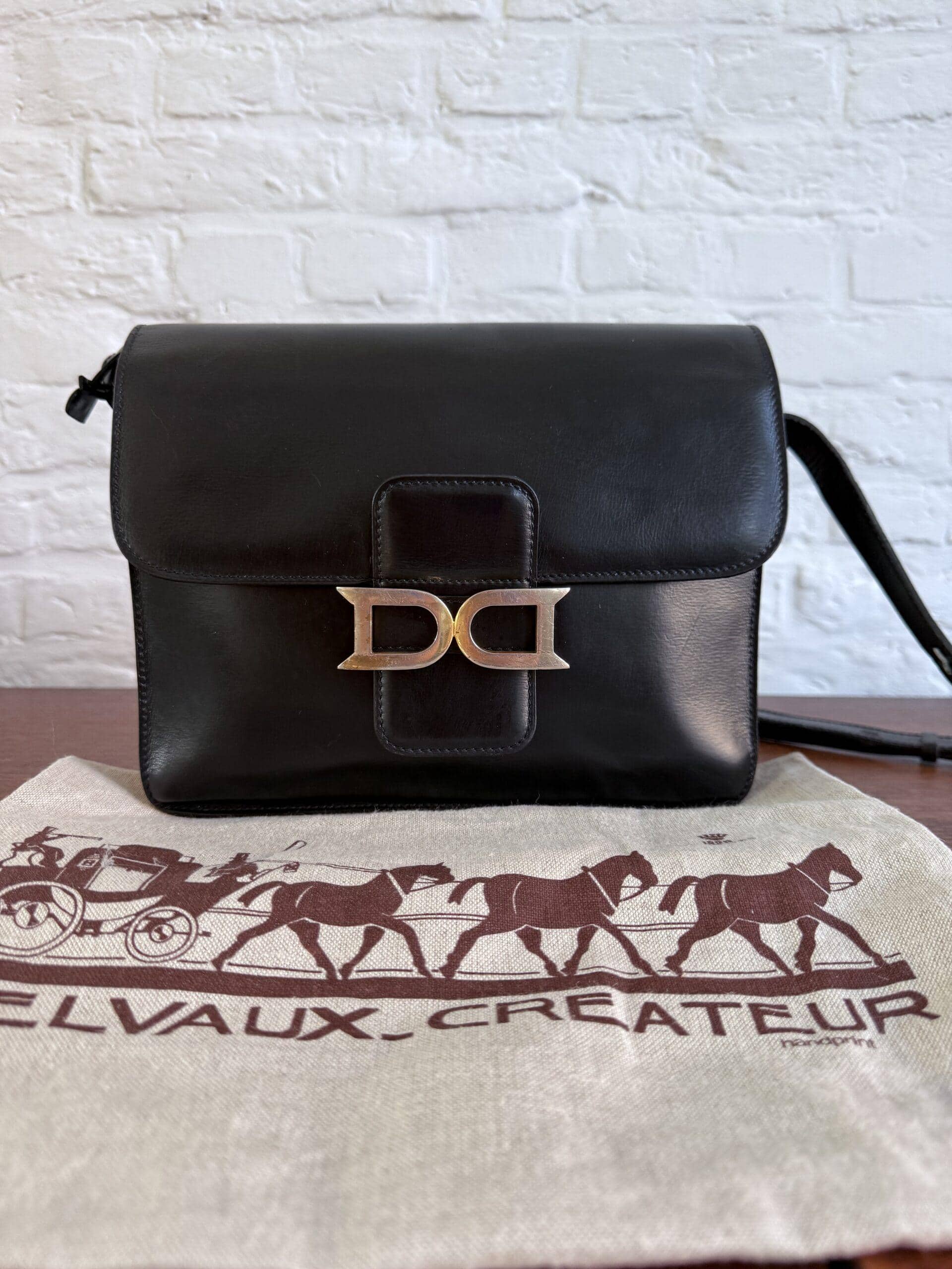 Deze uitvoering van de Bourgogne is buitengewoon knap. In zwarte jumping calf, met de iconische vintage gesp en met de typische dubbele D op de sluiting, in het goud.