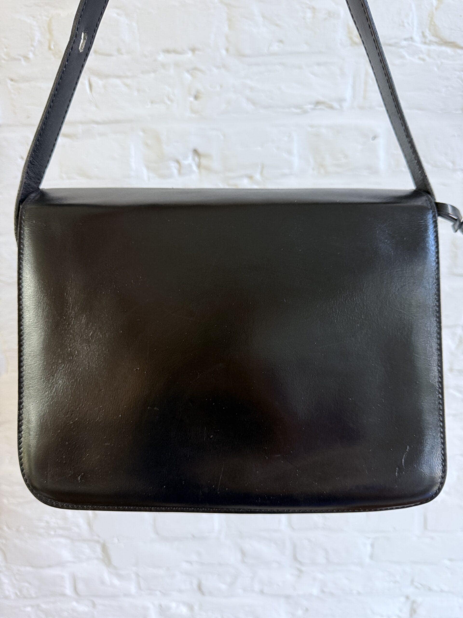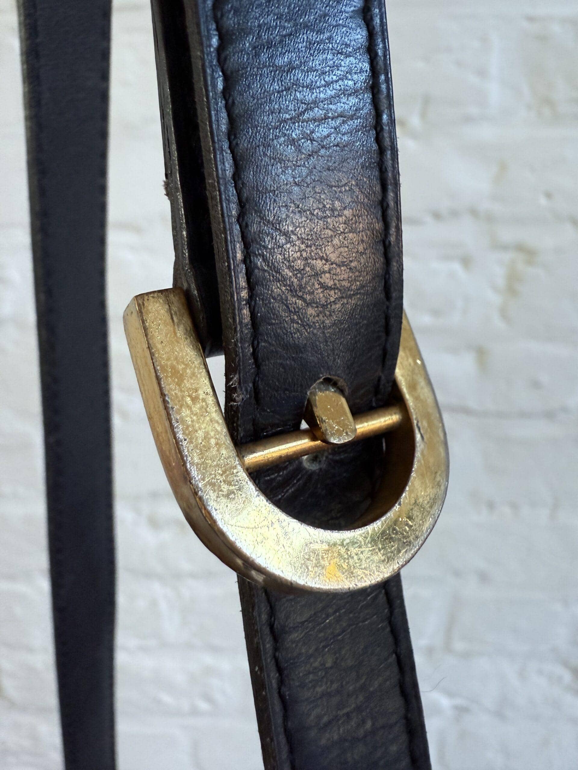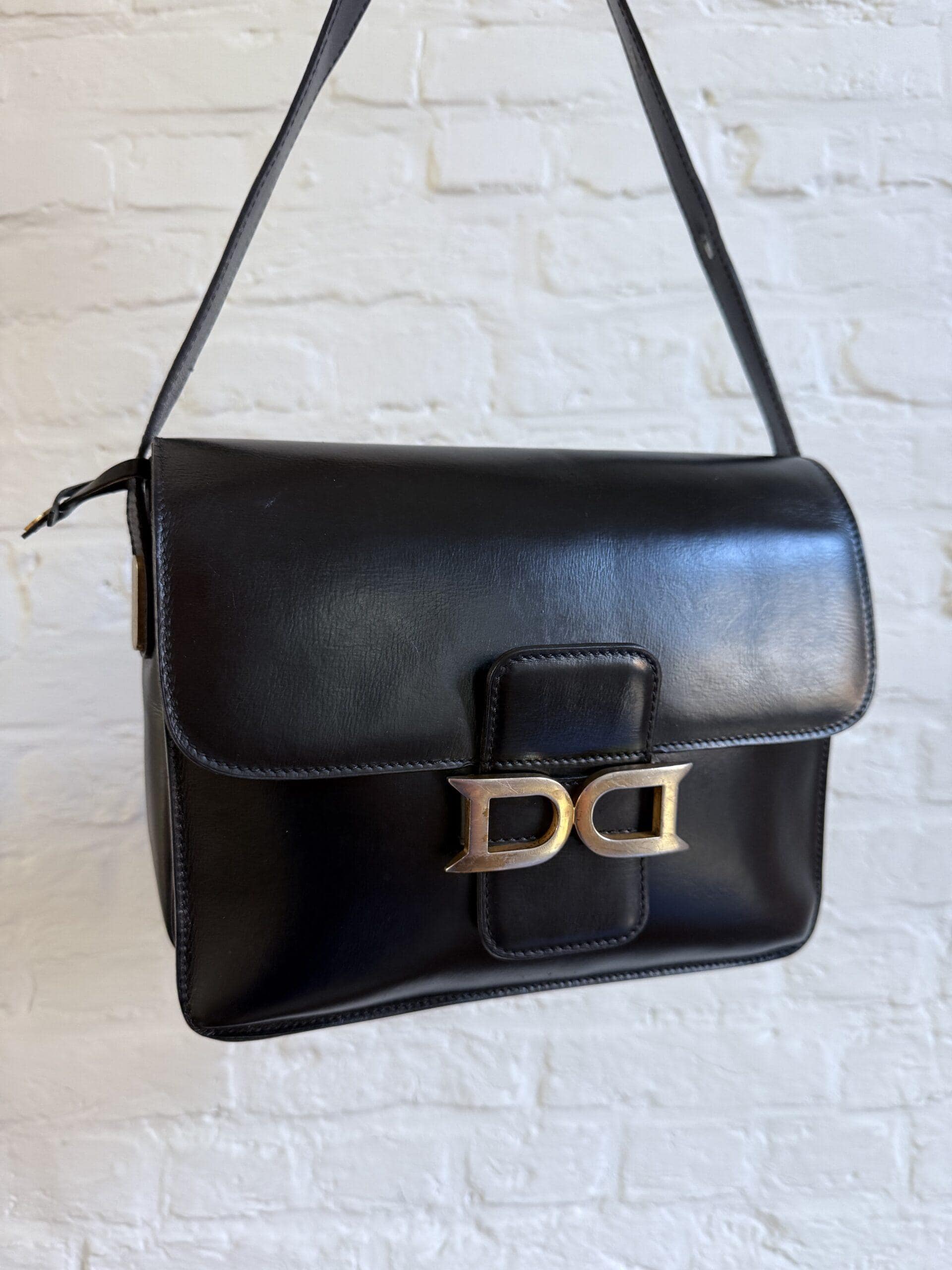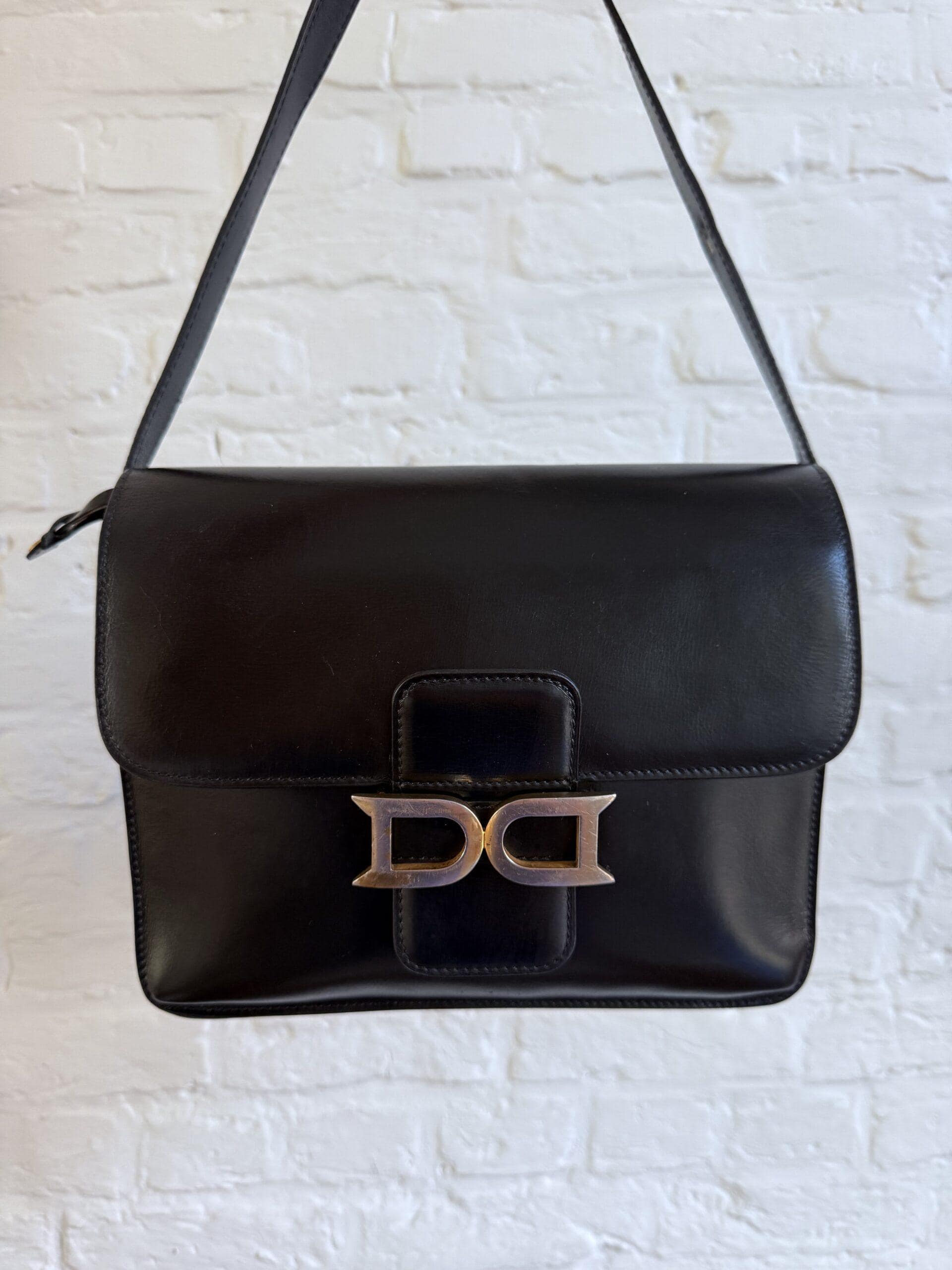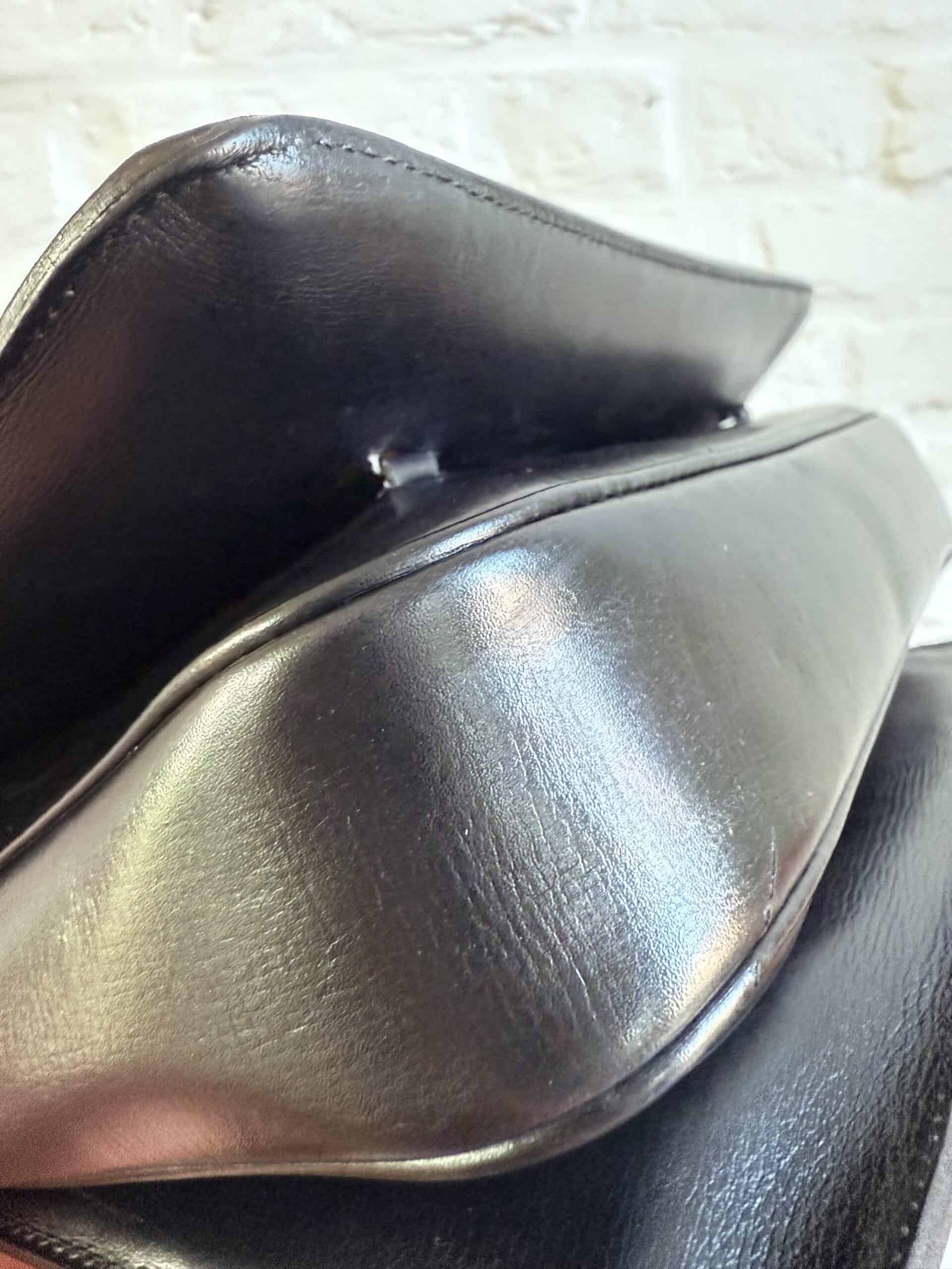 Deze uitvoering van de Bourgogne is buitengewoon knap. In zwarte jumping calf, met de iconische vintage gesp en met de typische dubbele D op de sluiting, in het goud.