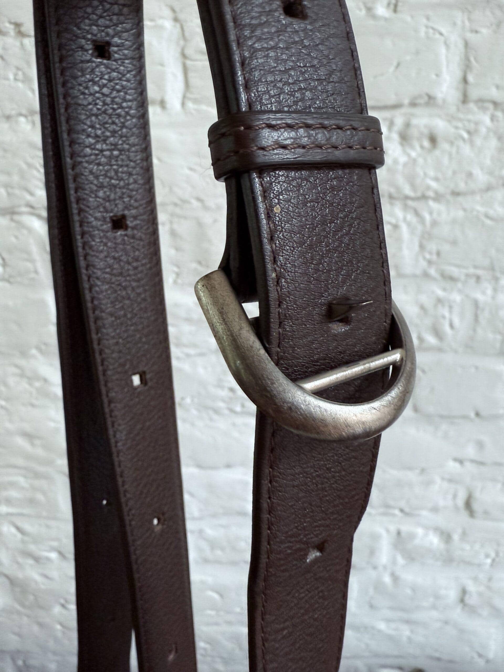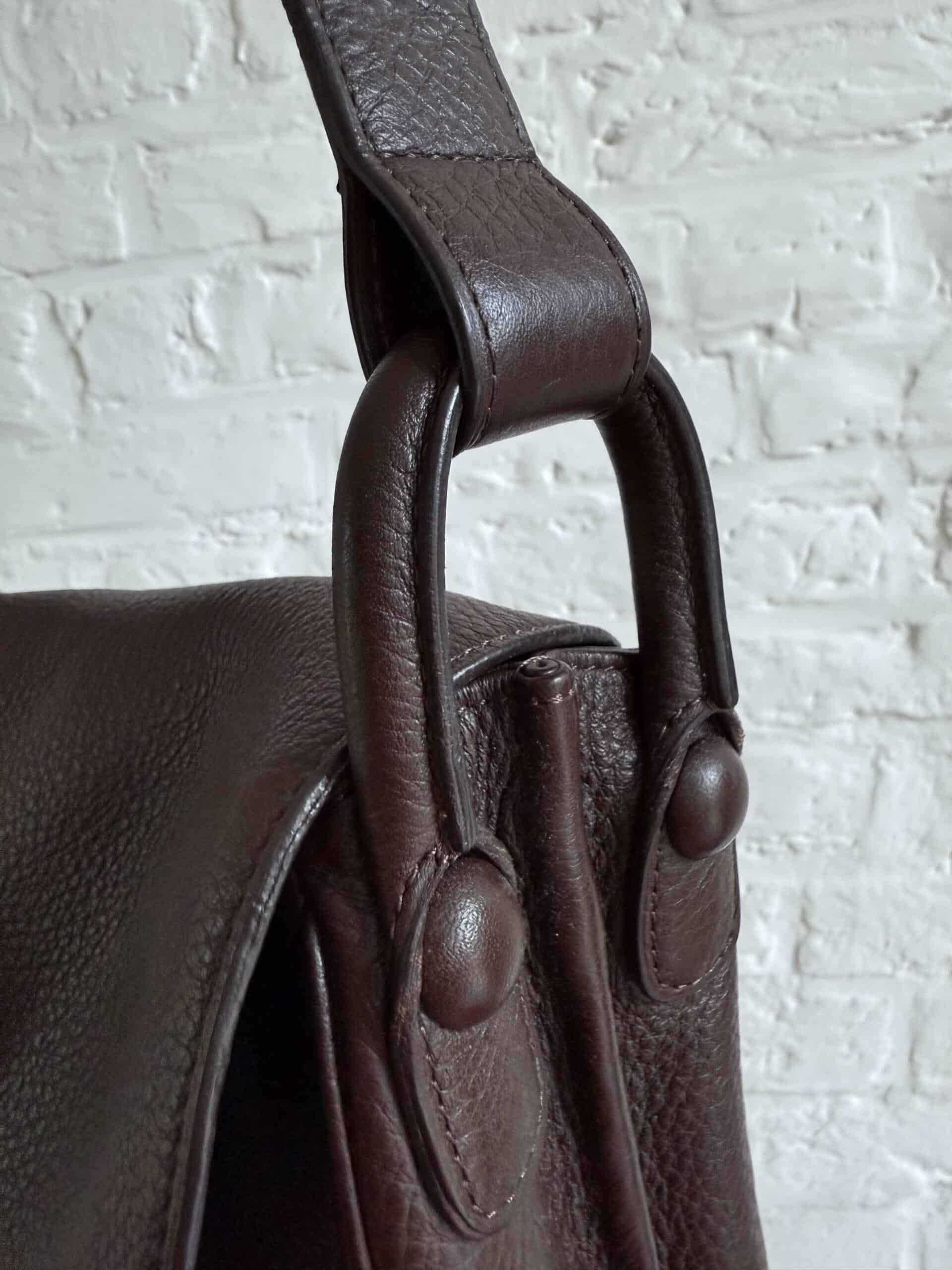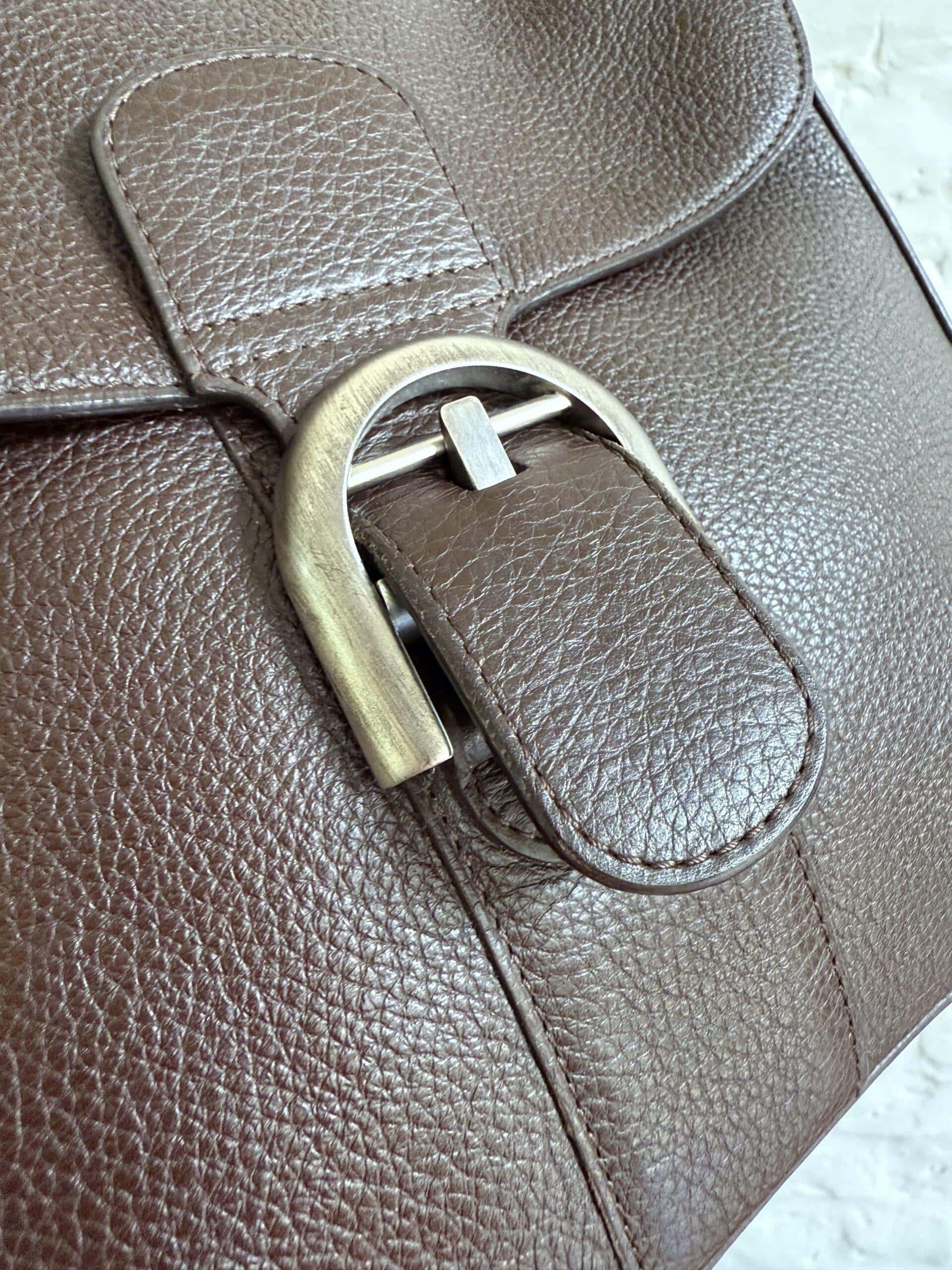 Hij is uitgevoerd in bruin stierenleder met geborstelde zilverkleurige boekel. Het interieur bestaat uit 2 compartimenten in bleke boxcalf. De riem is verstelbaar dankzij de iconische gesp.