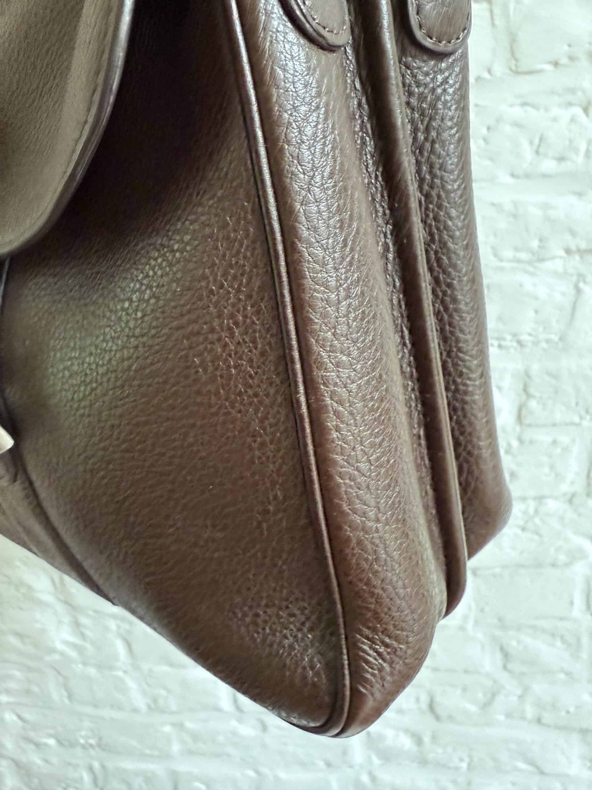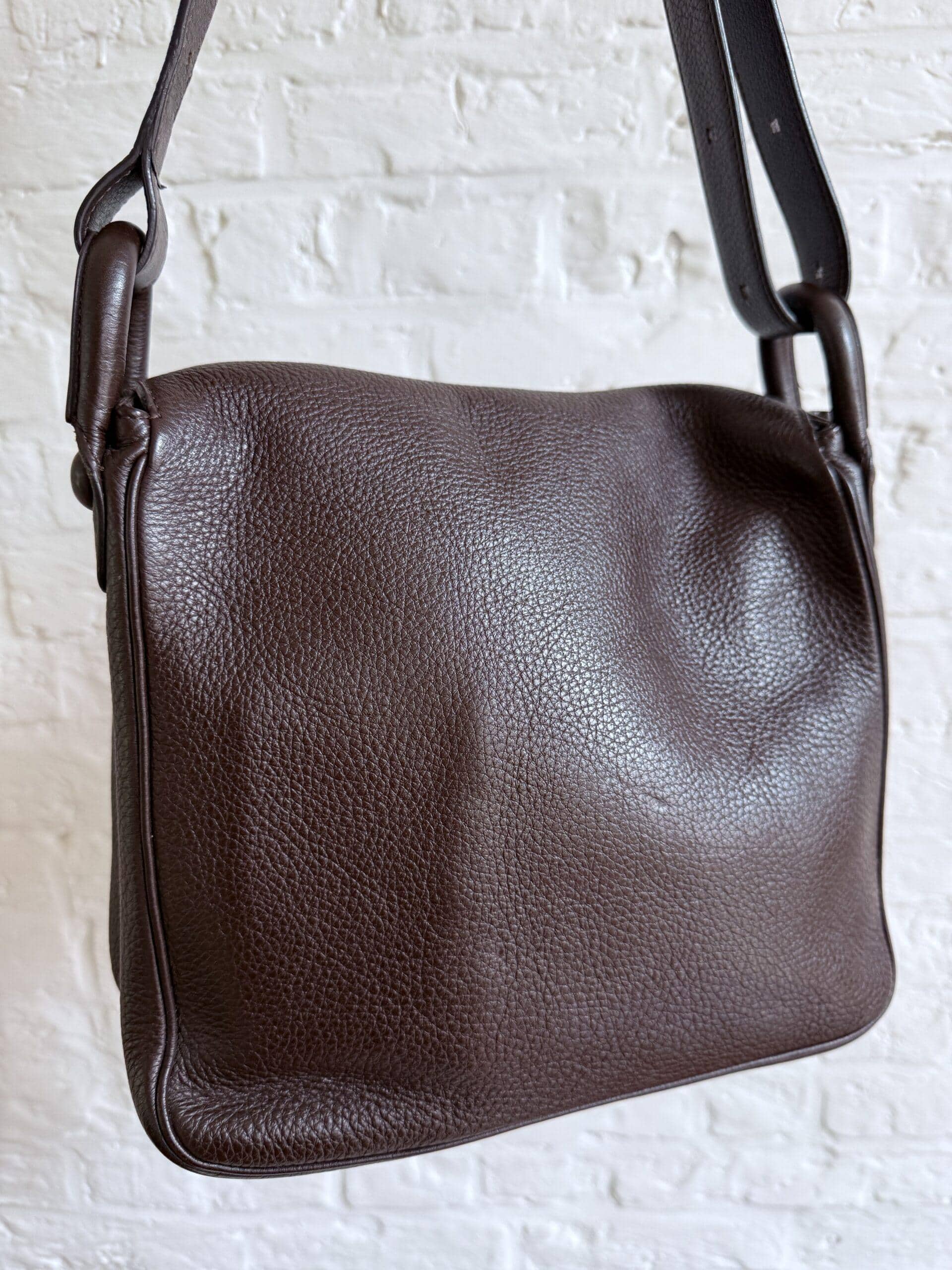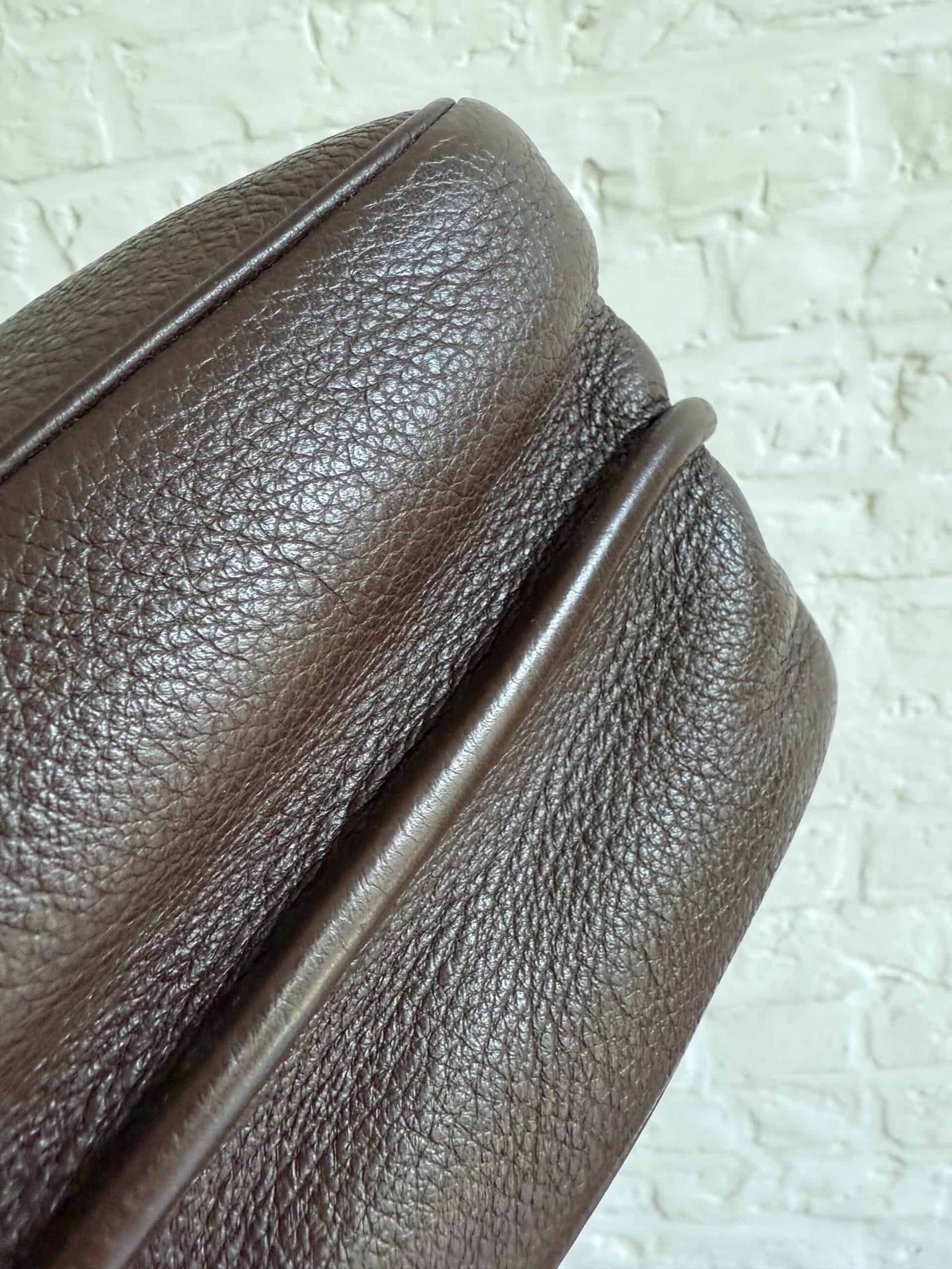 Hij is uitgevoerd in bruin stierenleder met geborstelde zilverkleurige boekel. Het interieur bestaat uit 2 compartimenten in bleke boxcalf. De riem is verstelbaar dankzij de iconische gesp.