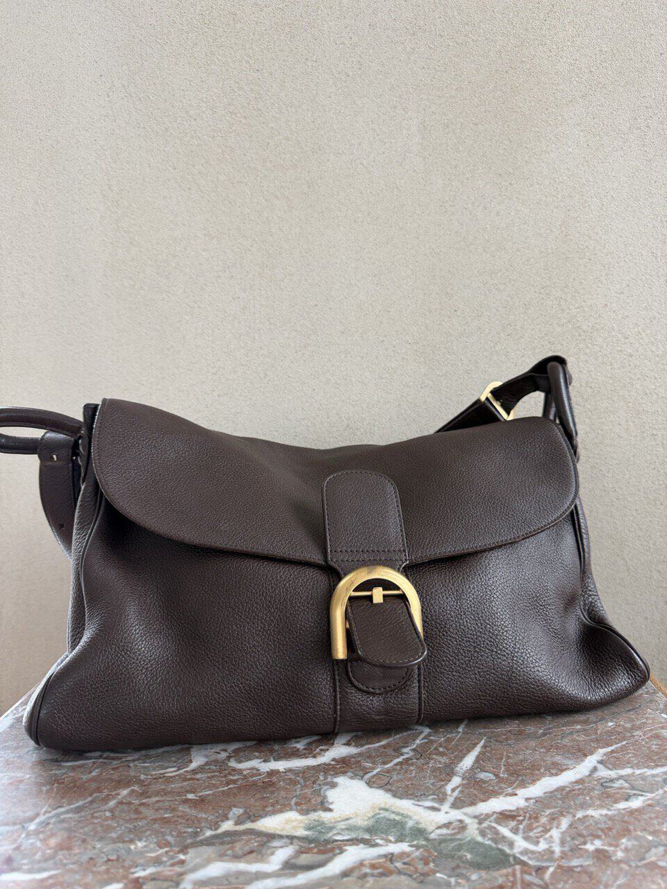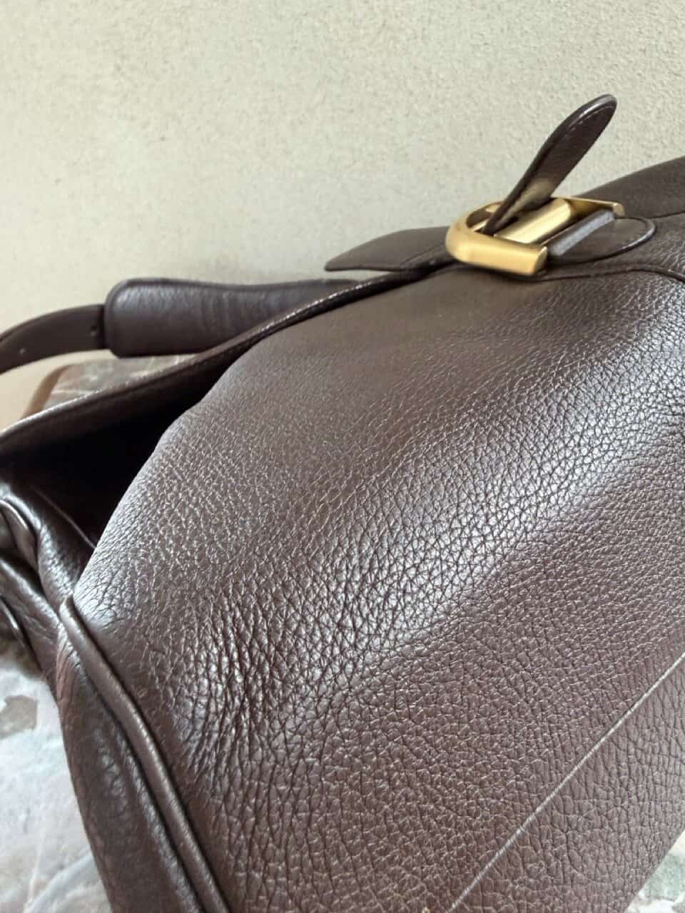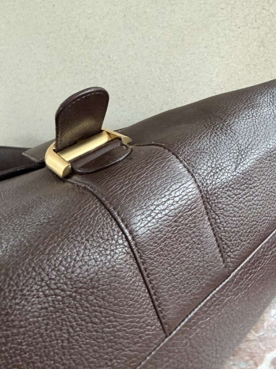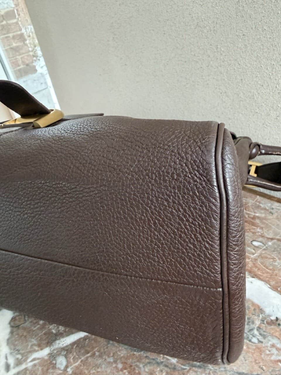 Het exterieur is uitgevoerd in bruine jumping calf. Het interieur is afgewerkt in bleke boxcalf en telt drie compartimenten waarvan eentje met rits. De boekel is in geborsteld gouden hardware en vertoont hier en daar wat gebruikssporen. De binnenzijde vertoont wel duidelijke gebruikssporen.