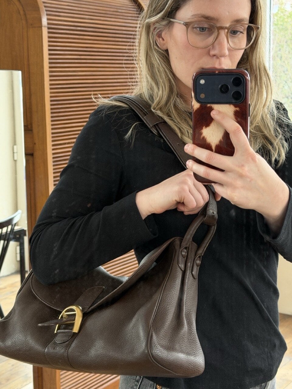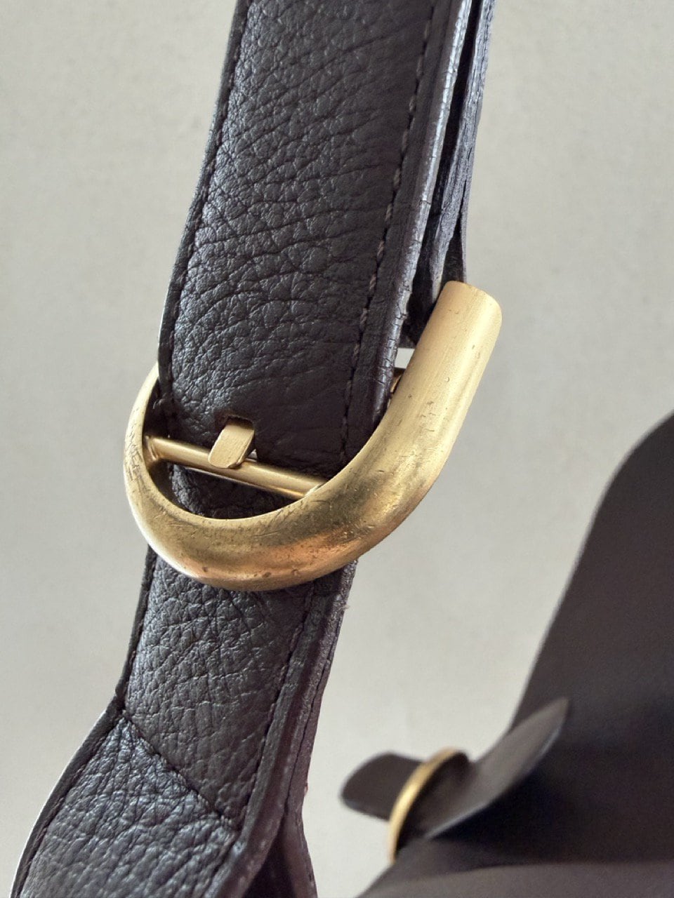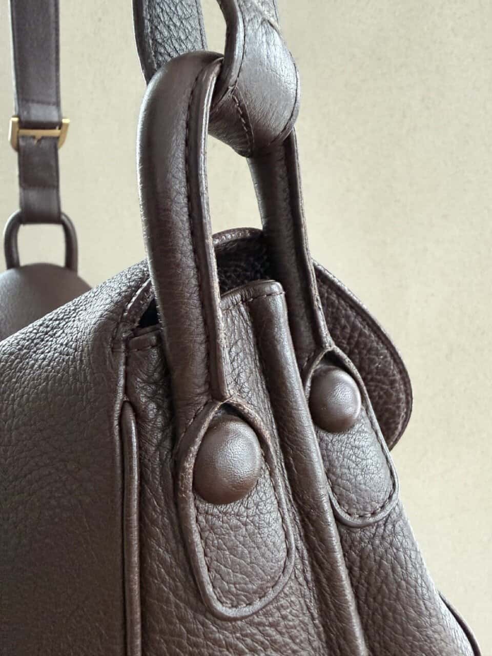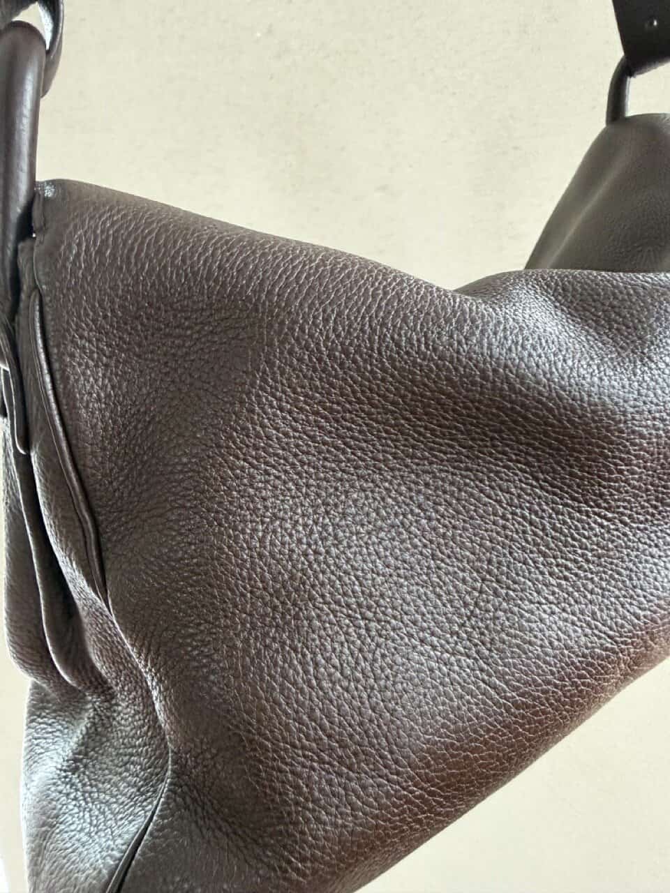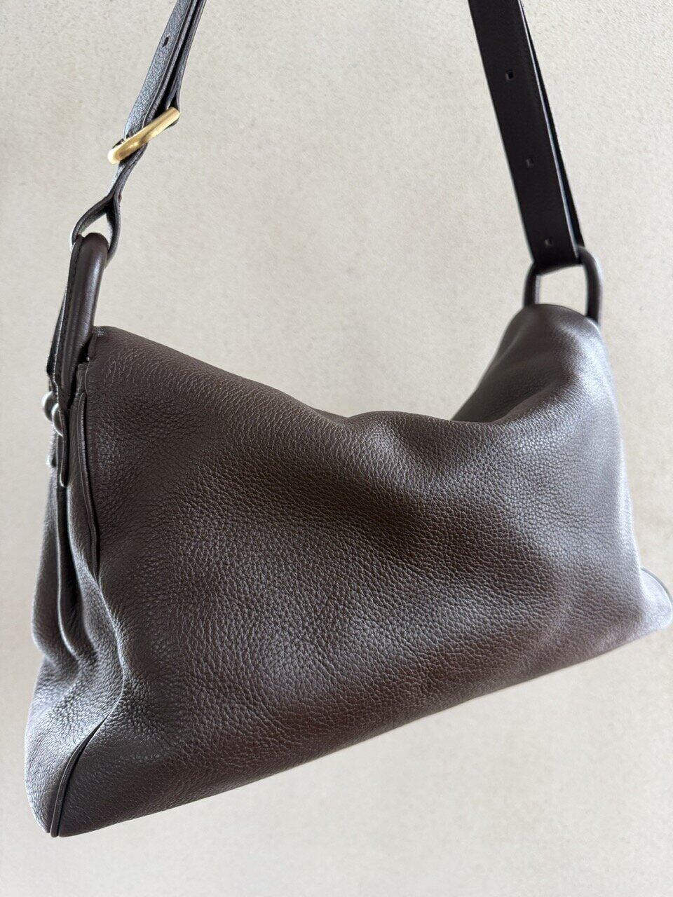 Het exterieur is uitgevoerd in bruine jumping calf. Het interieur is afgewerkt in bleke boxcalf en telt drie compartimenten waarvan eentje met rits. De boekel is in geborsteld gouden hardware en vertoont hier en daar wat gebruikssporen. De binnenzijde vertoont wel duidelijke gebruikssporen.
