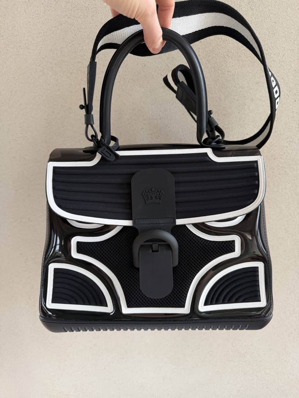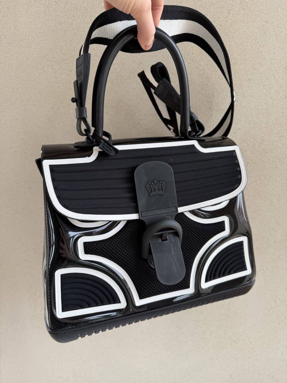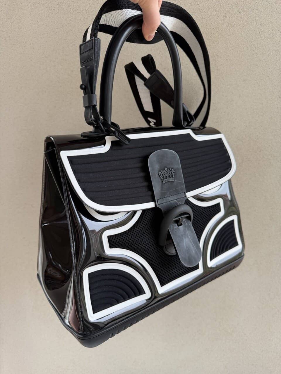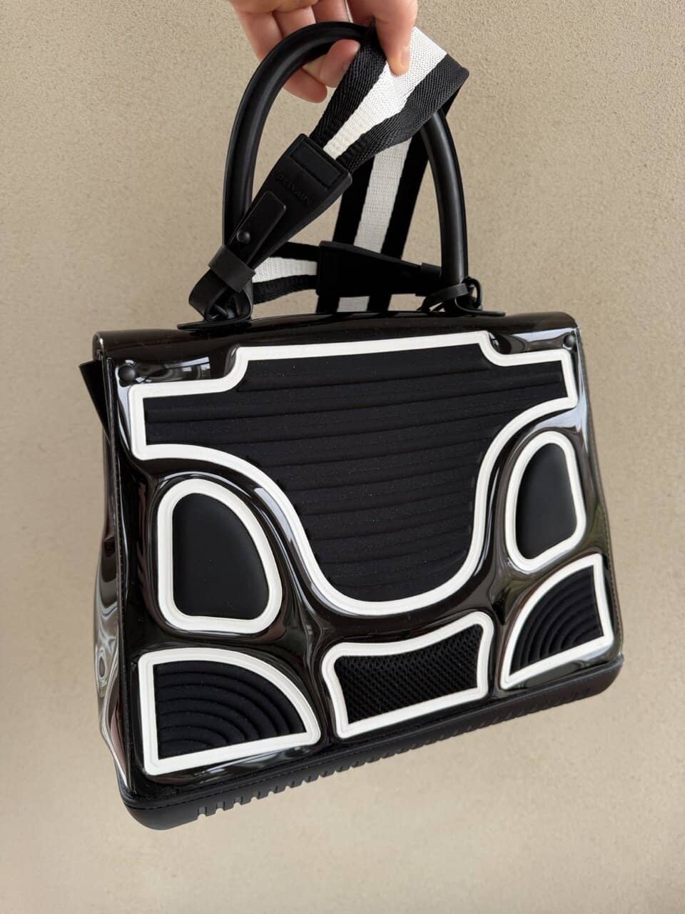 De contrasterende uitvoering in zwart-wit maken van deze tas een waar statement piece.