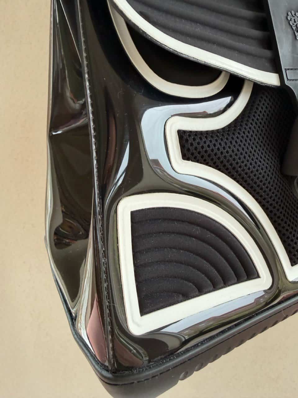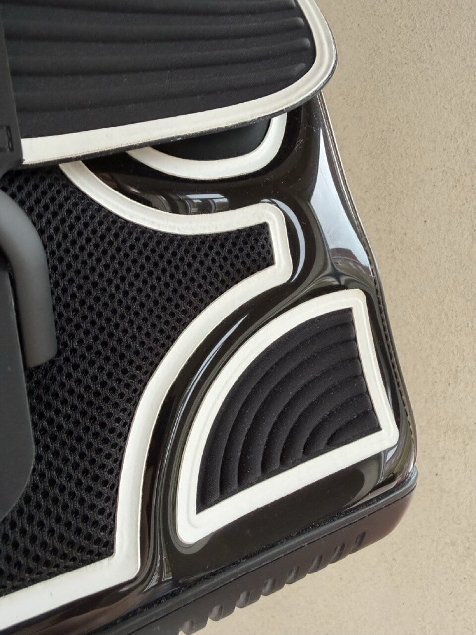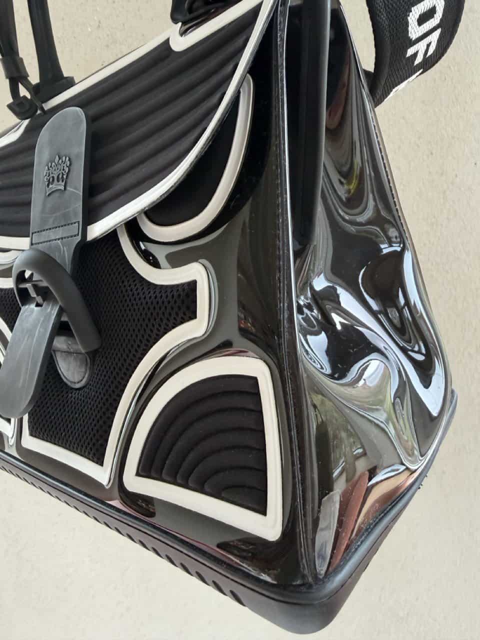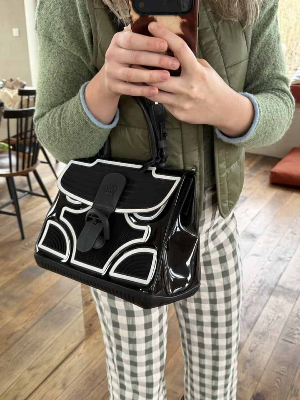 De contrasterende uitvoering in zwart-wit maken van deze tas een waar statement piece.