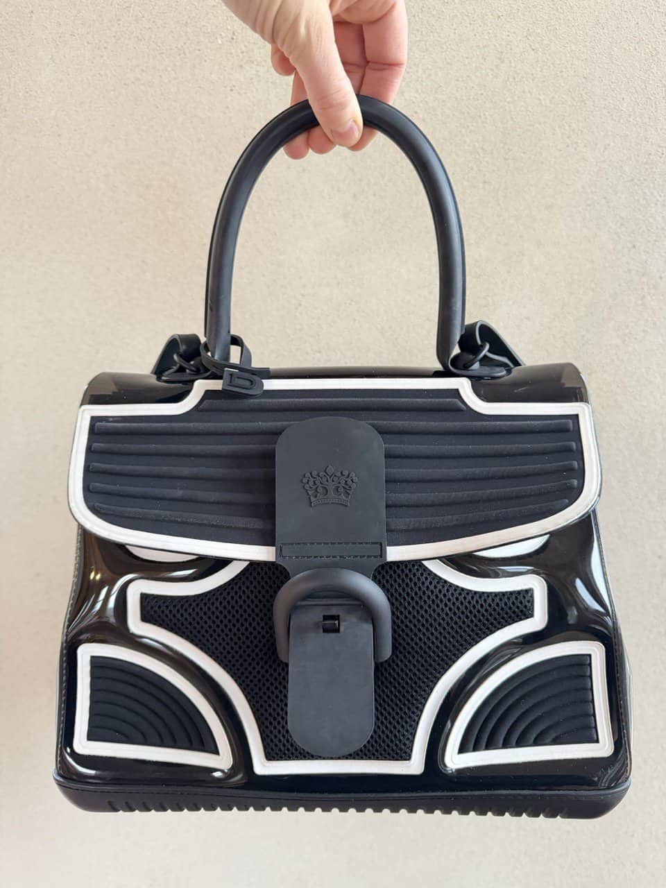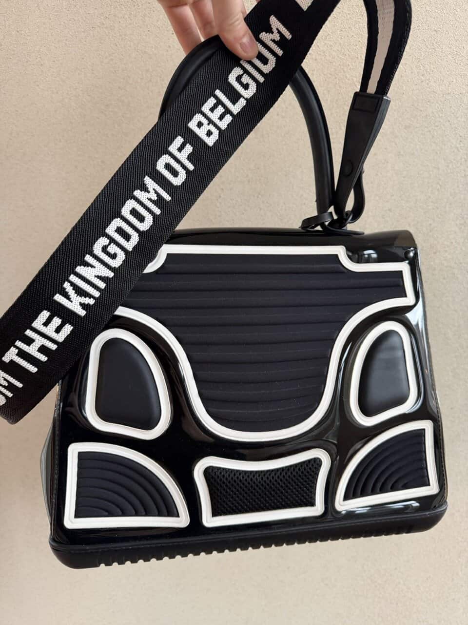 De contrasterende uitvoering in zwart-wit maken van deze tas een waar statement piece.