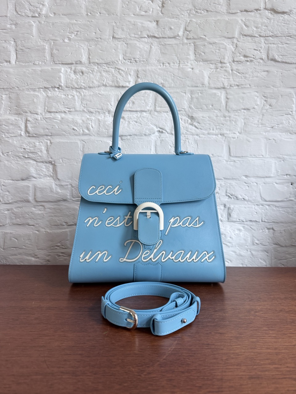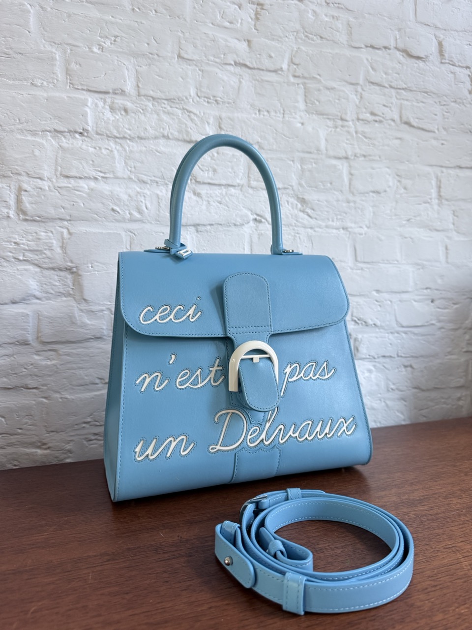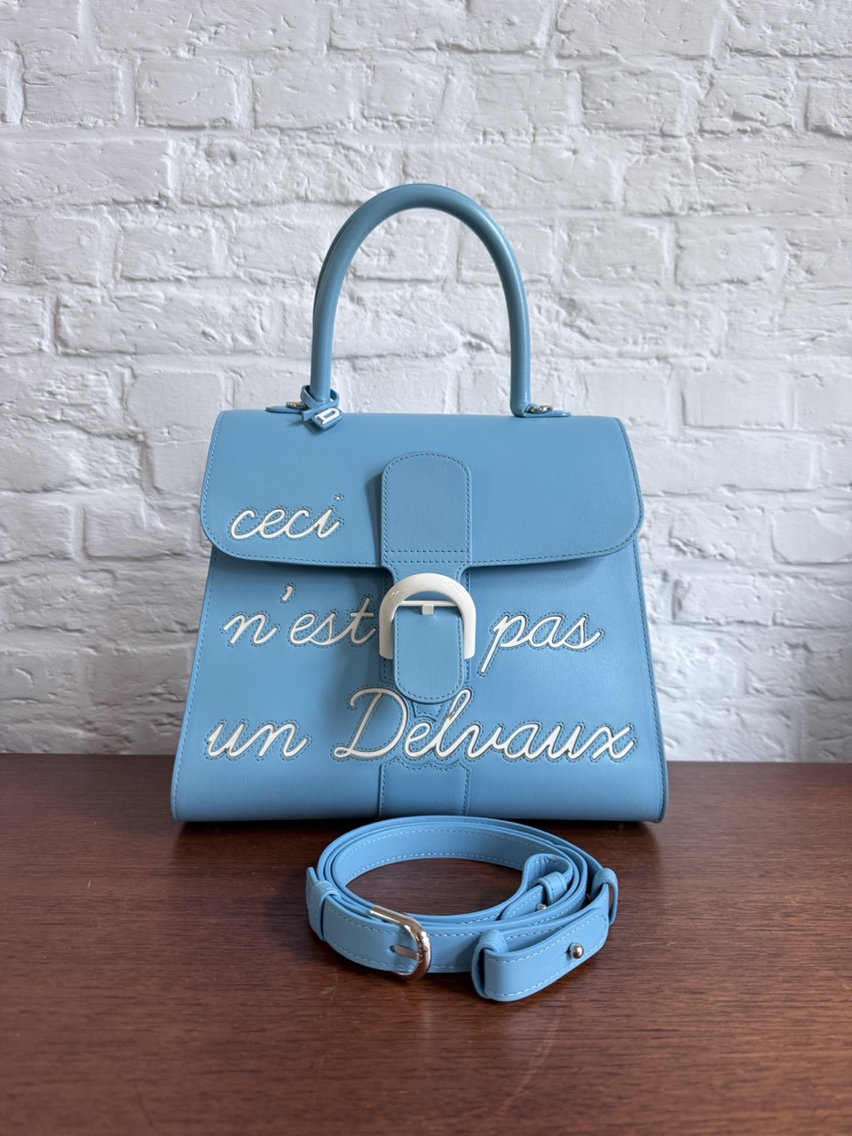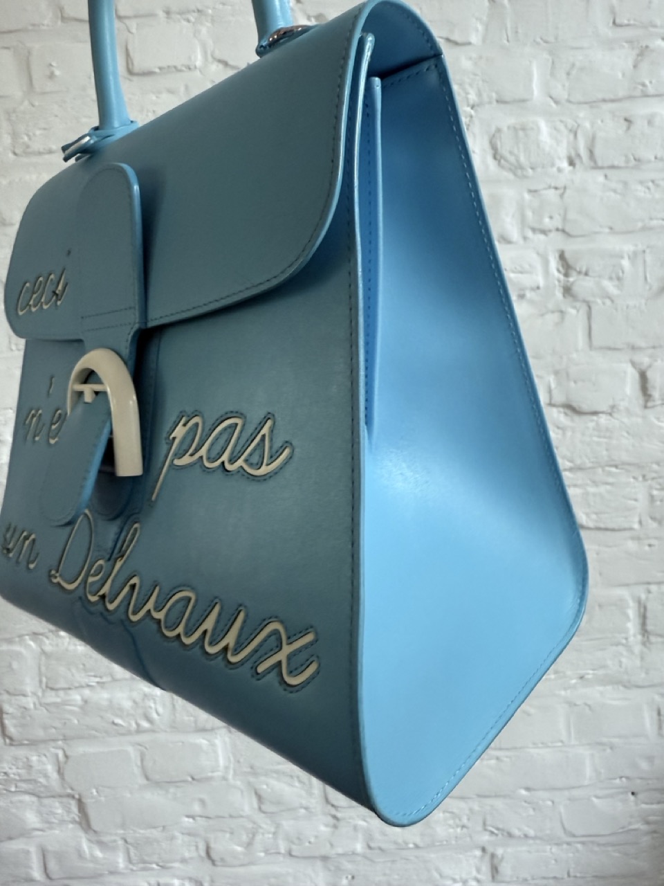 De Brillant is uitgevoerd in box calf Ciel en voorzien van het bekende opschrift ‘Ceci n’est pas un Delvaux’, een ludieke verwijzing naar het gekende citaat.