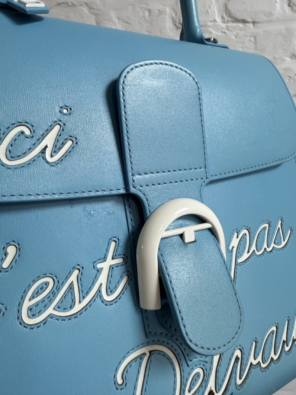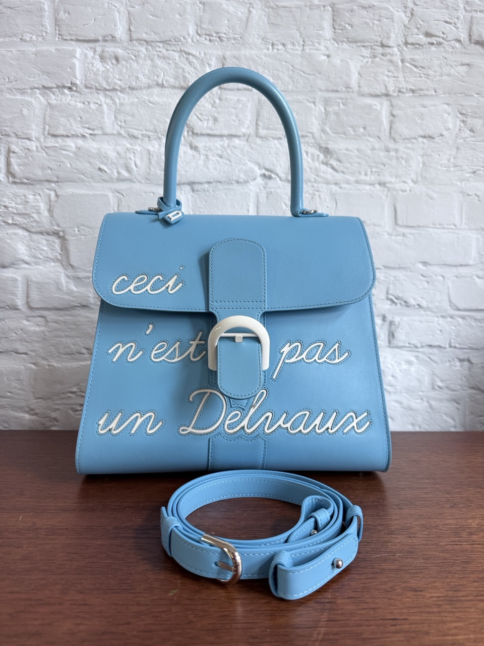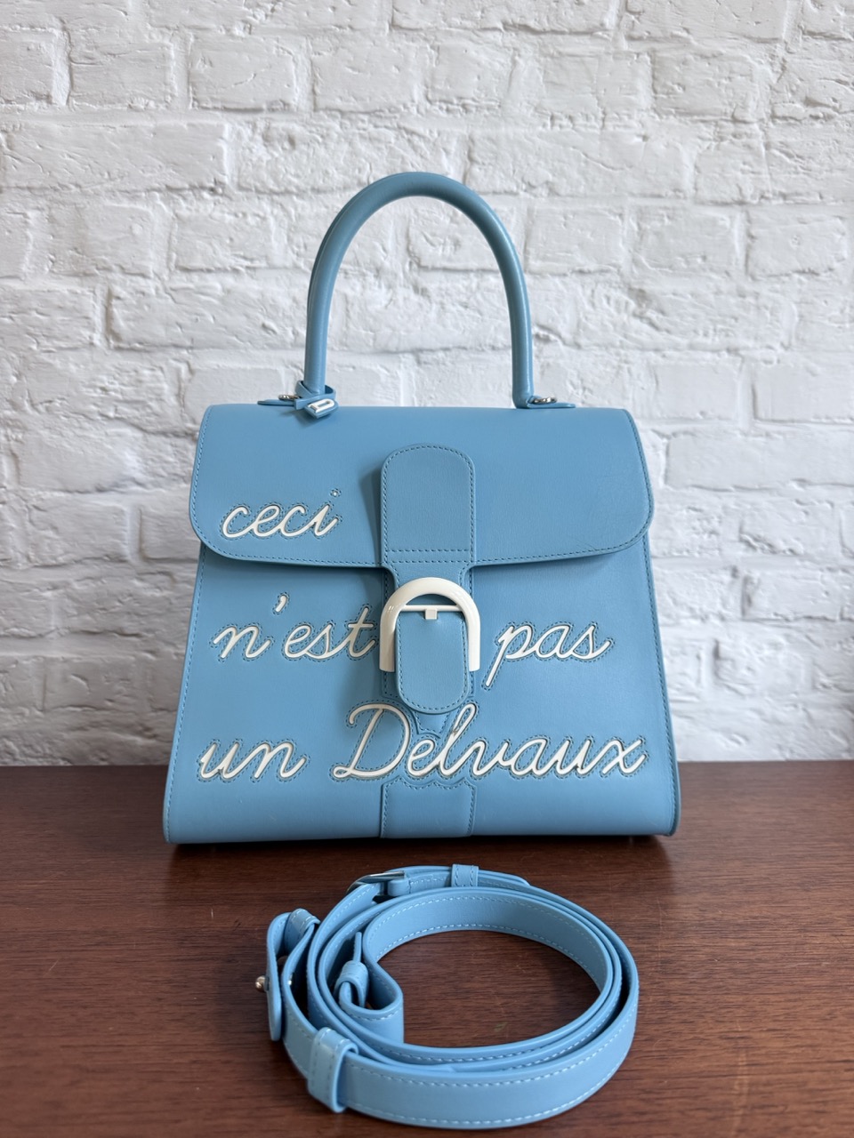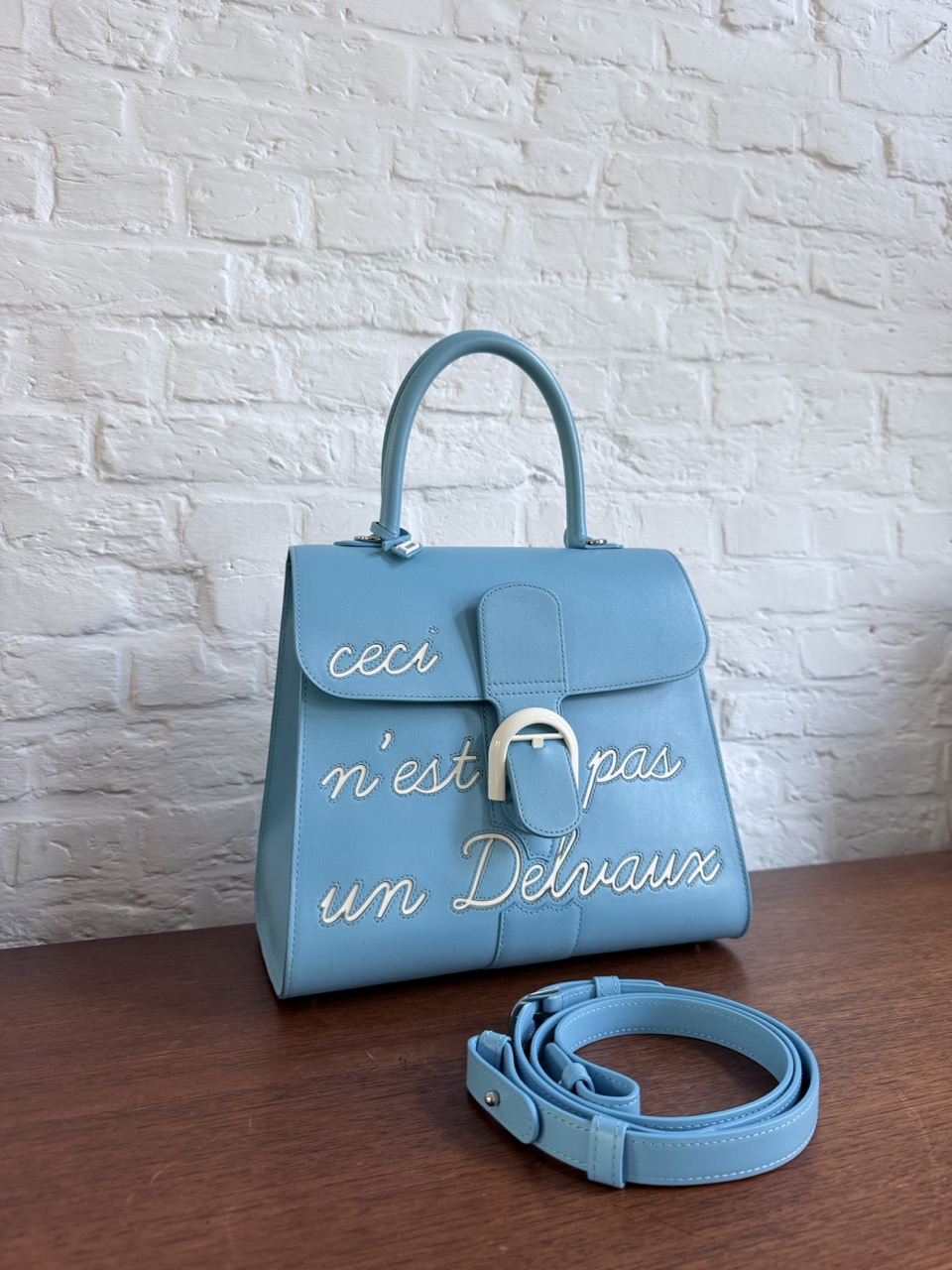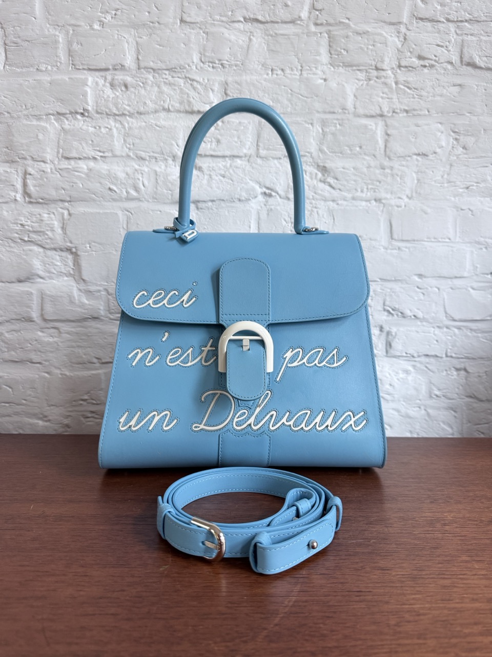 De Brillant is uitgevoerd in box calf Ciel en voorzien van het bekende opschrift ‘Ceci n’est pas un Delvaux’, een ludieke verwijzing naar het gekende citaat.