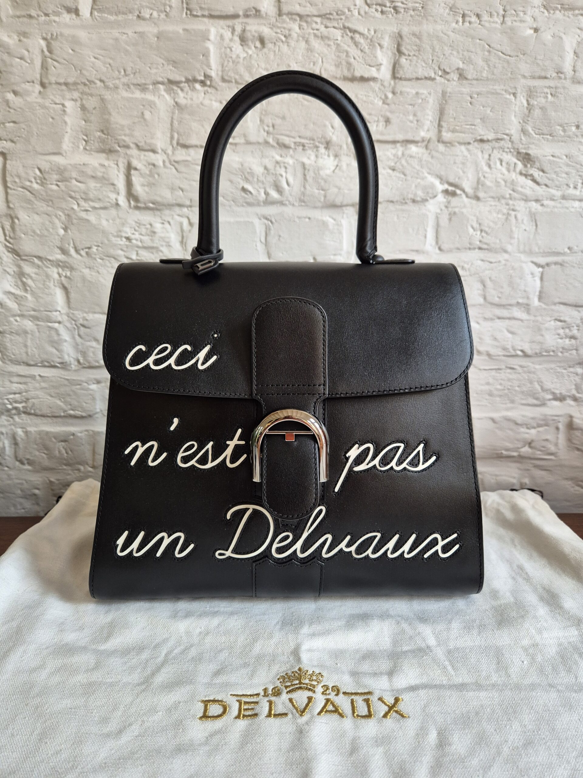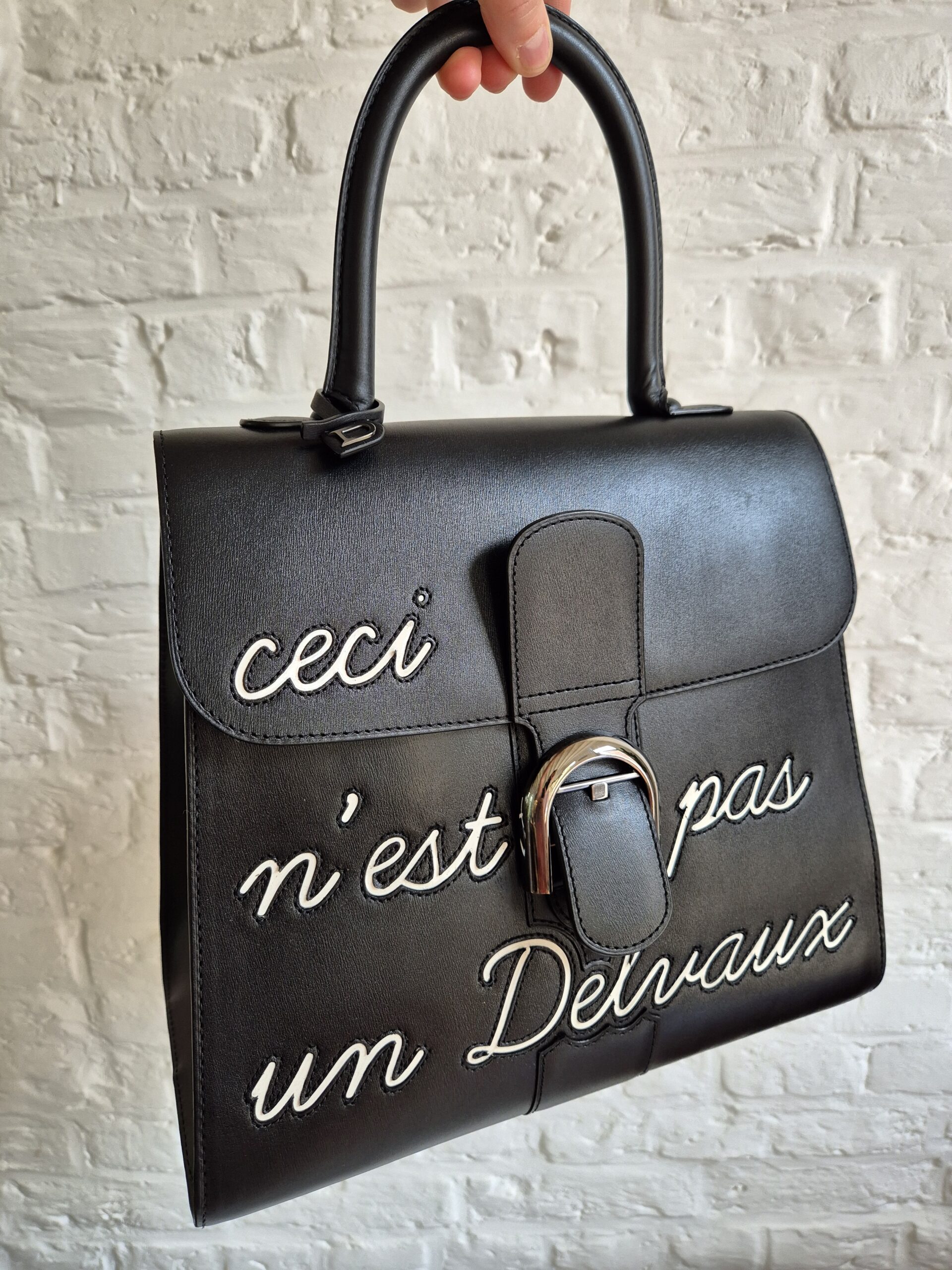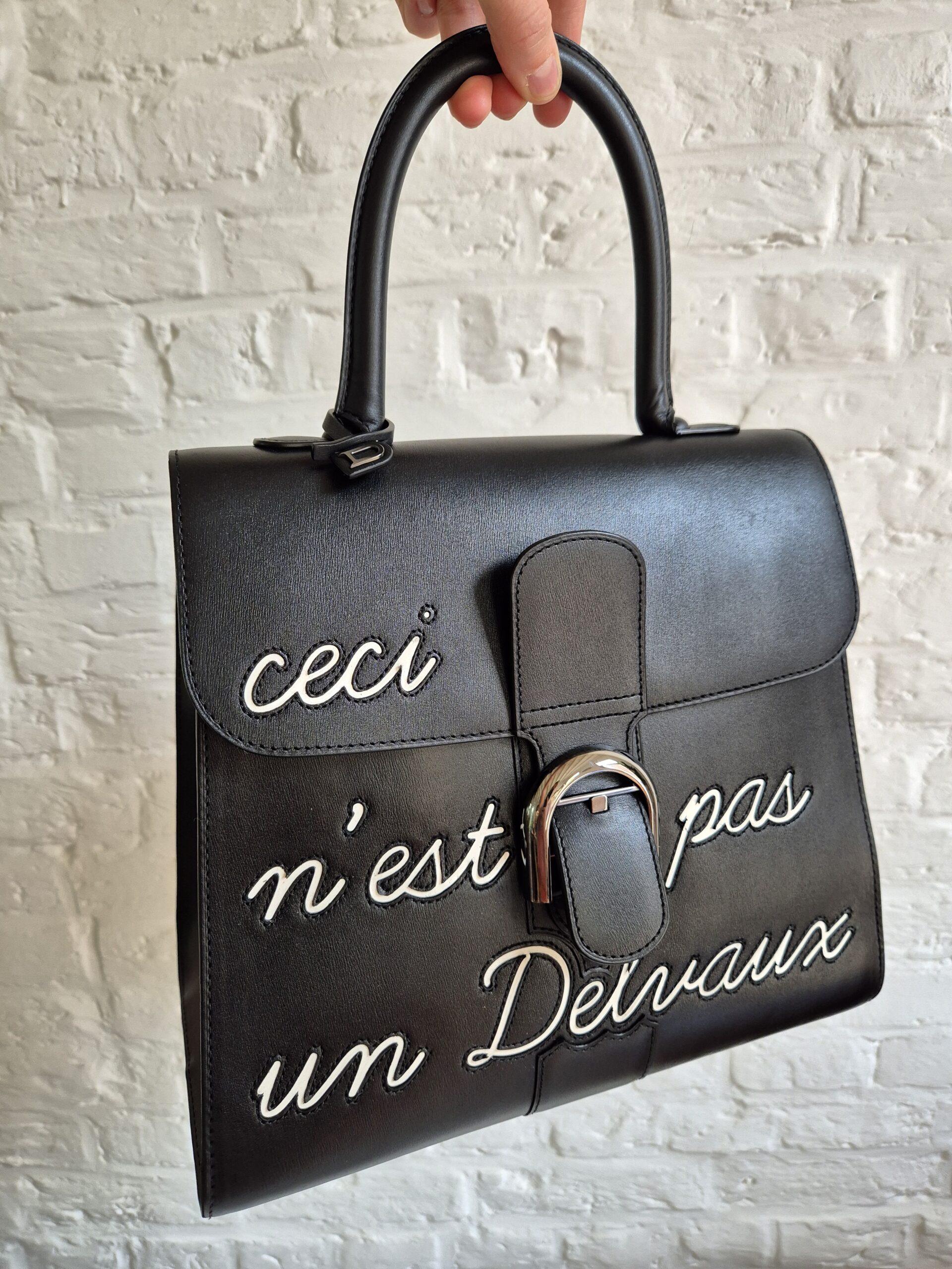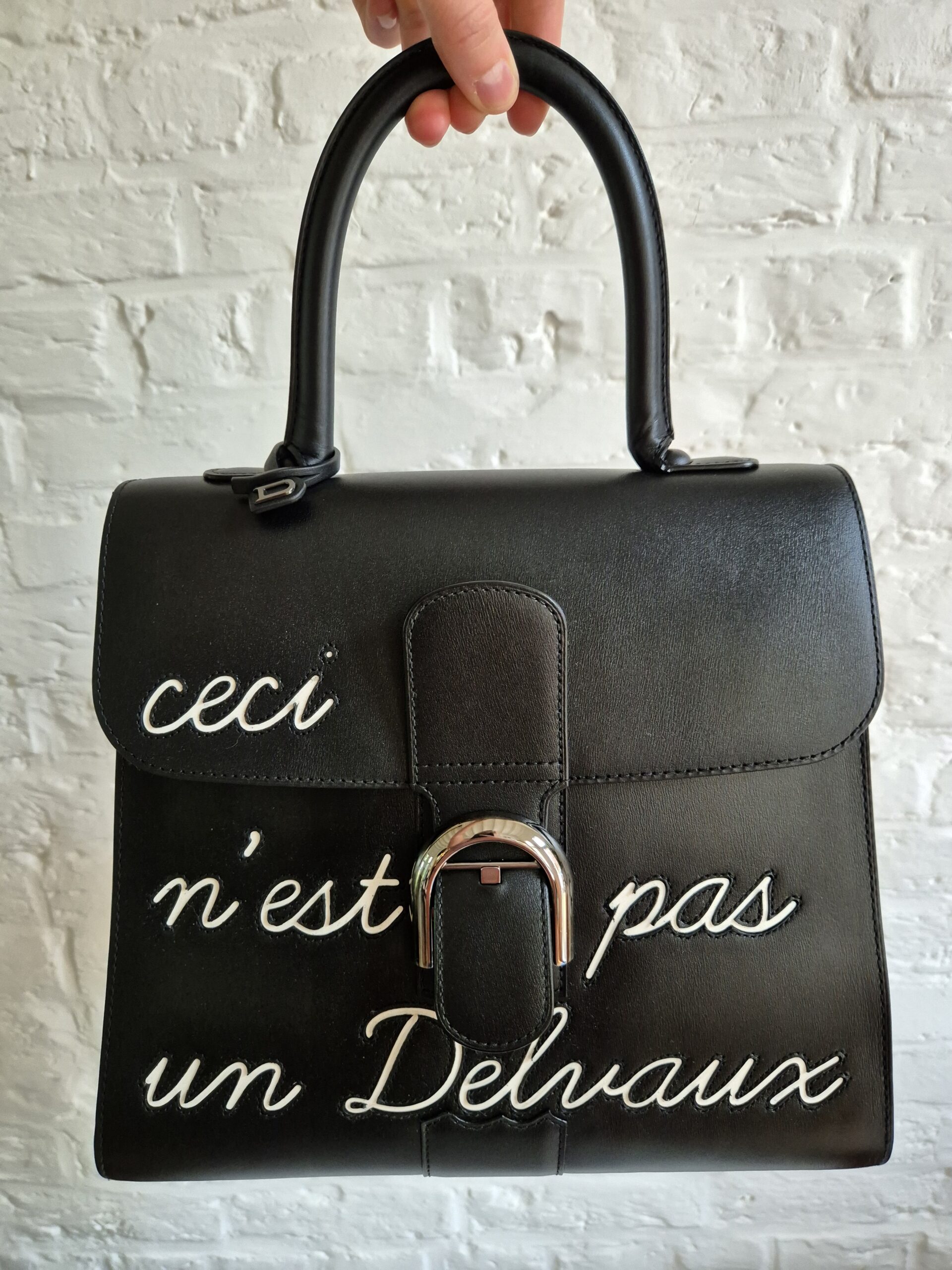 De Brillant is uitgevoerd in zwarte box calf en voorzien van het bekende opschrift ‘Ceci n’est pas un Delvaux’, een ludieke verwijzing naar het gekende citaat.