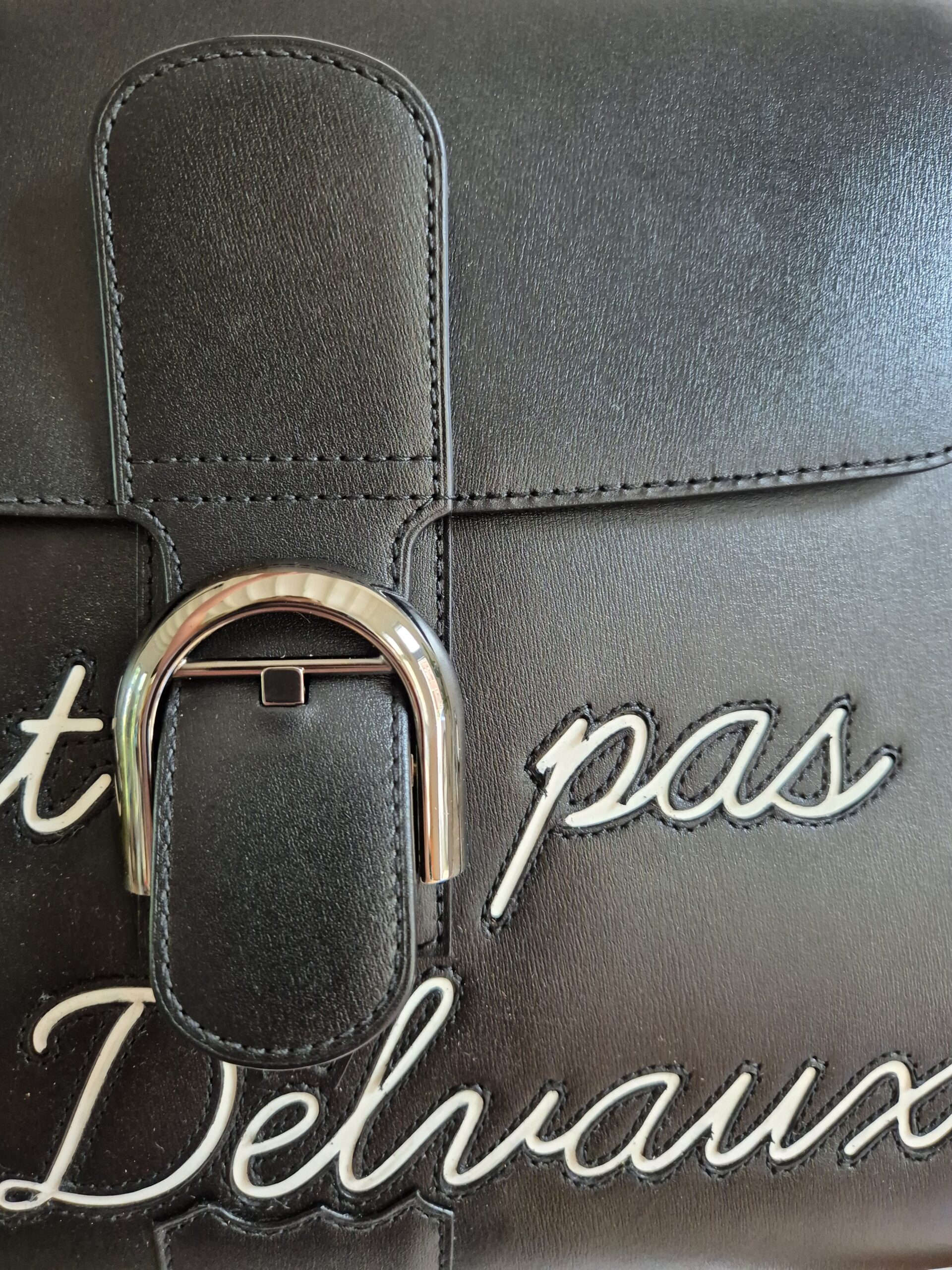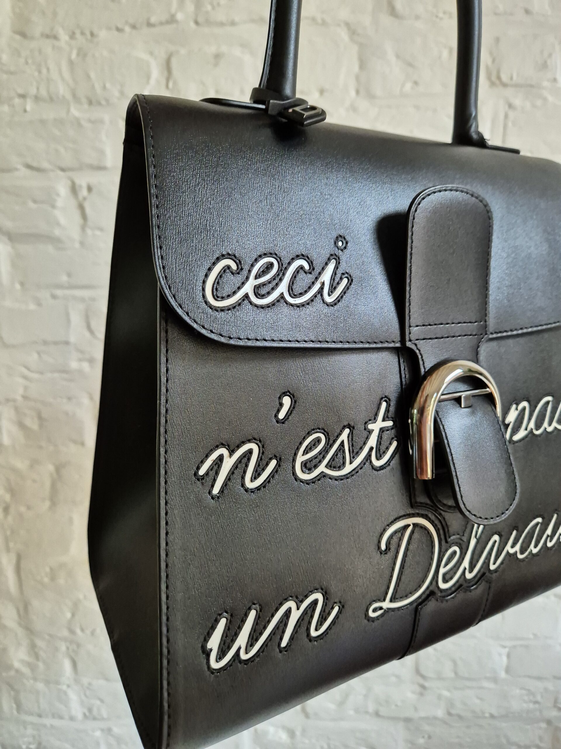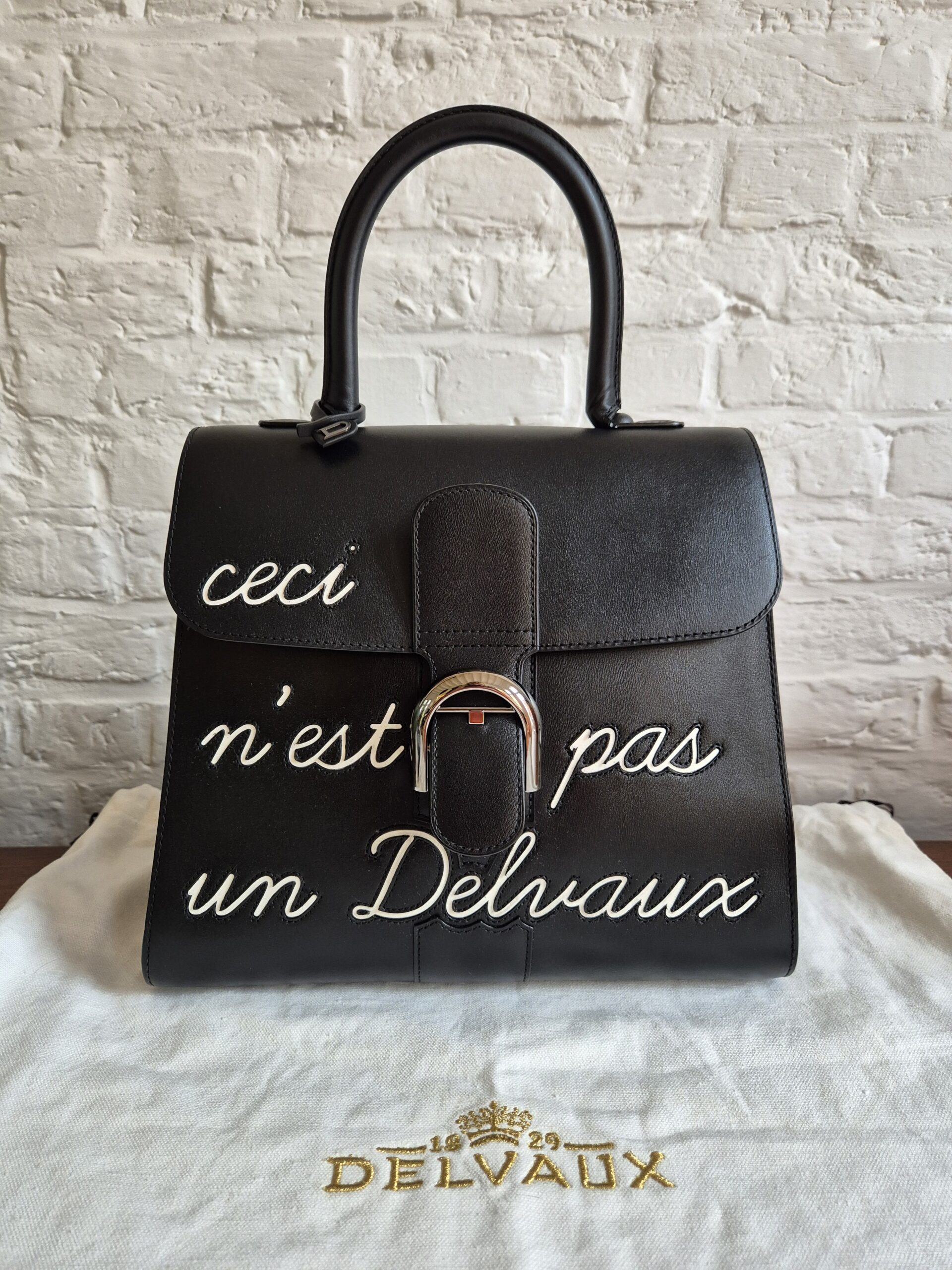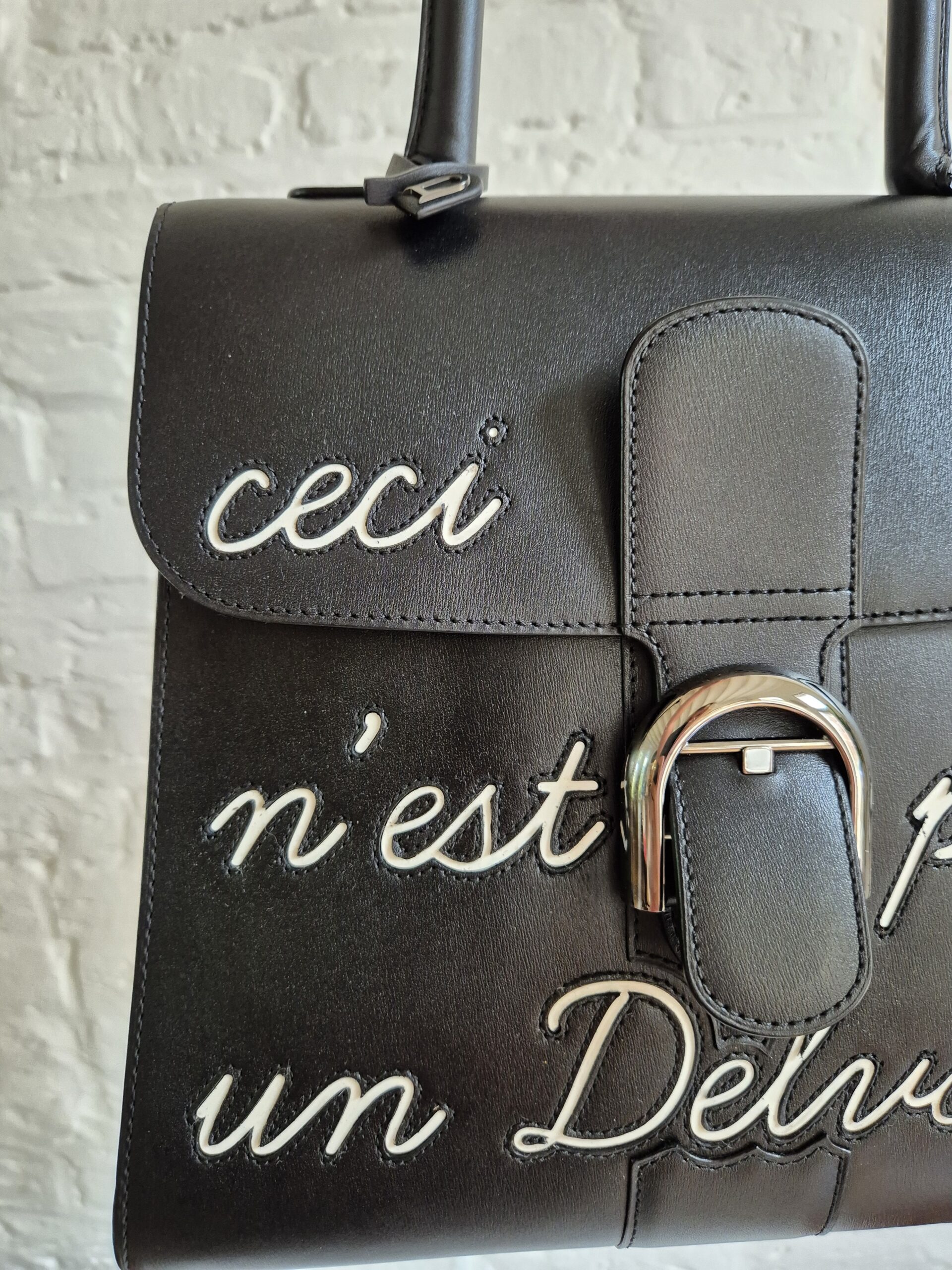 De Brillant is uitgevoerd in zwarte box calf en voorzien van het bekende opschrift ‘Ceci n’est pas un Delvaux’, een ludieke verwijzing naar het gekende citaat.