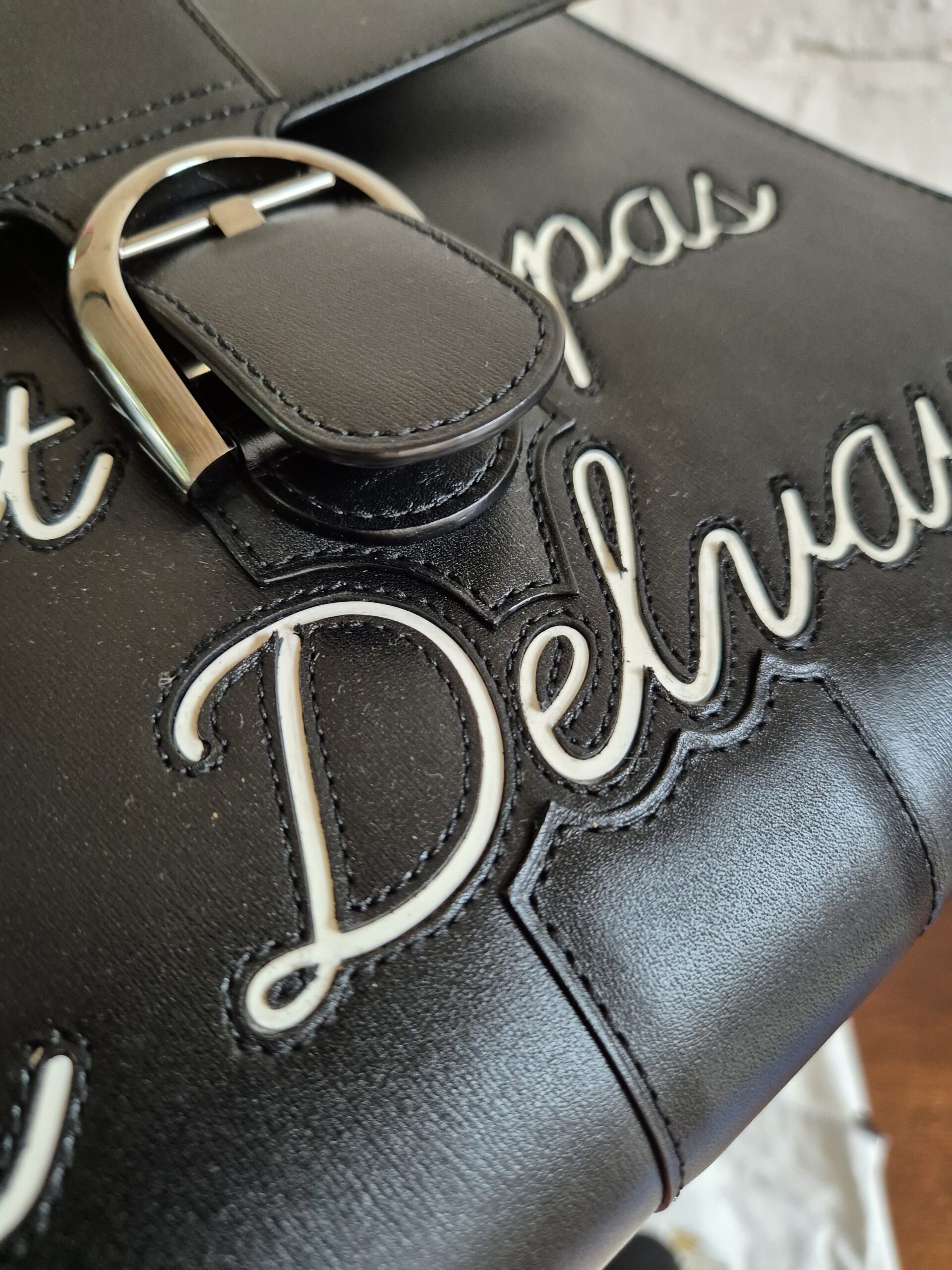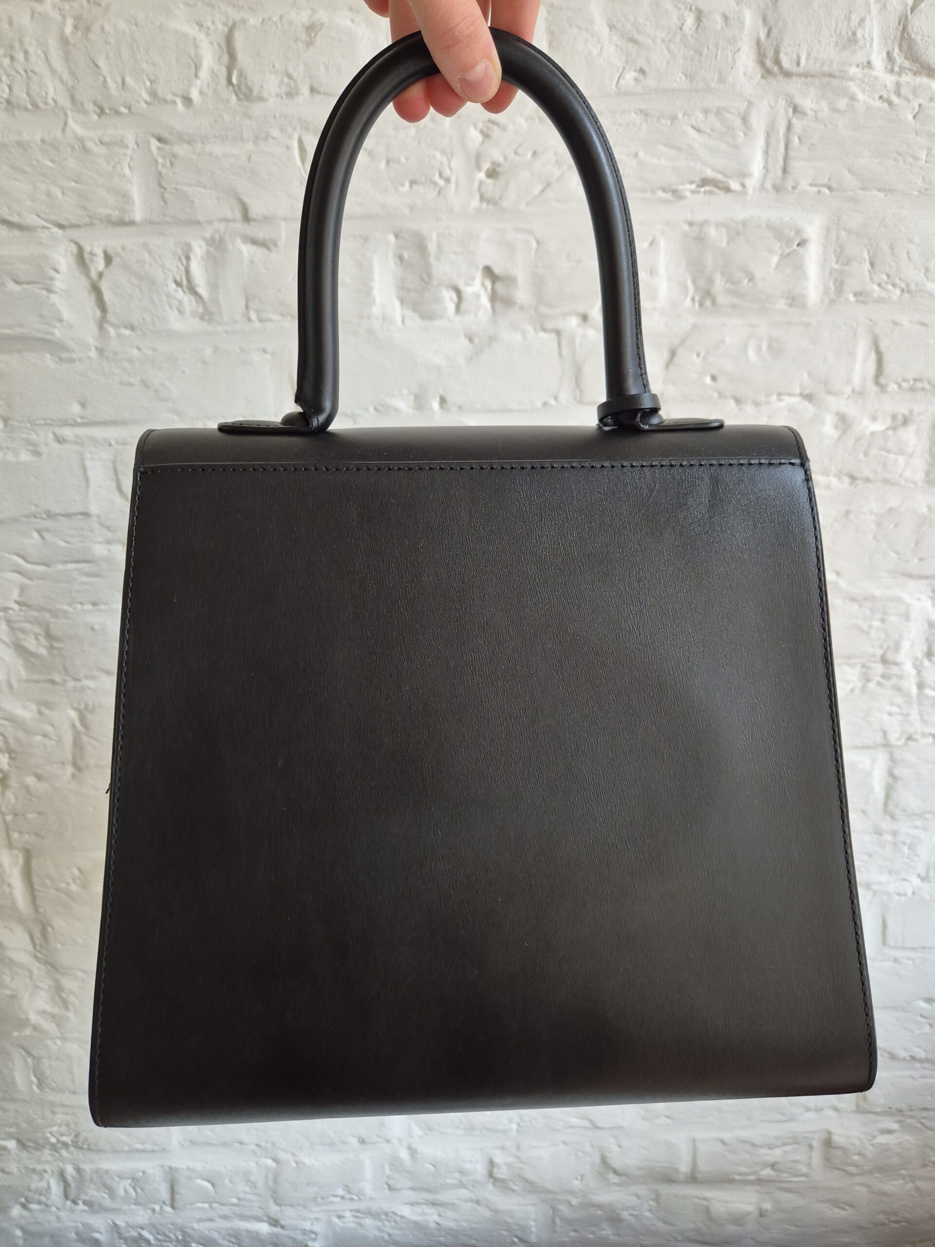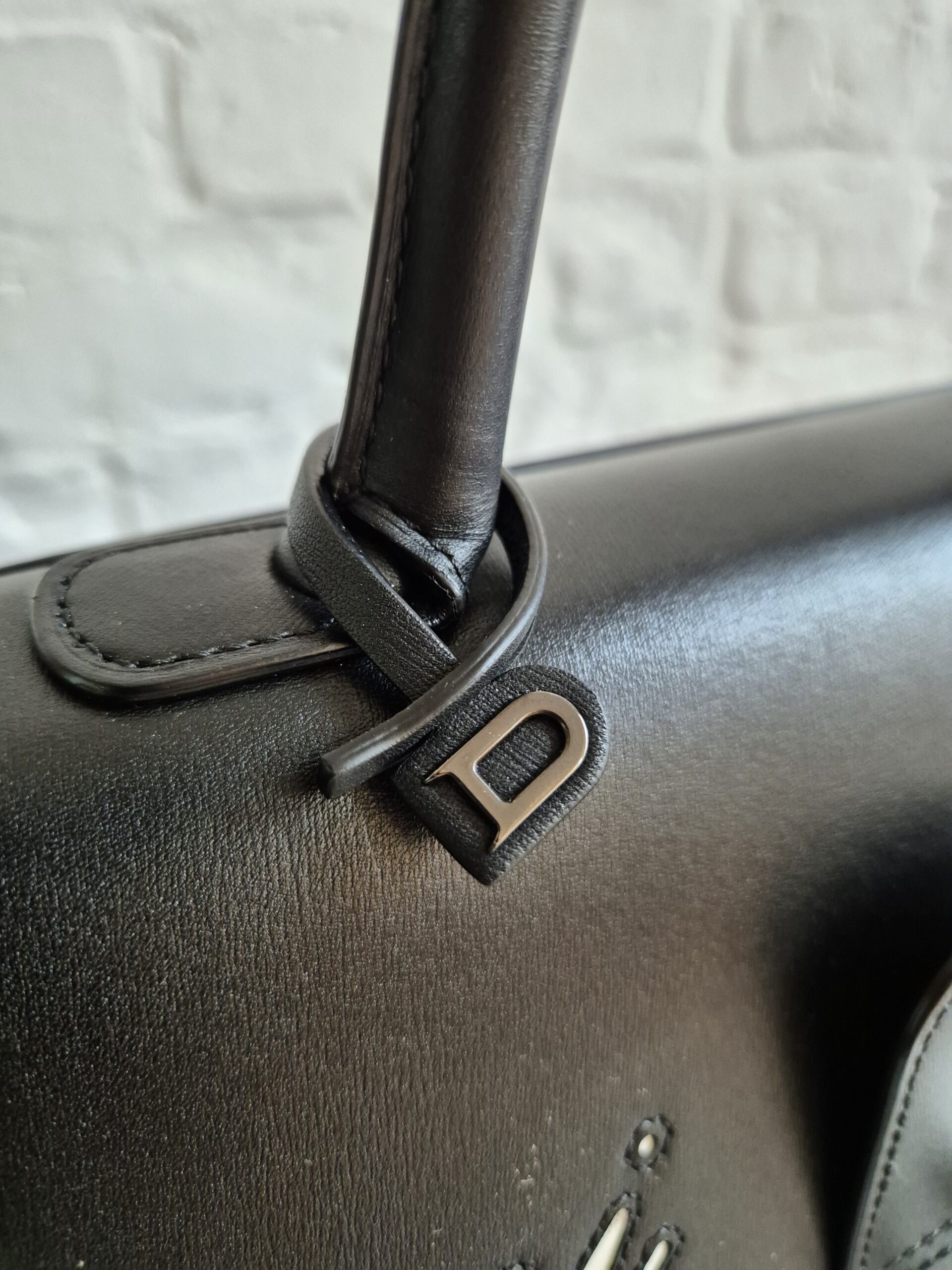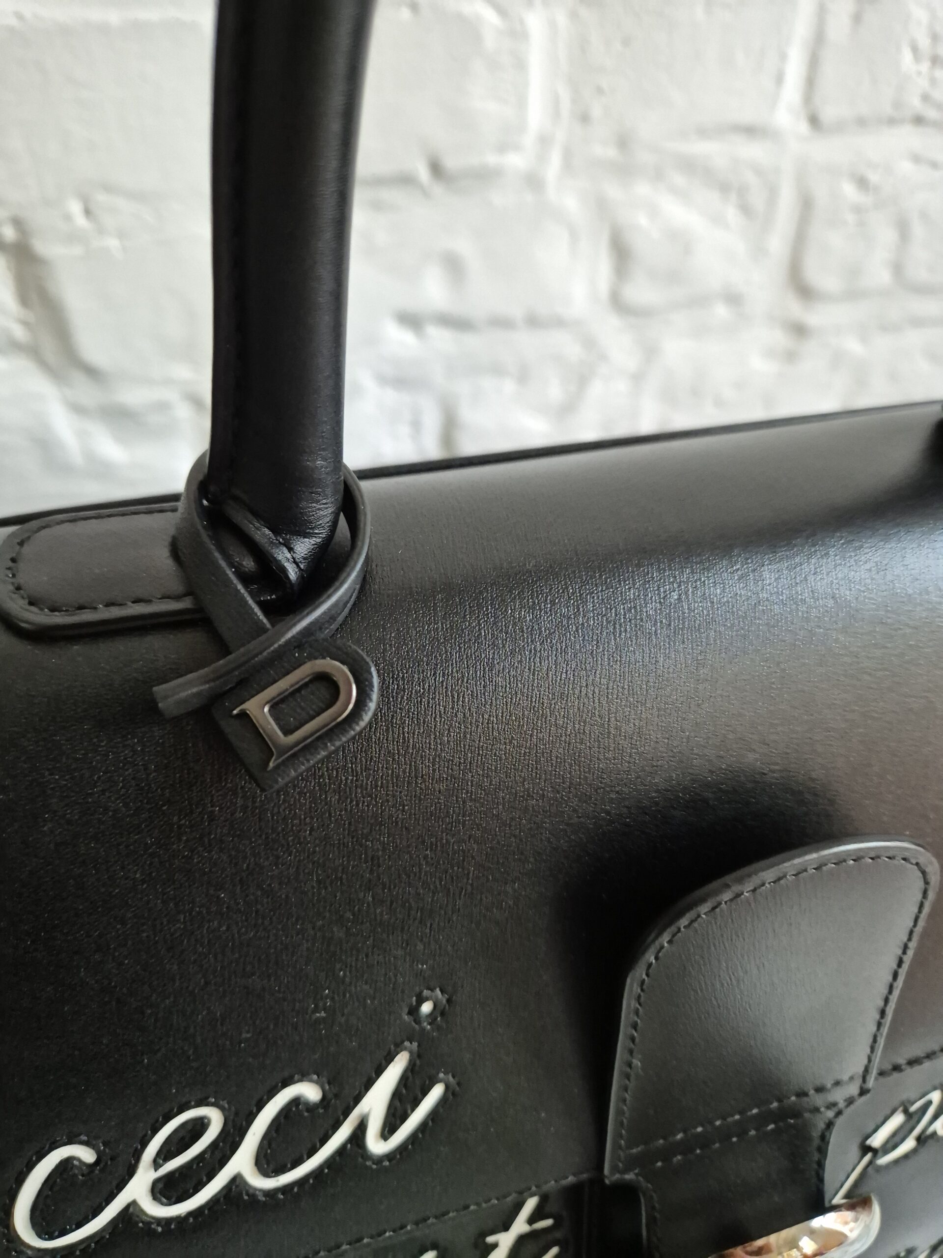 De Brillant is uitgevoerd in zwarte box calf en voorzien van het bekende opschrift ‘Ceci n’est pas un Delvaux’, een ludieke verwijzing naar het gekende citaat.