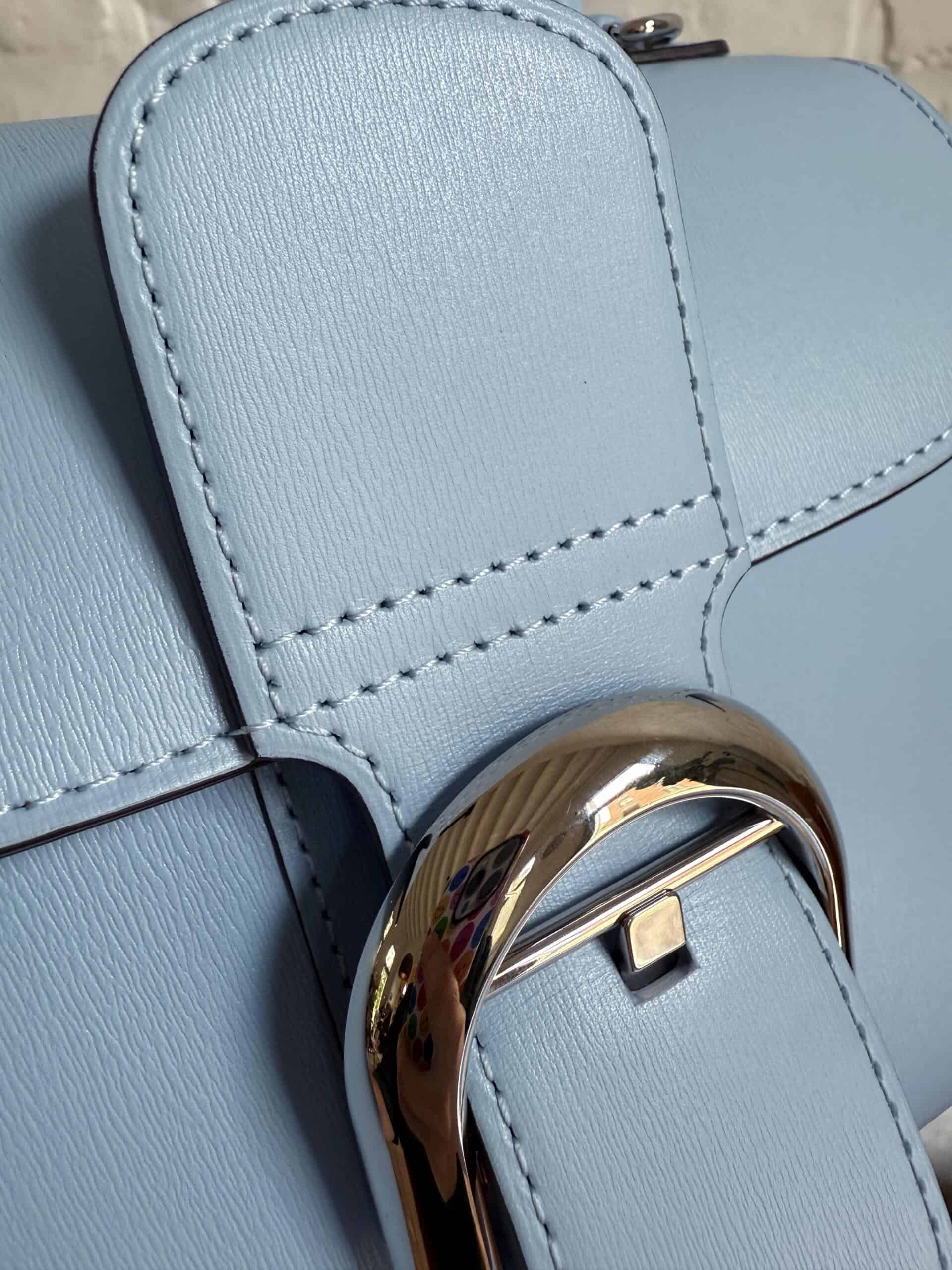 Uitgevoerd in boxcalf in de kleur Azure met zilveren hardware. De riem is afneembaar en verstelbaar met de mooie gesp.