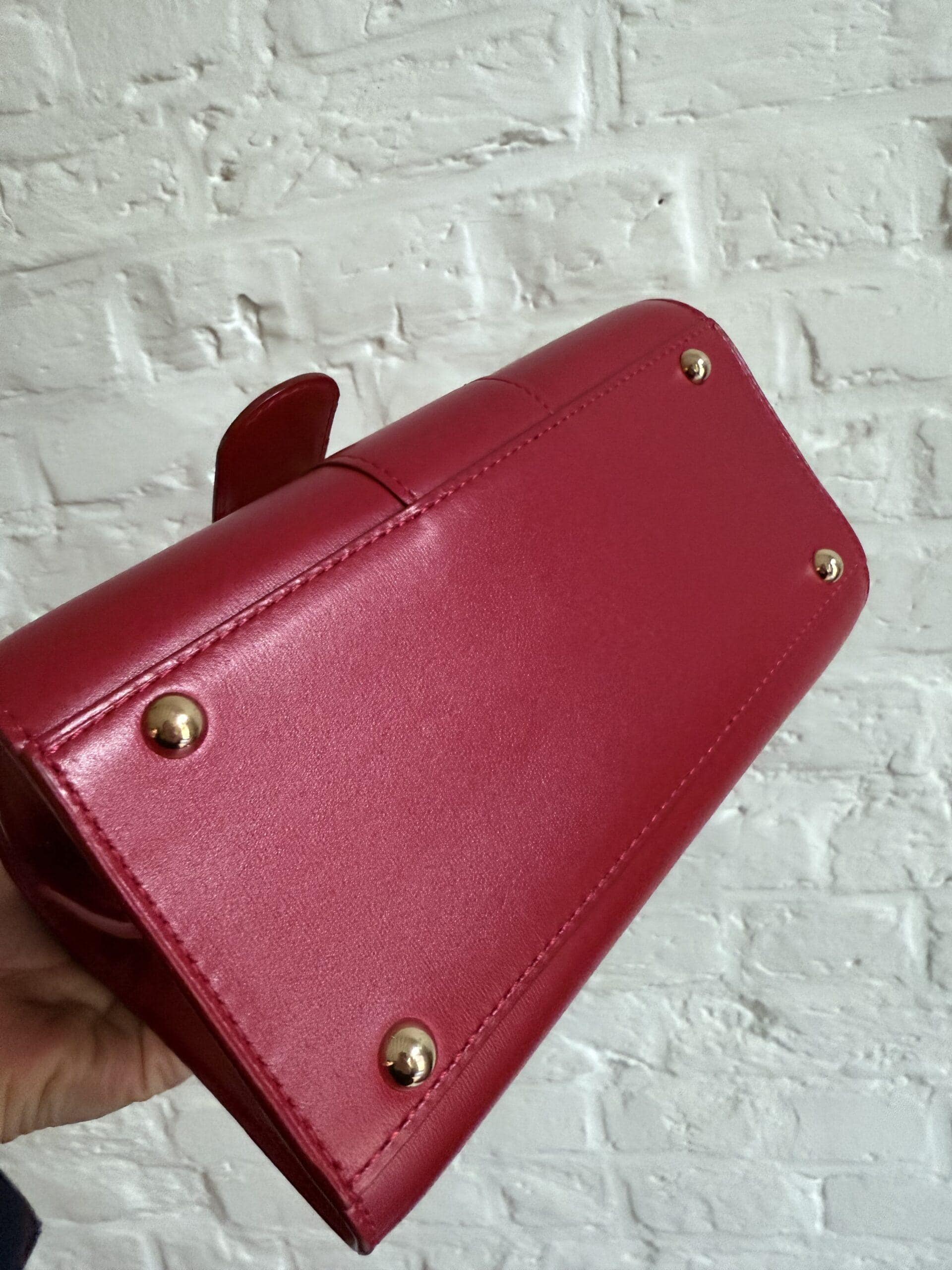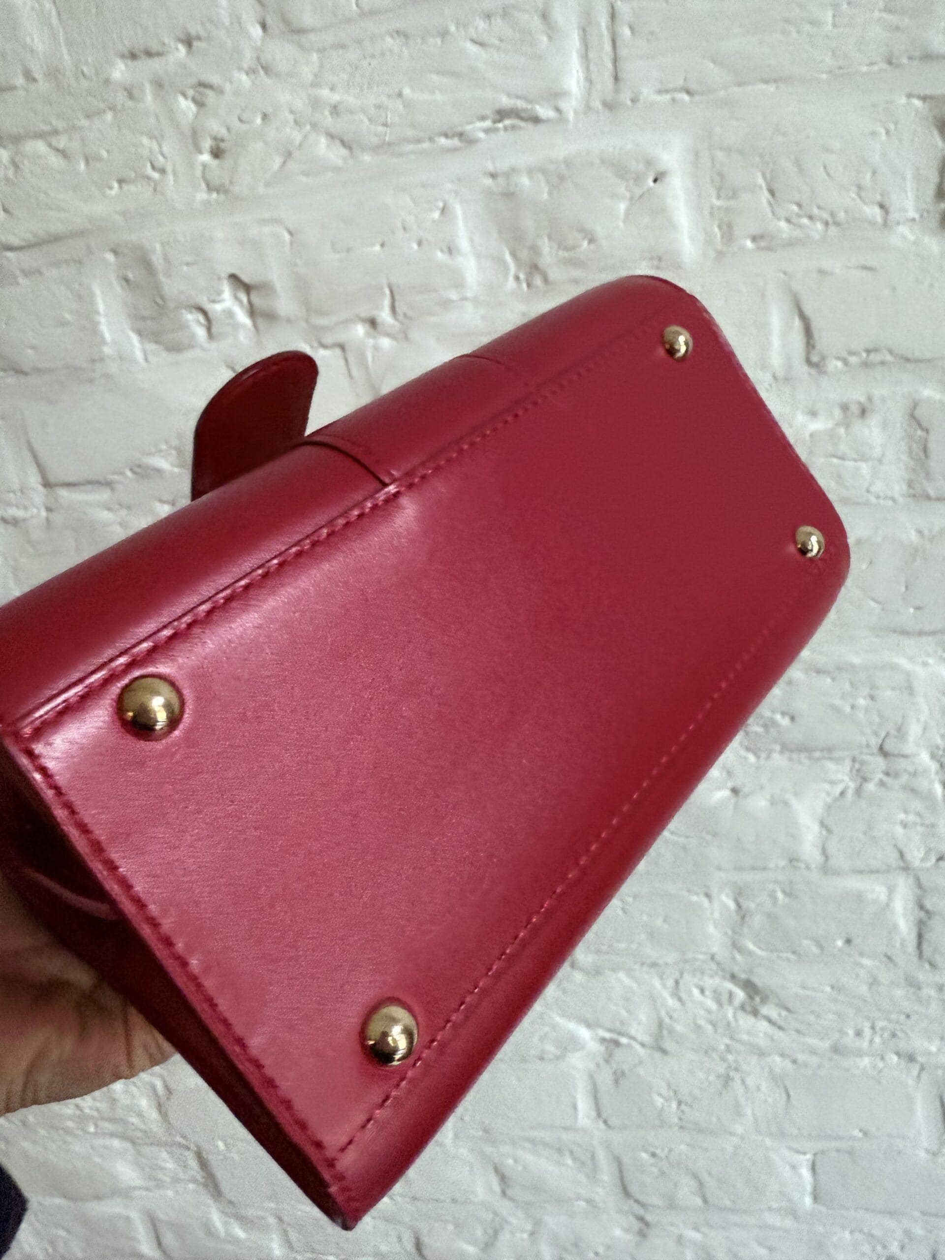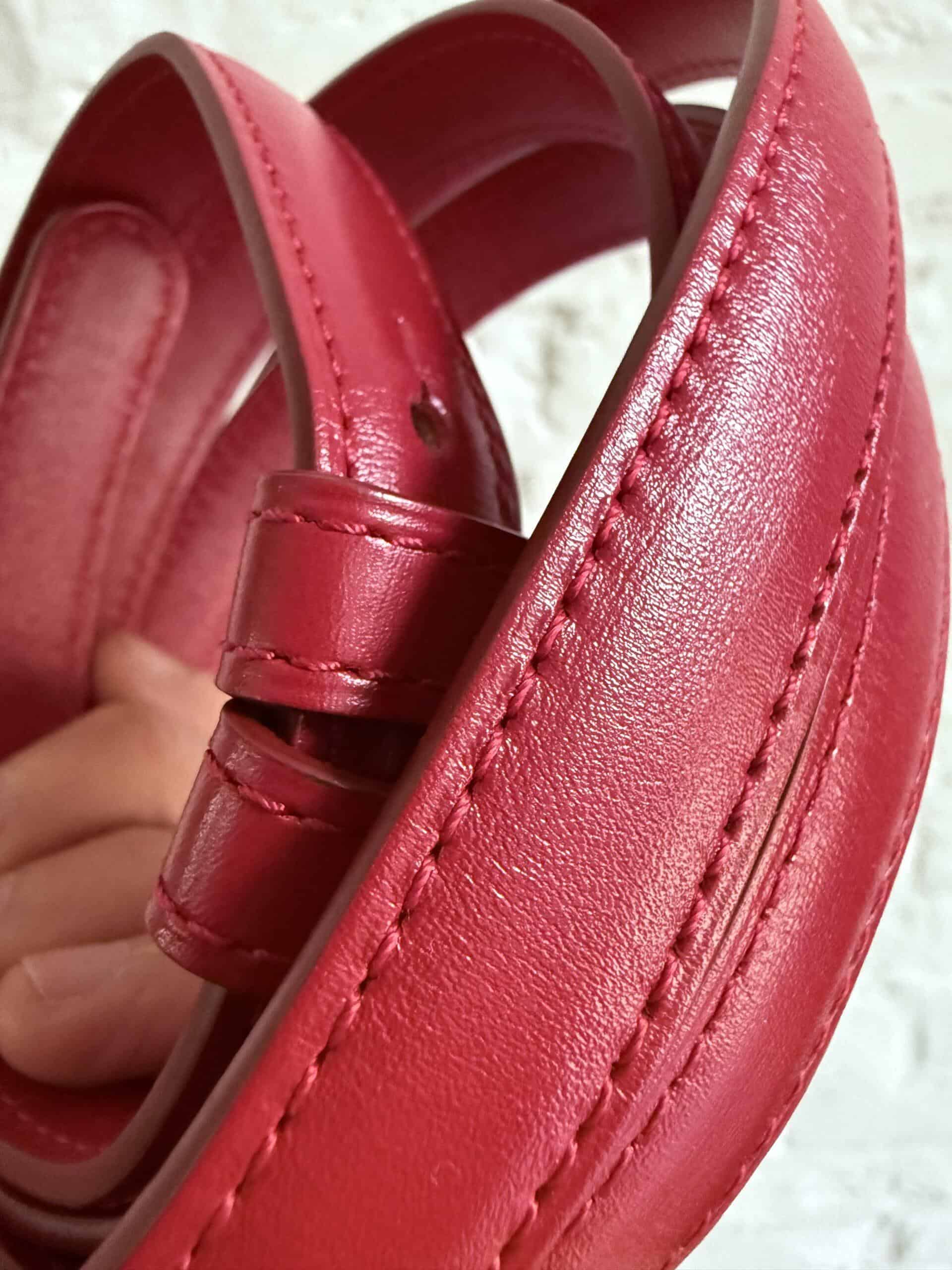 Uitgevoerd in boxcalf met champagne gouden hardware. De riem is afneembaar en verstelbaar met geweerknopjes.
