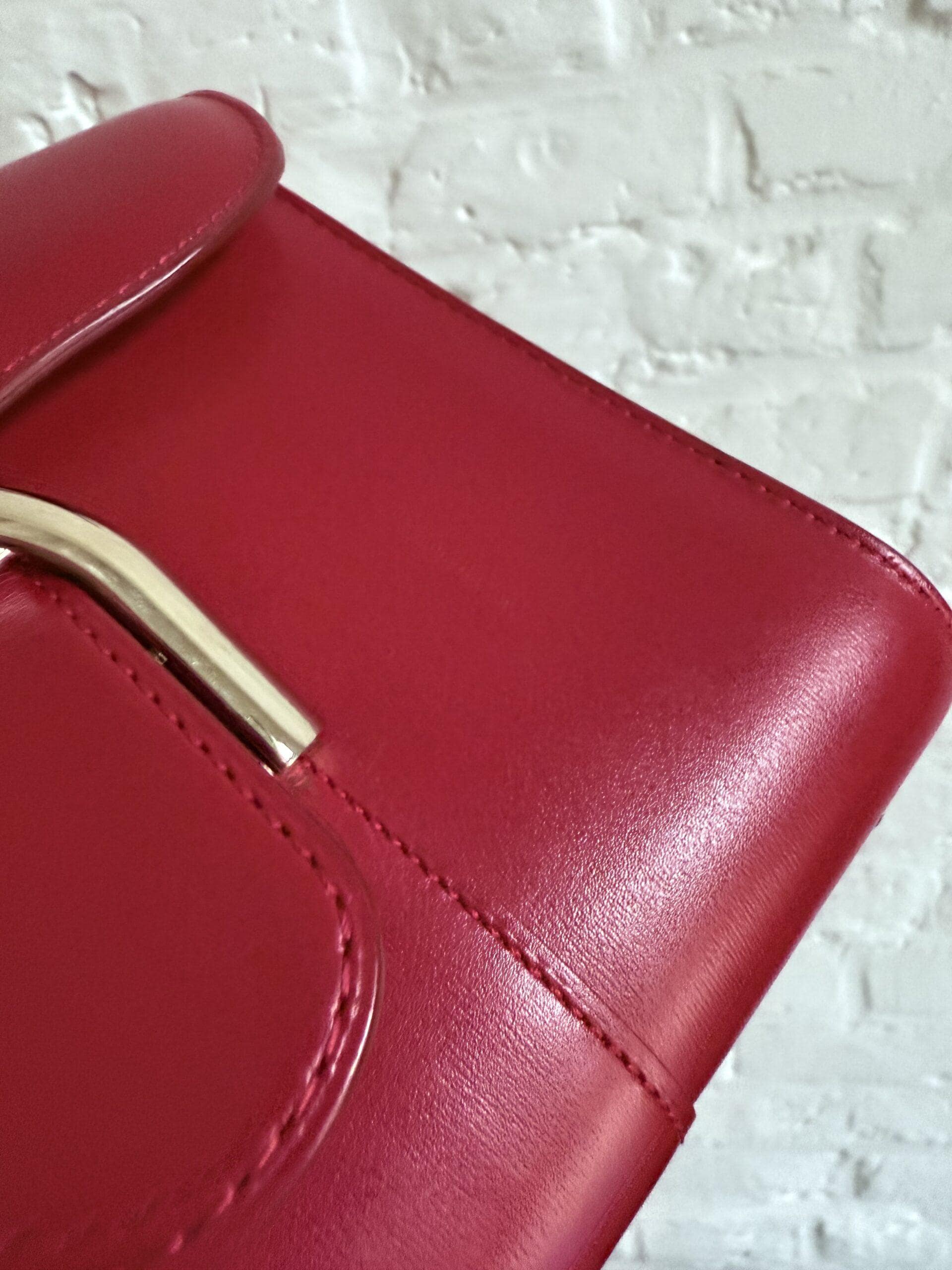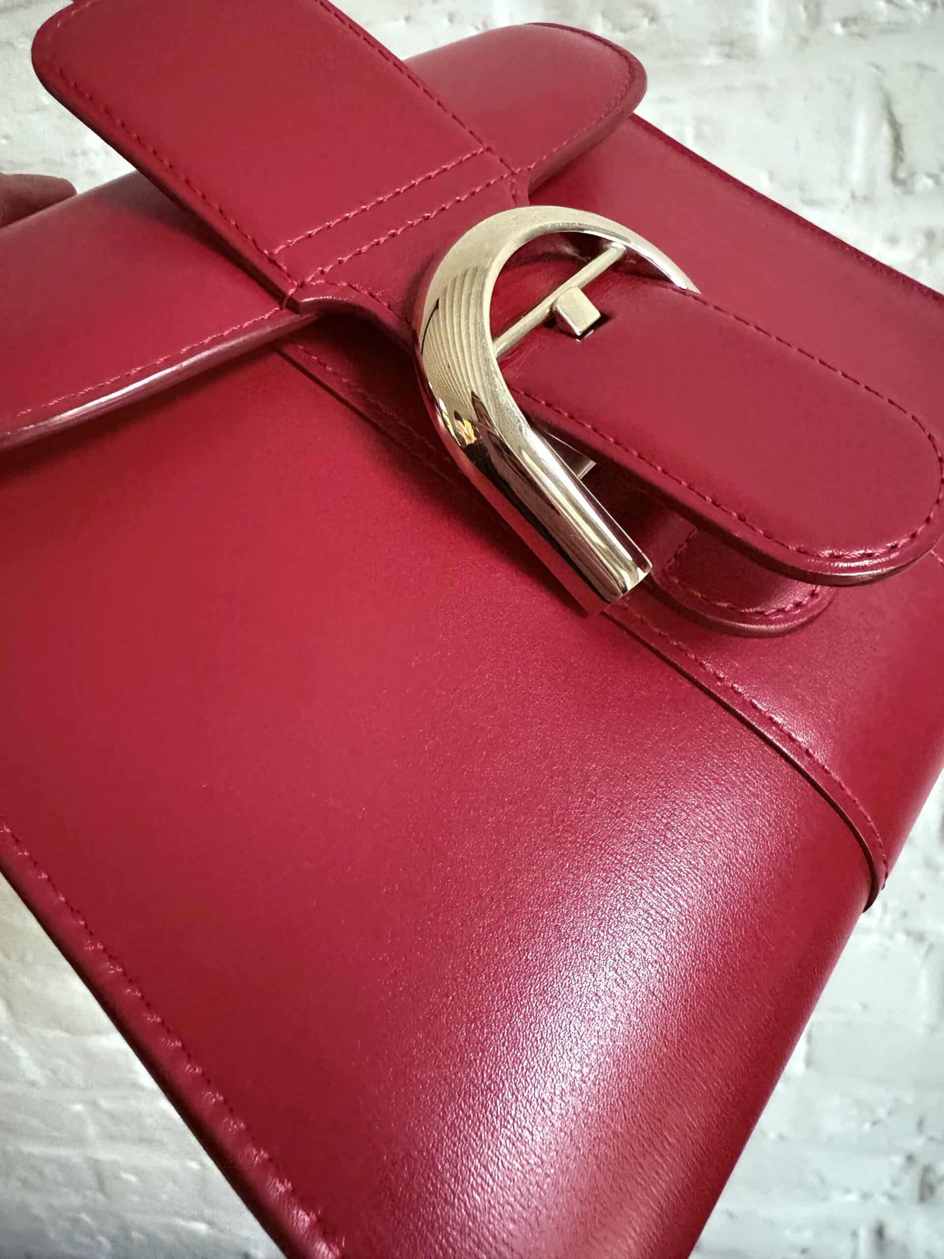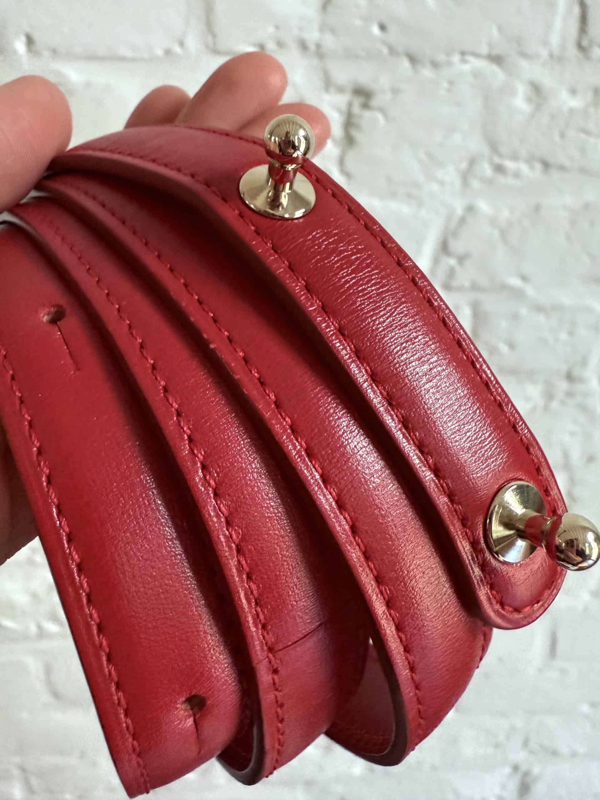 Uitgevoerd in boxcalf met champagne gouden hardware. De riem is afneembaar en verstelbaar met geweerknopjes.
