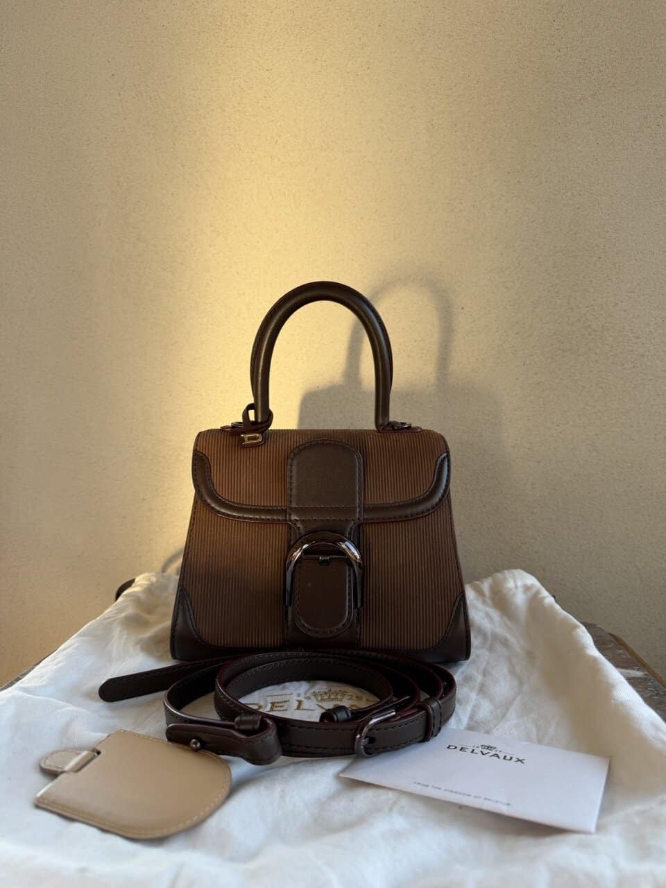 Authentieke Delvaux stofzak, Certificaat, Riem, Spiegel