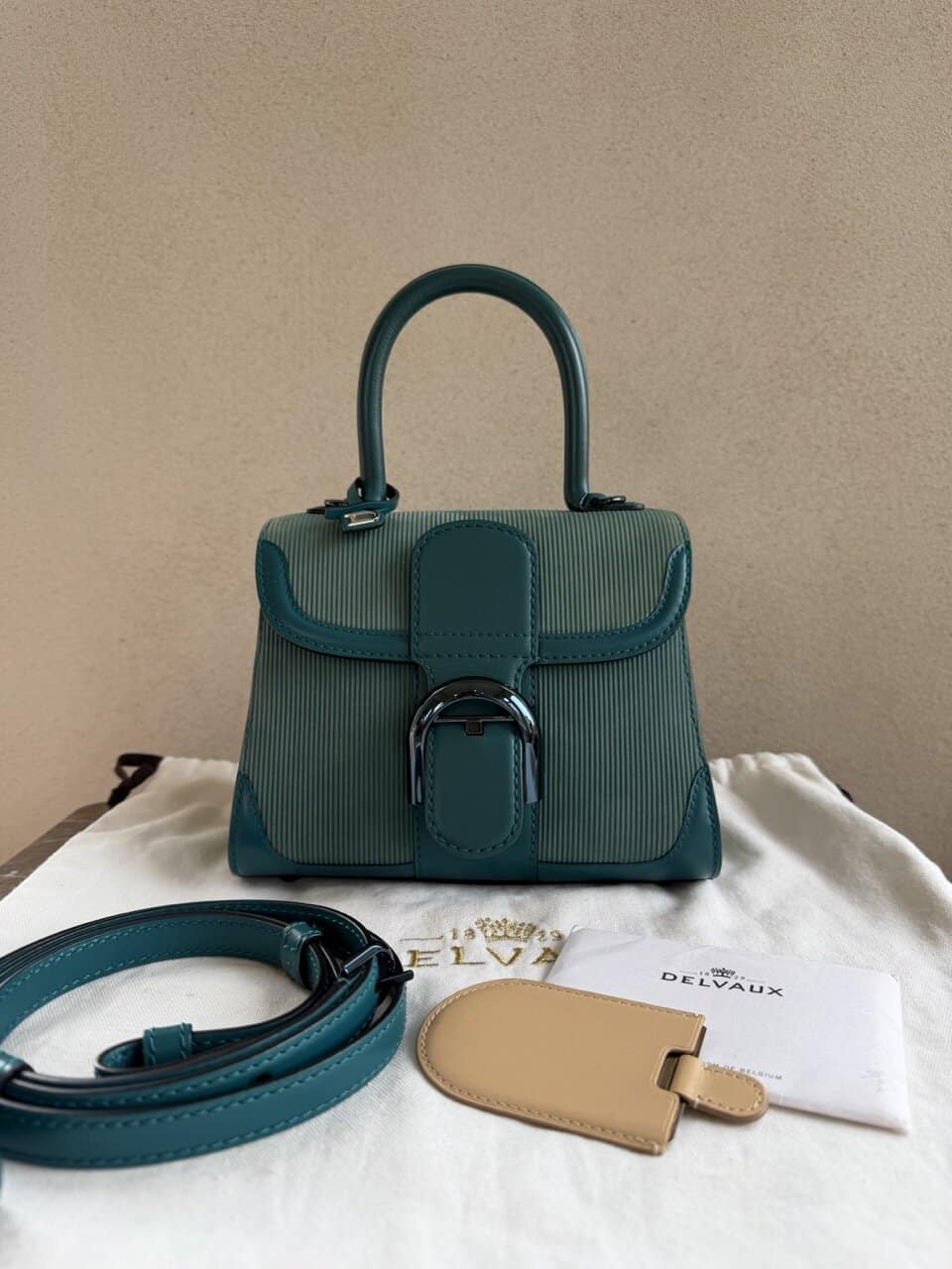Authentieke Delvaux stofzak, Certificaat, Riem, Spiegel