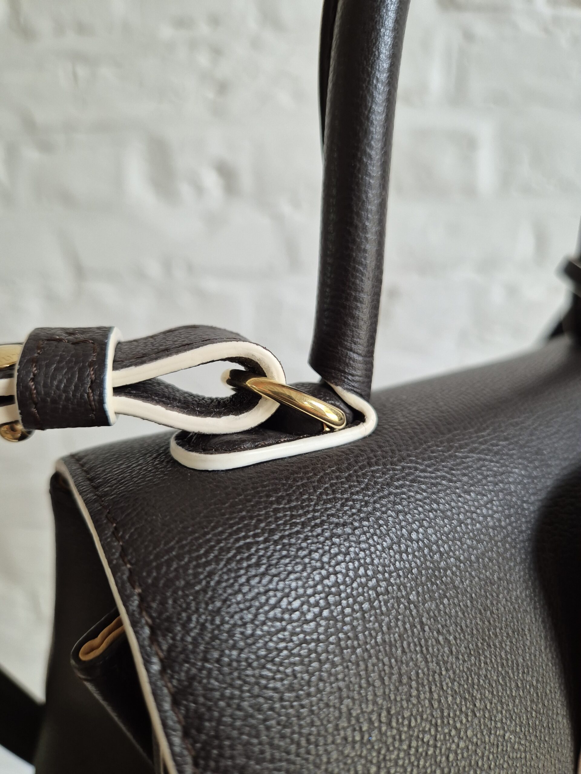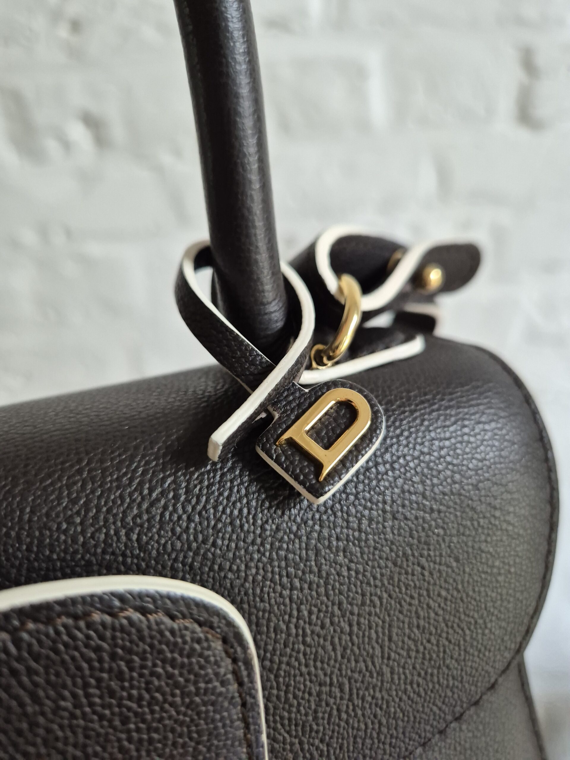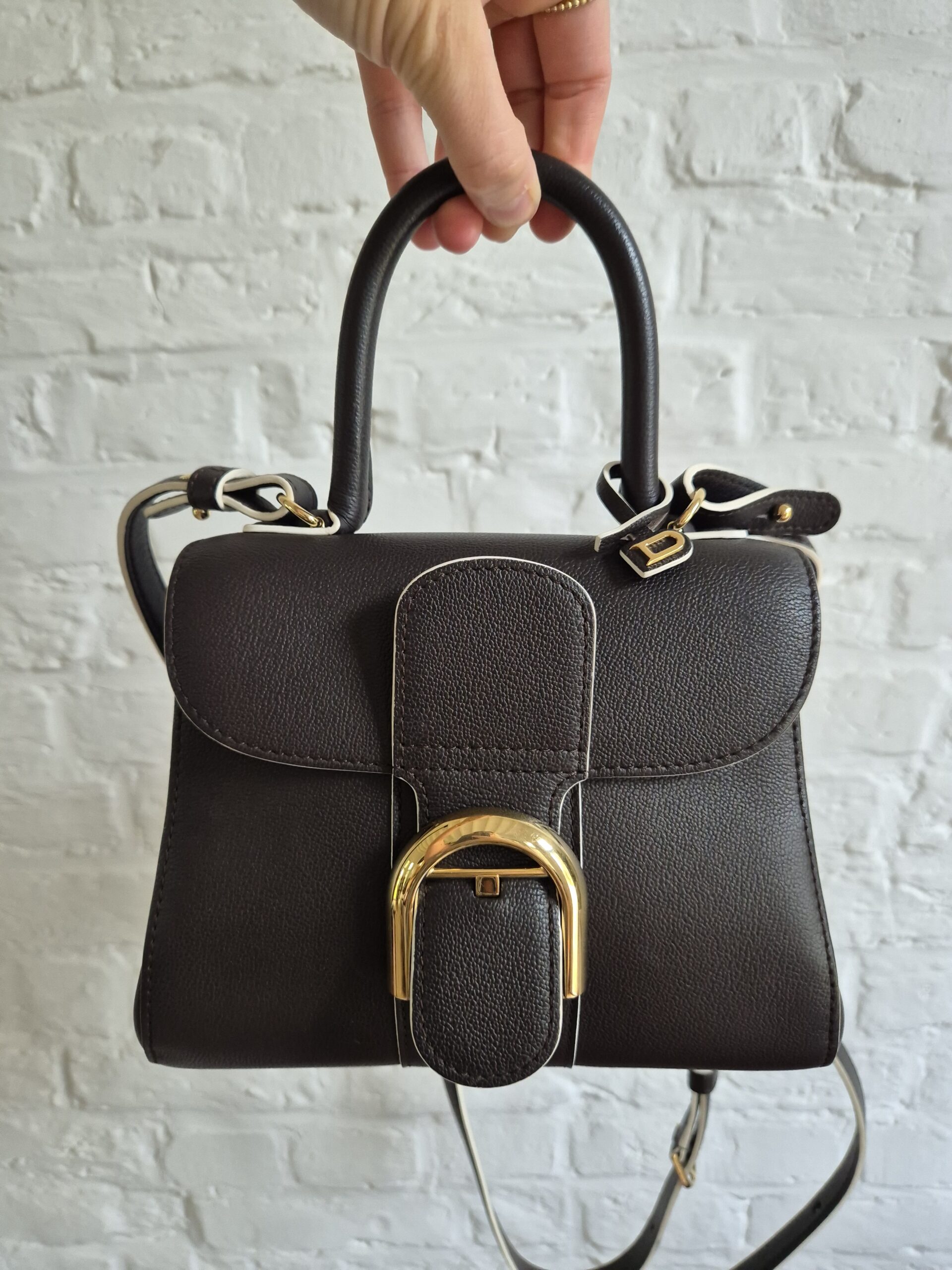 De Brillant Mini in Ebène rodeo calf. Je draagt hem aan de hand of over de schouder of als crossbody. Zijn uitvoering is magnifiek met een witte kantverf. Ebène is een warm donkerbruin, dat op het eerste zicht naar zwart neigt. Tijdloos!