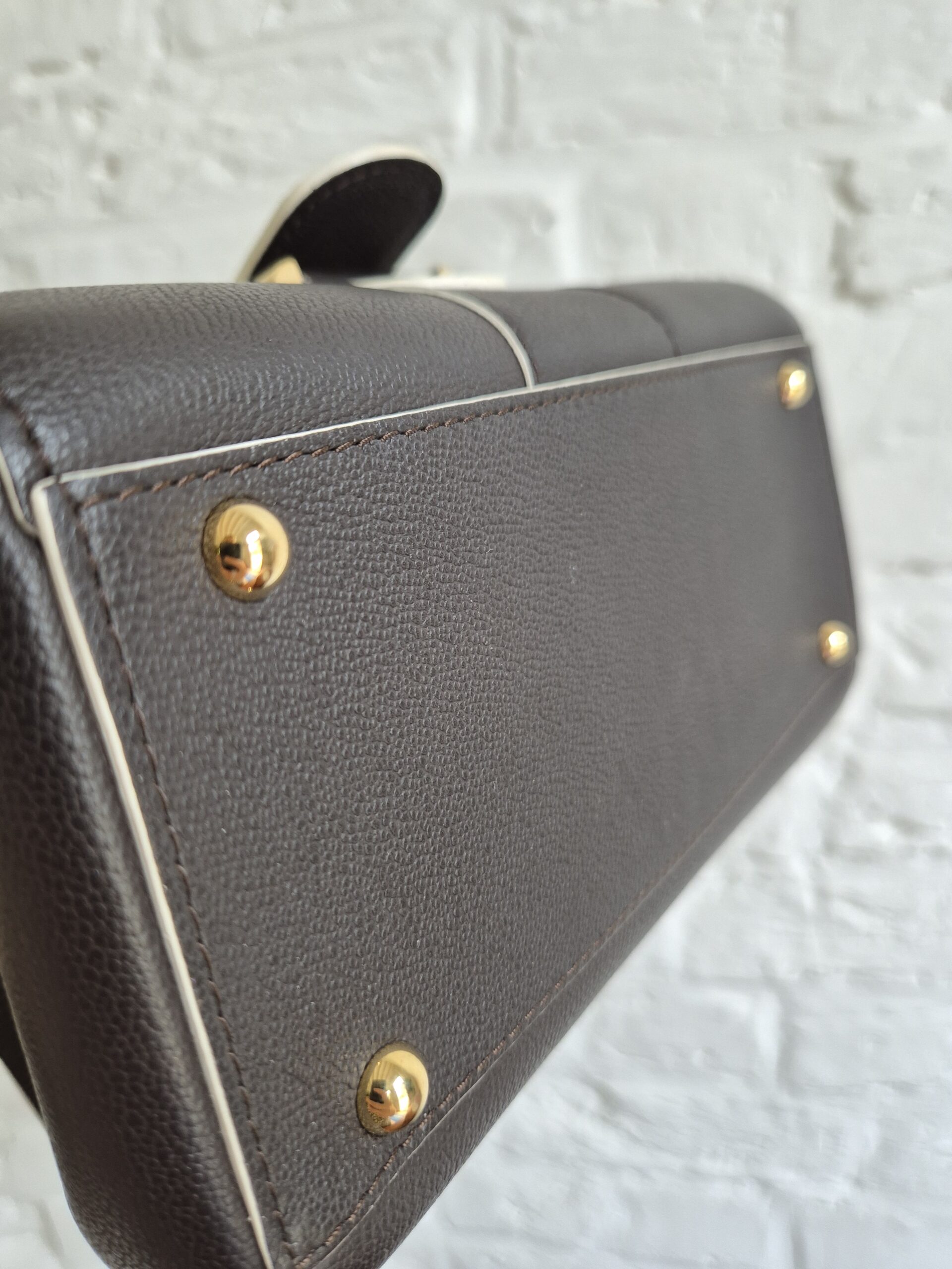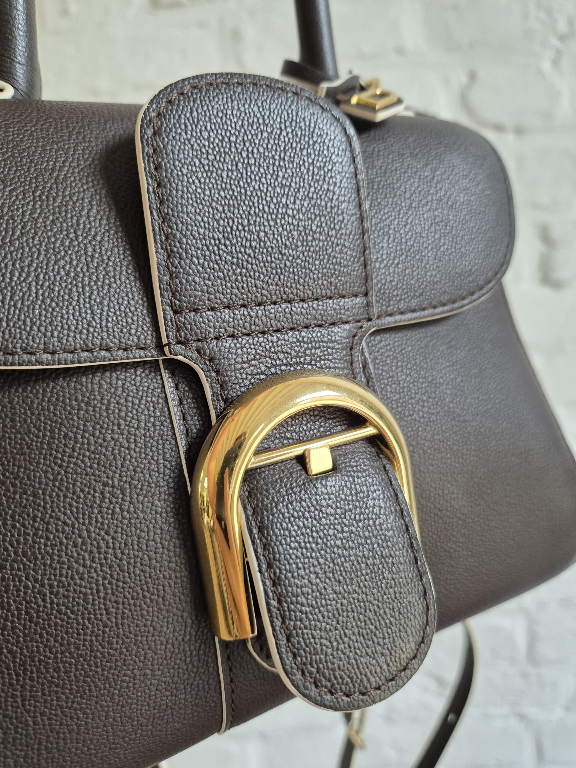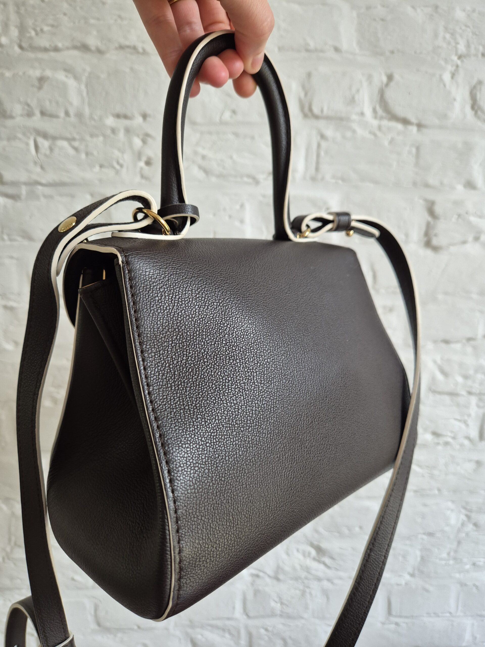 De Brillant Mini in Ebène rodeo calf. Je draagt hem aan de hand of over de schouder of als crossbody. Zijn uitvoering is magnifiek met een witte kantverf. Ebène is een warm donkerbruin, dat op het eerste zicht naar zwart neigt. Tijdloos!