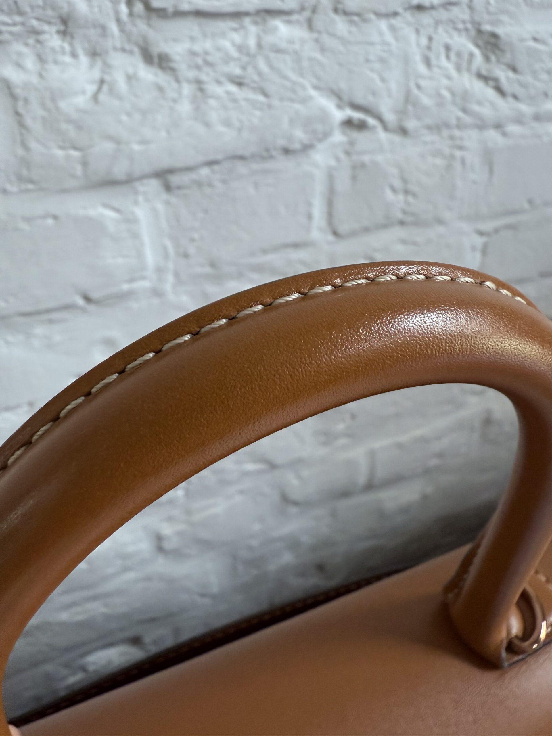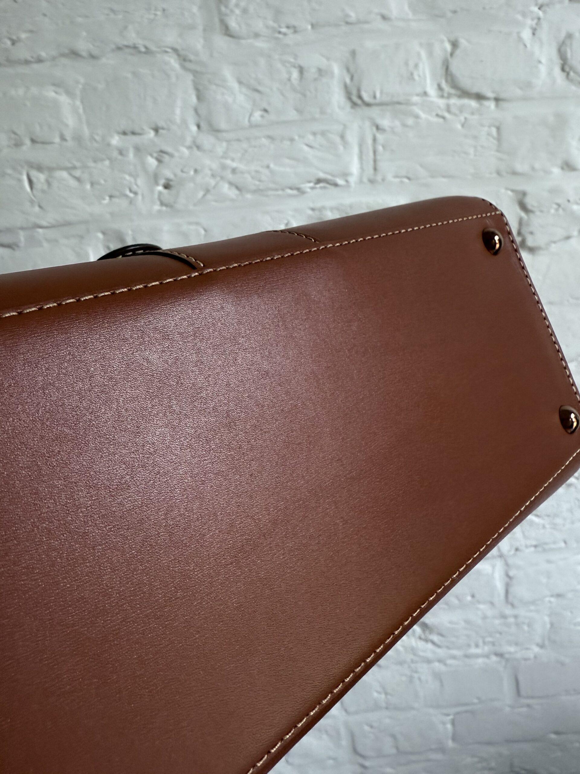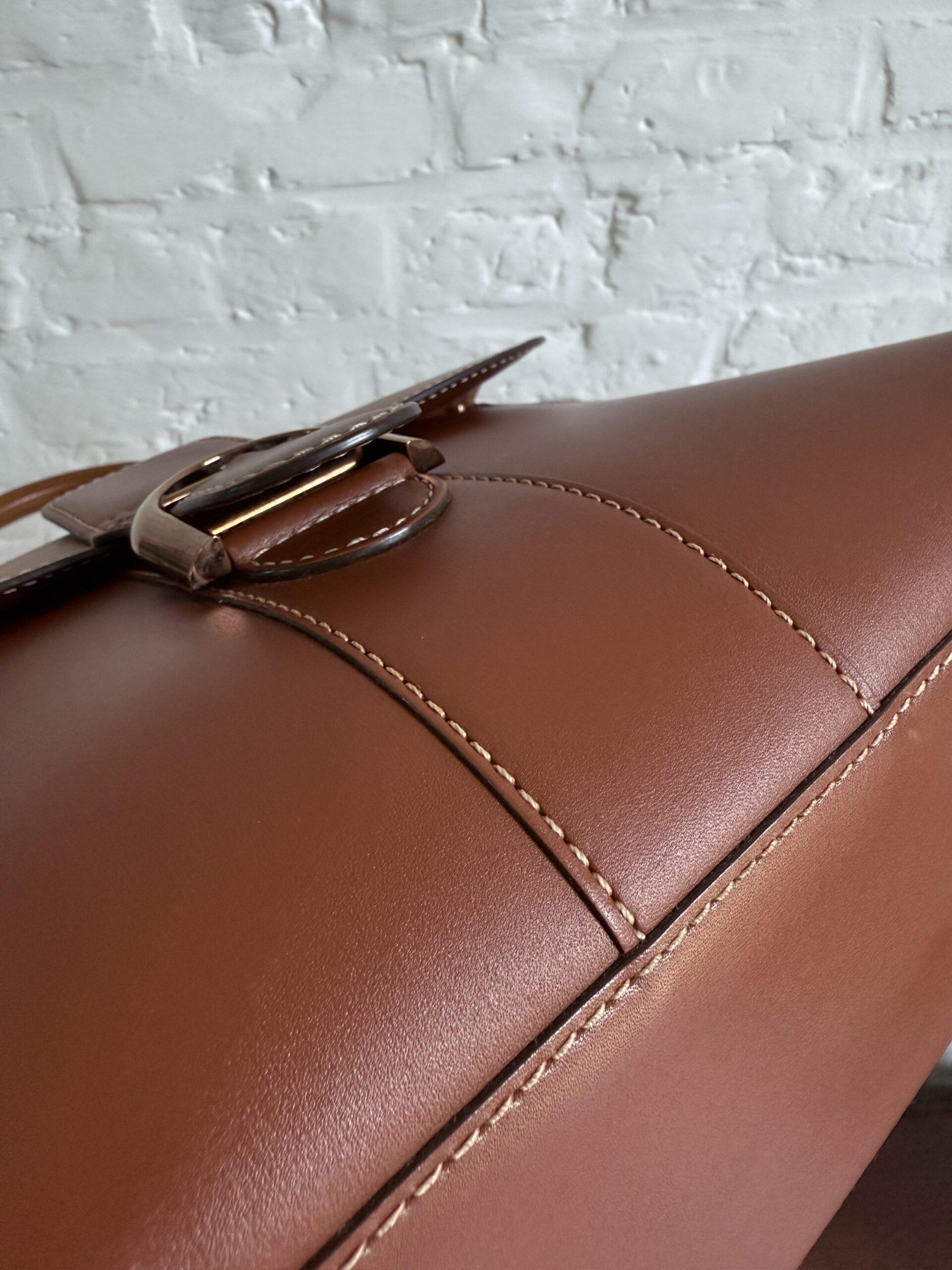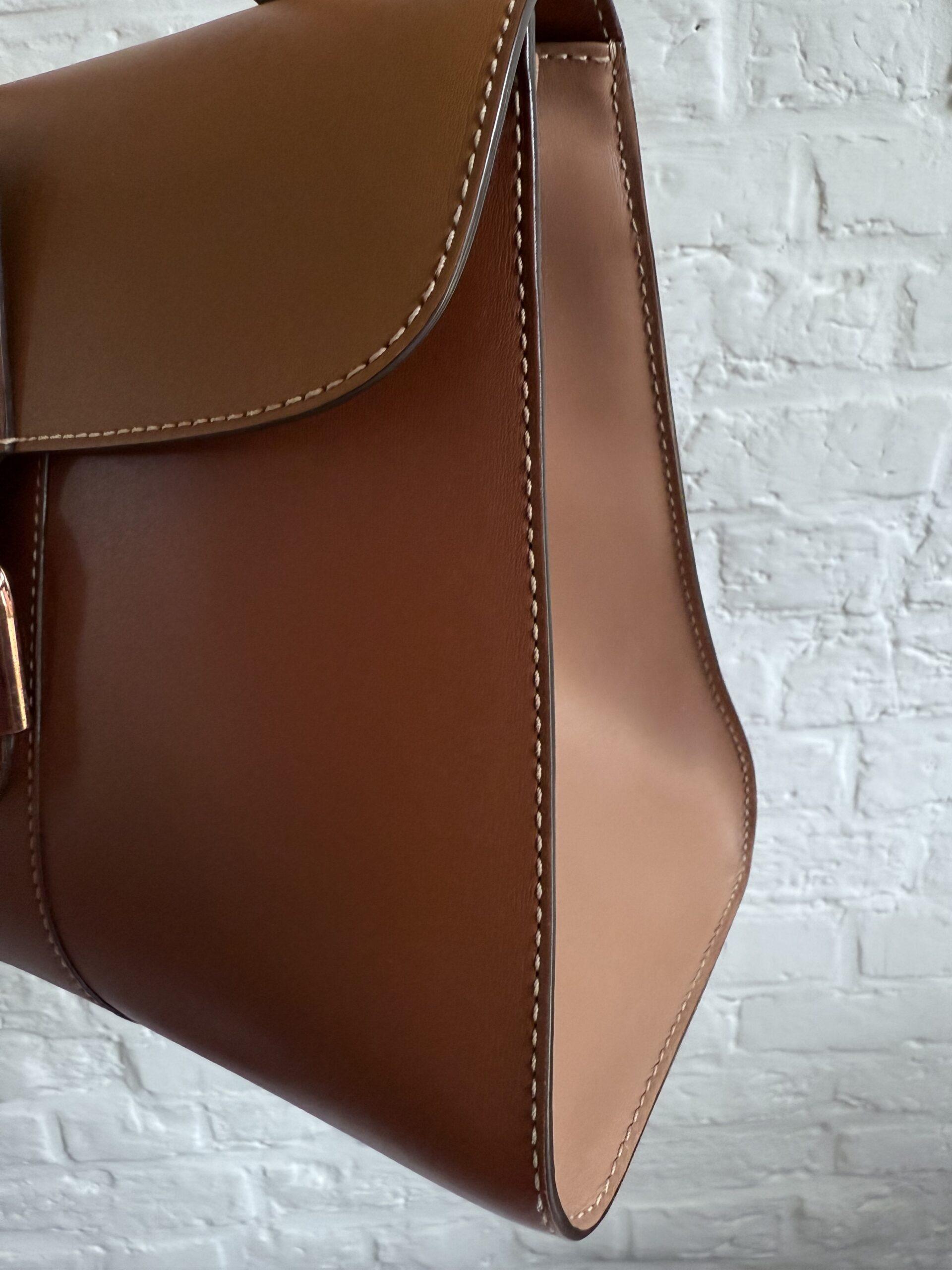 Hij komt in een 3-kleurige boxcalf: vison, fauve en brandy en is afgewerkt met een bronzen boekel.