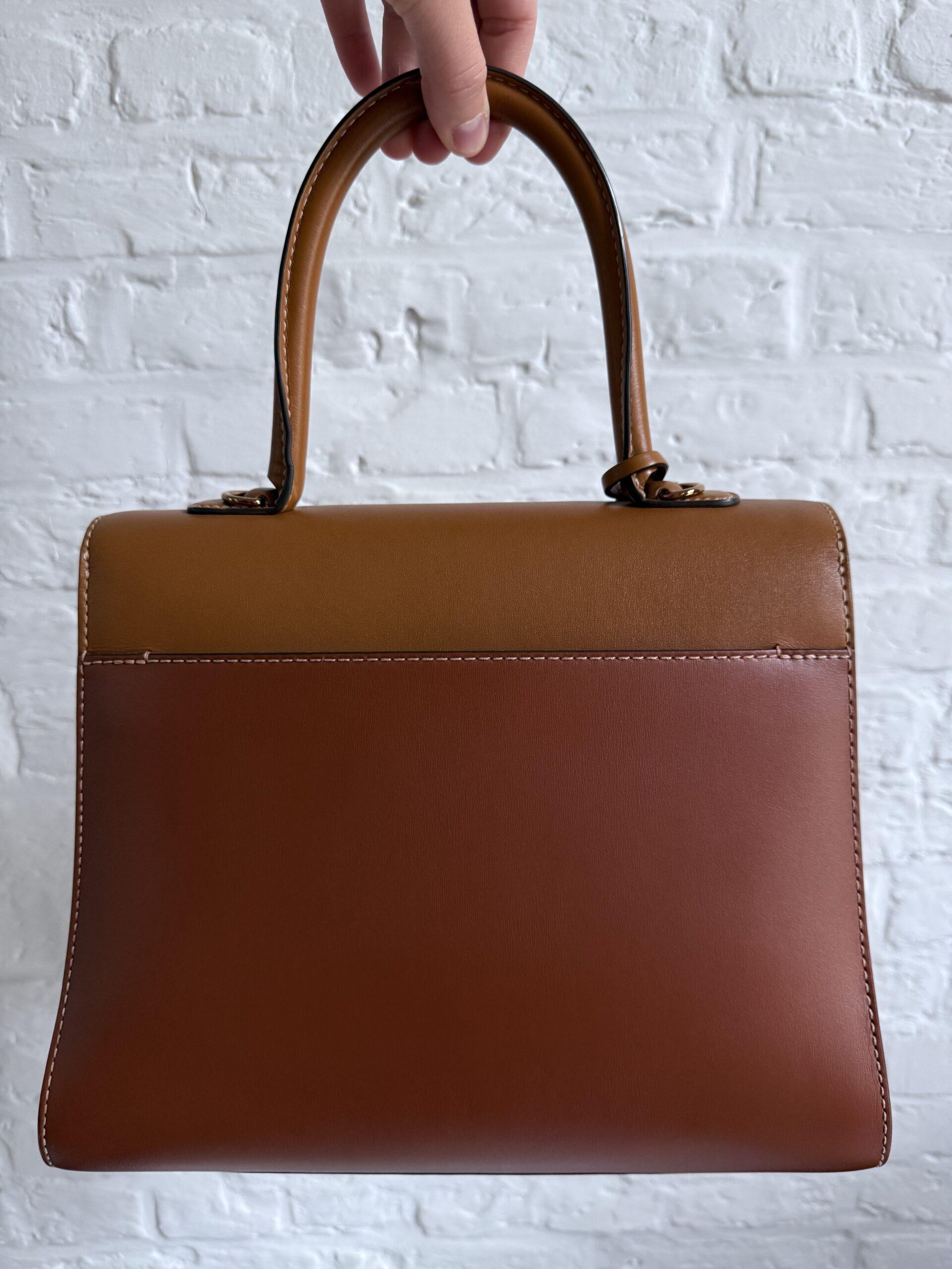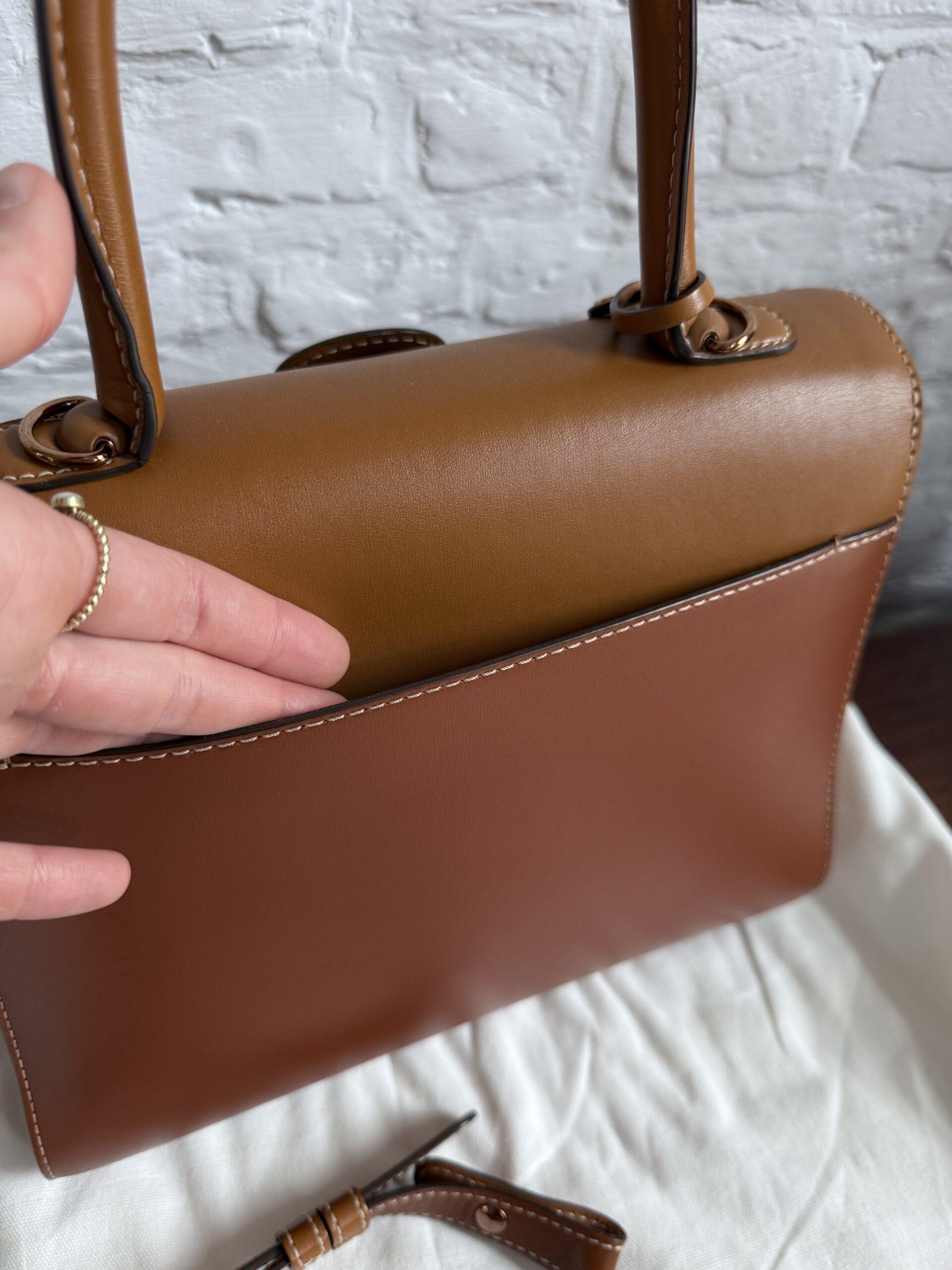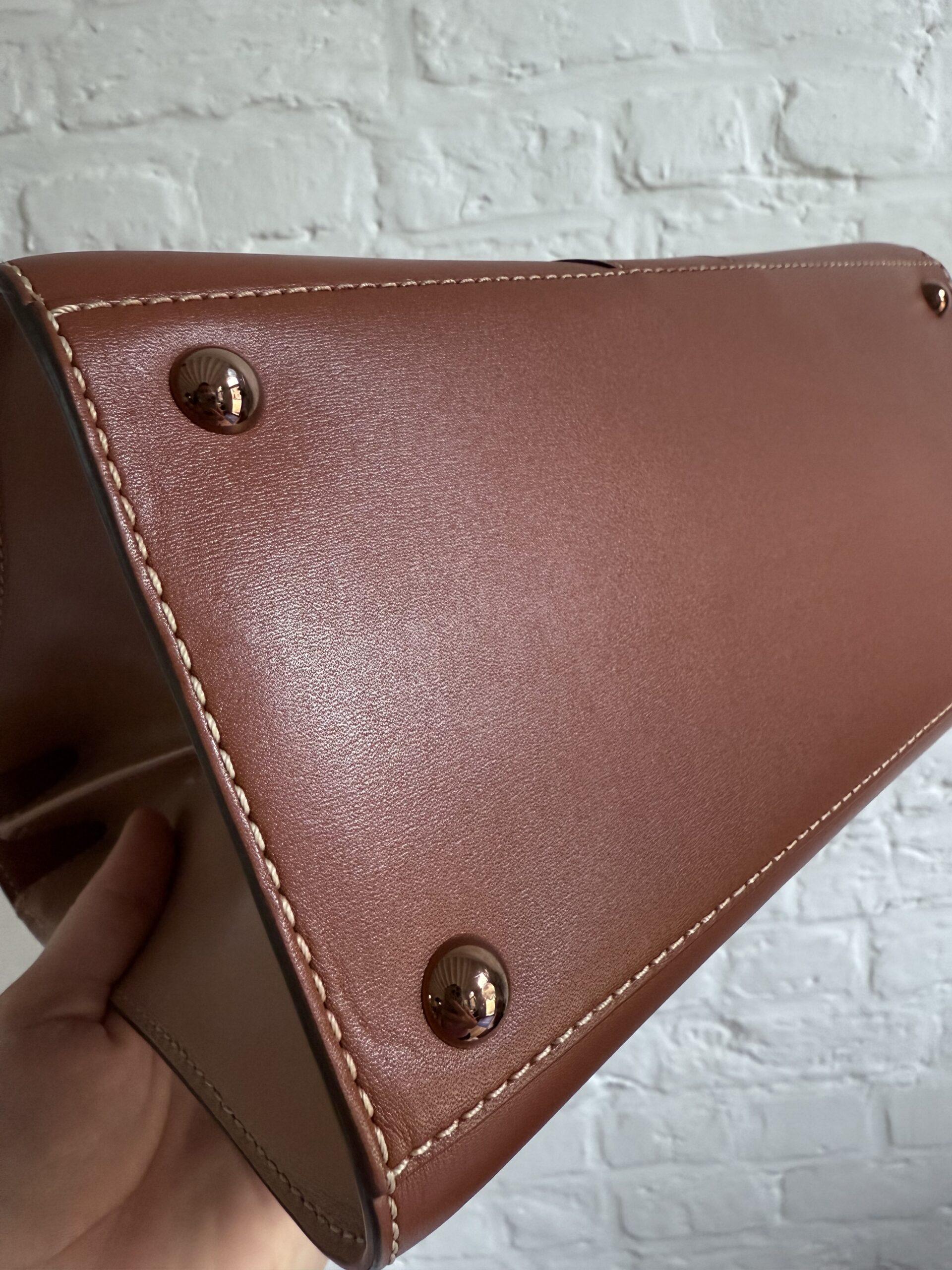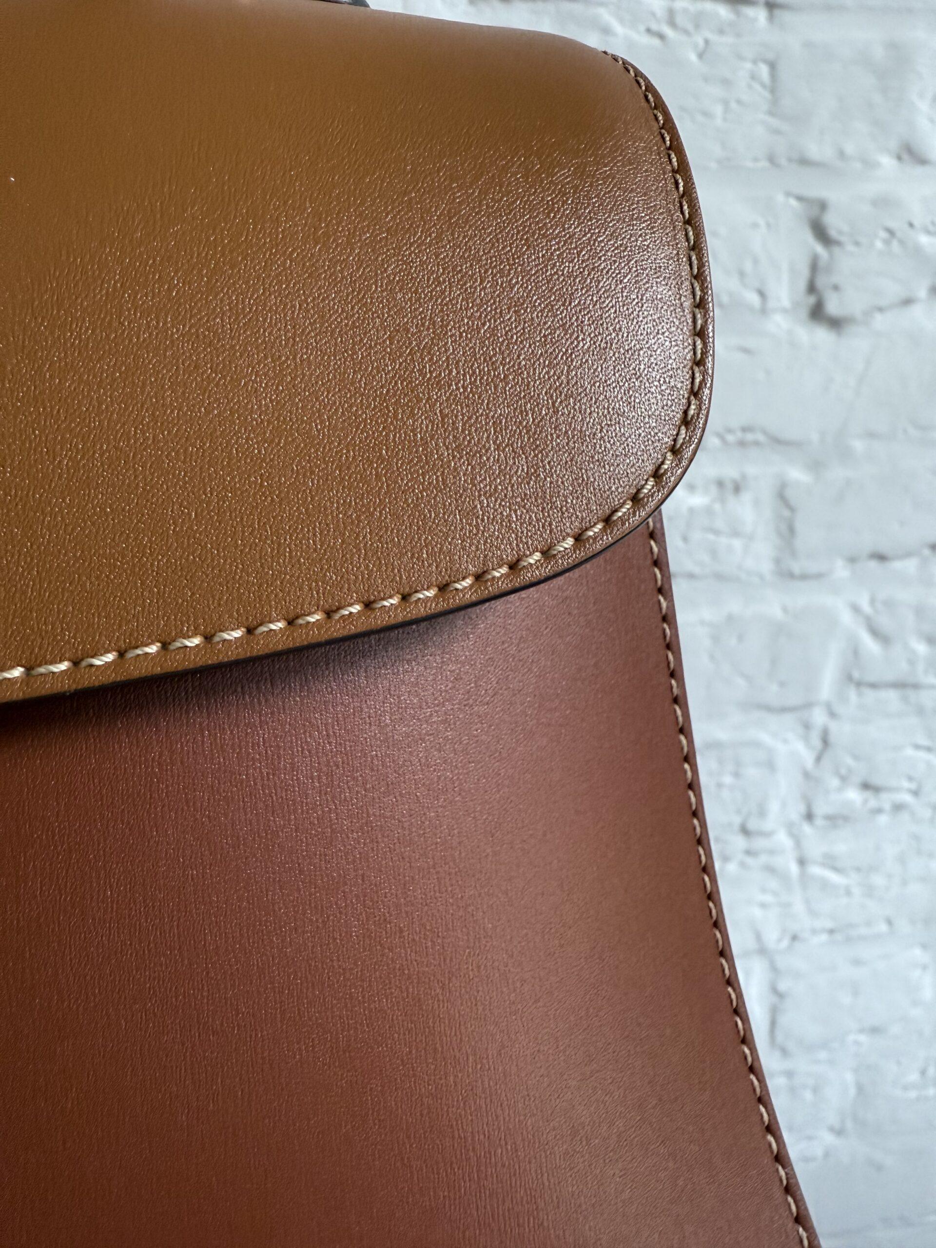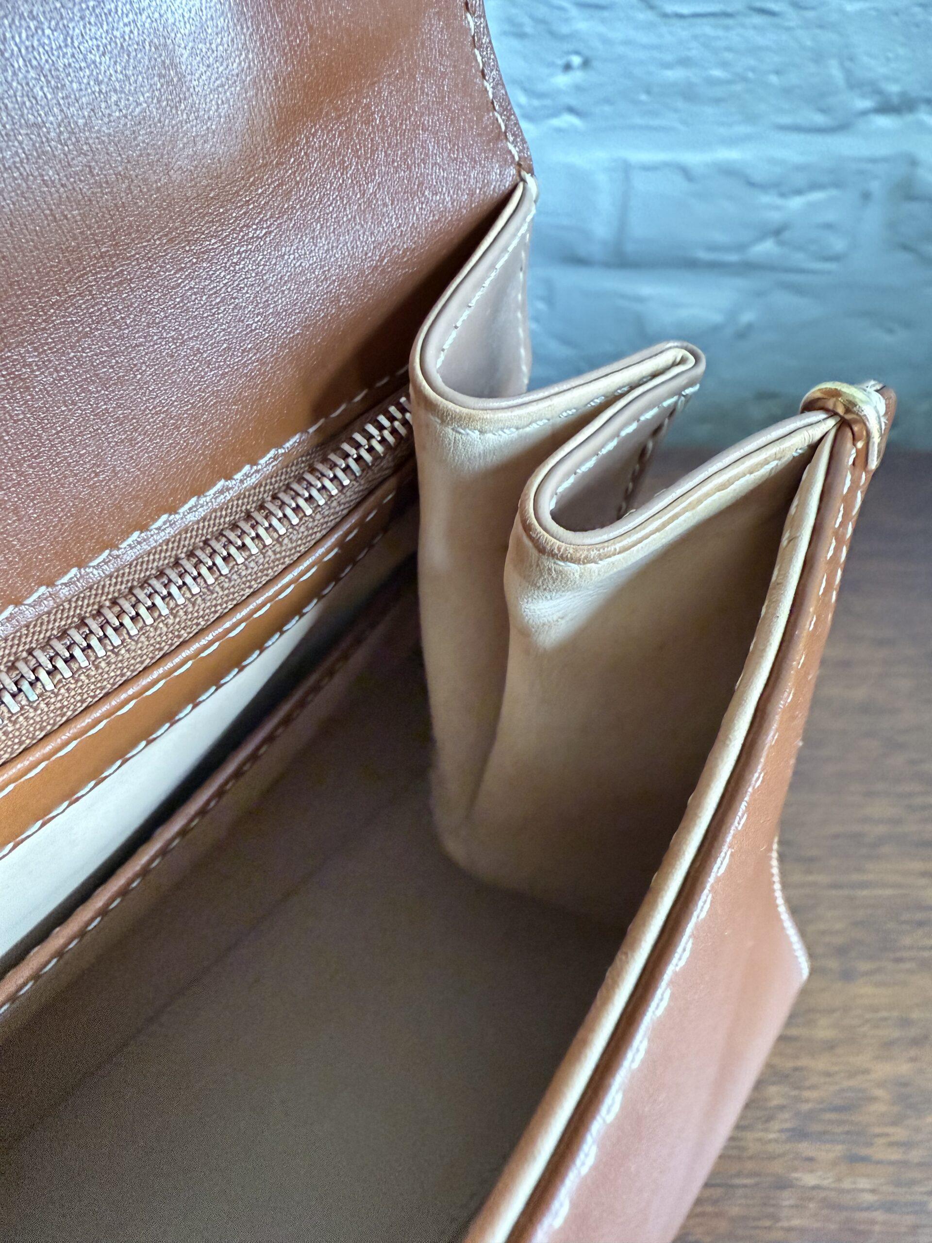Hij komt in een 3-kleurige boxcalf: vison, fauve en brandy en is afgewerkt met een bronzen boekel.