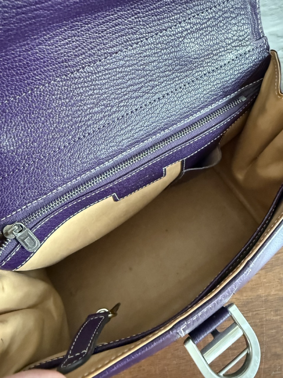 Het interieur is afgewerkt in bleek leder en telt twee zakjes: één met rits en één steekzakje.