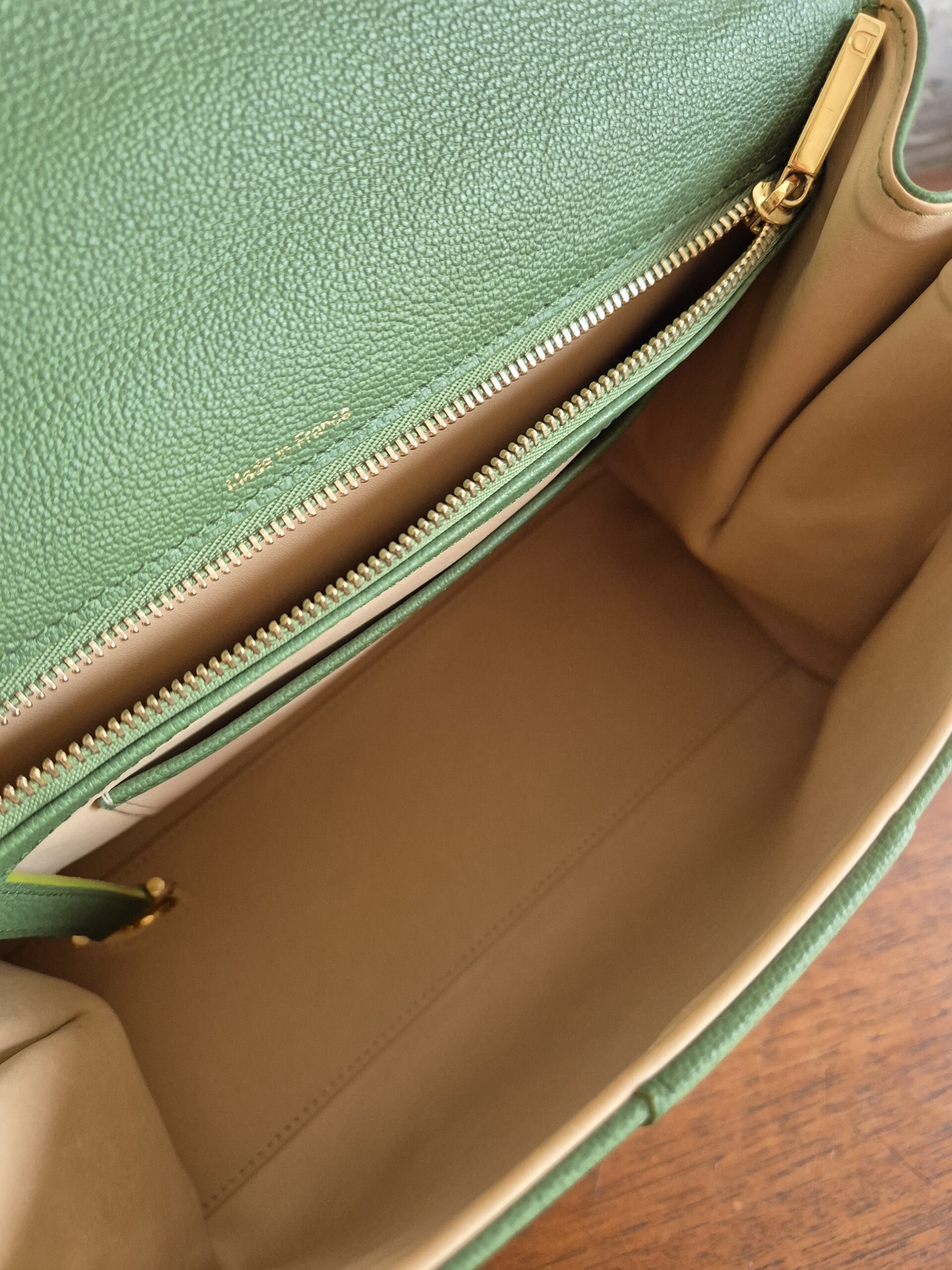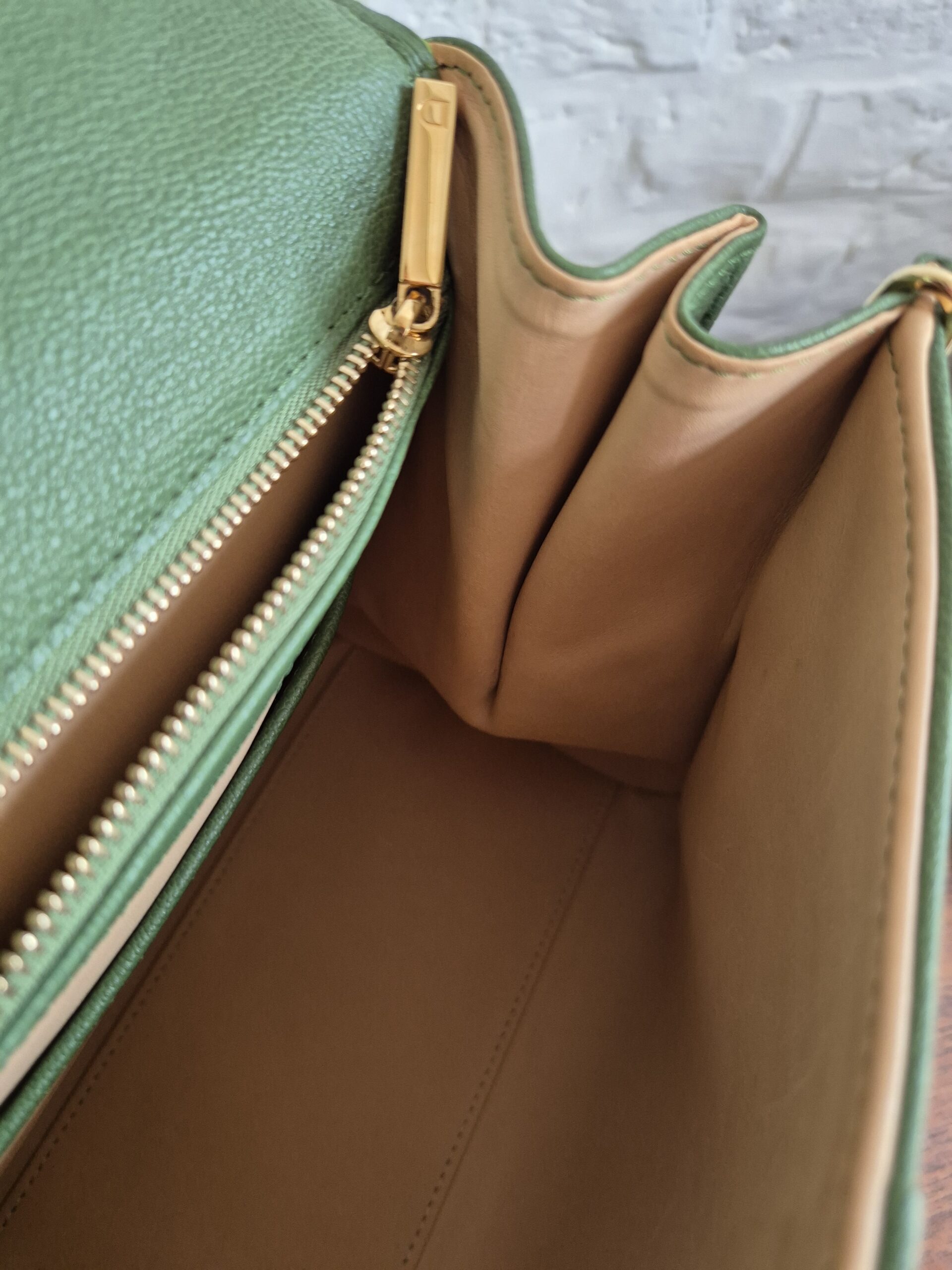 Het interieur is afgewerkt in bleke box calf en telt twee zakjes: één met rits en één steekzakje.