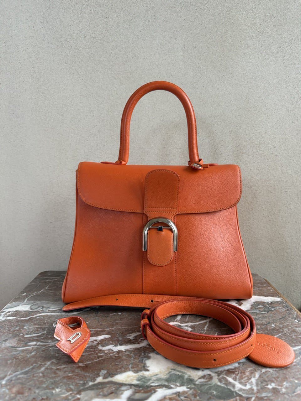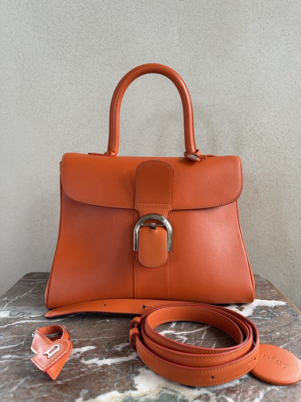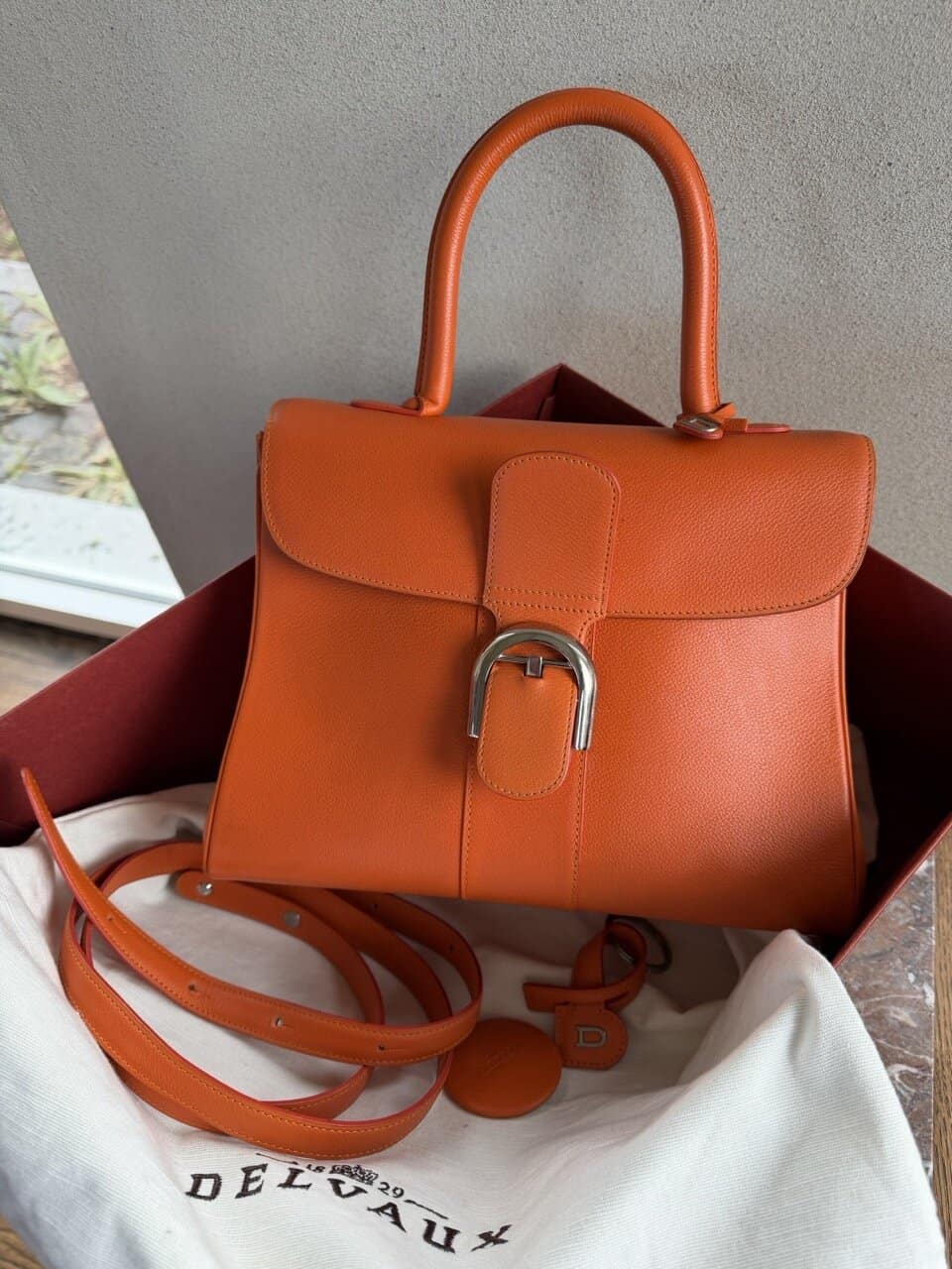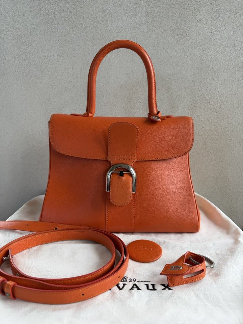 | Accessories | Authentieke Delvaux stofzak, Doos, Riem, Spiegel |