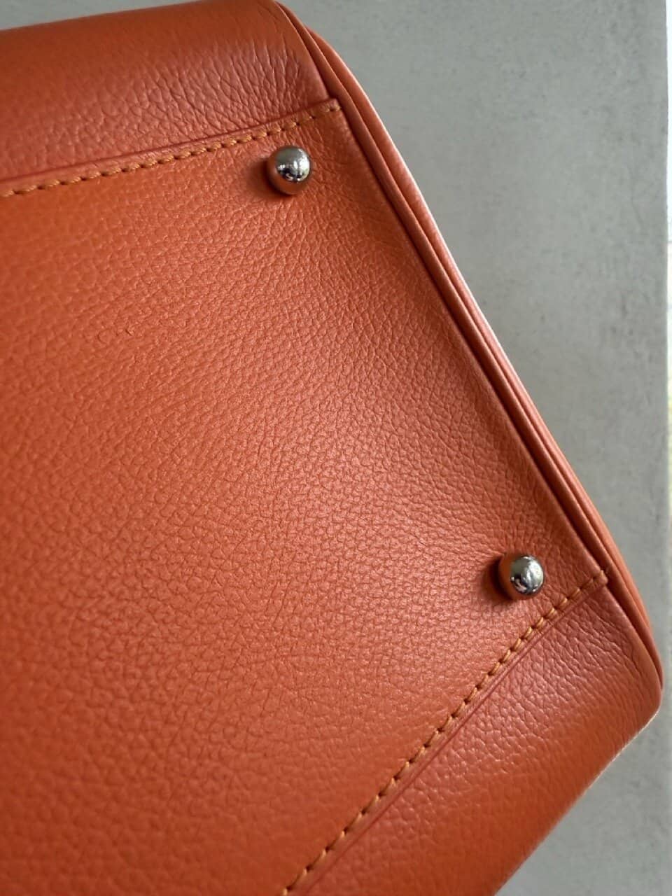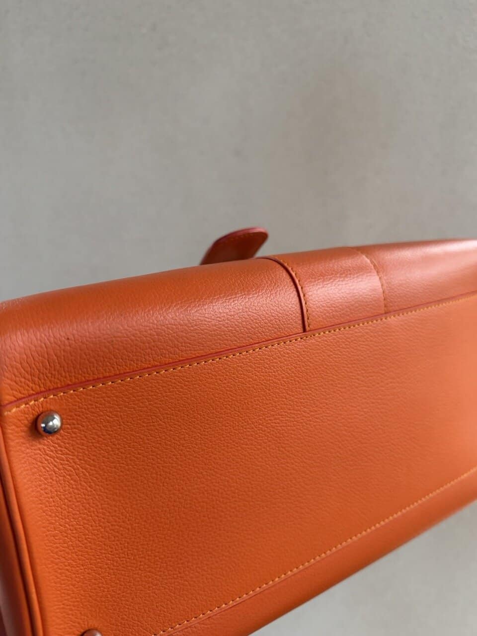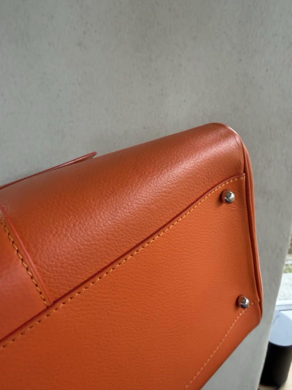 De Brillant is afgewerkt met gele stiksels en terracotta kleurige kantverf. Mooie details.