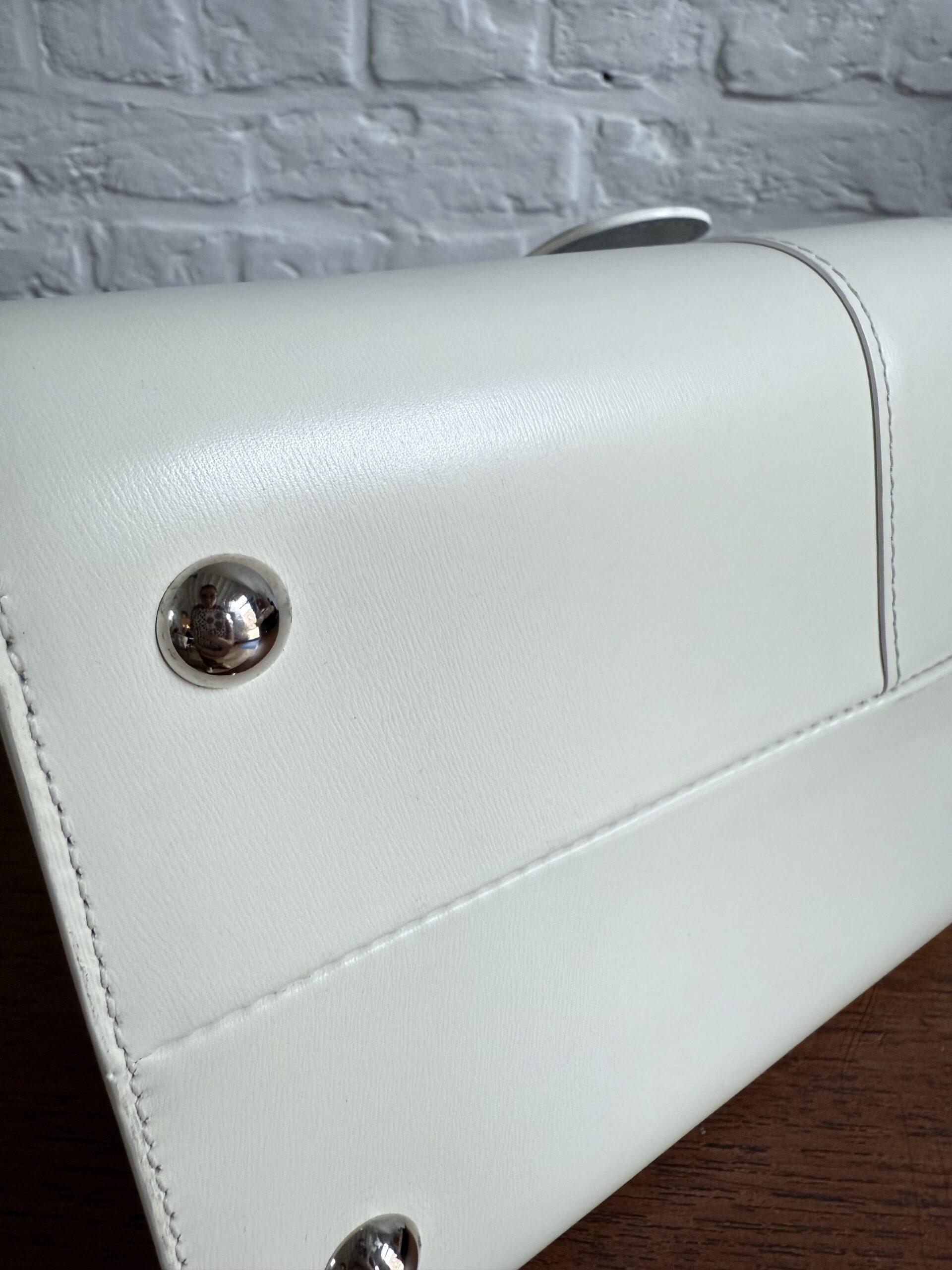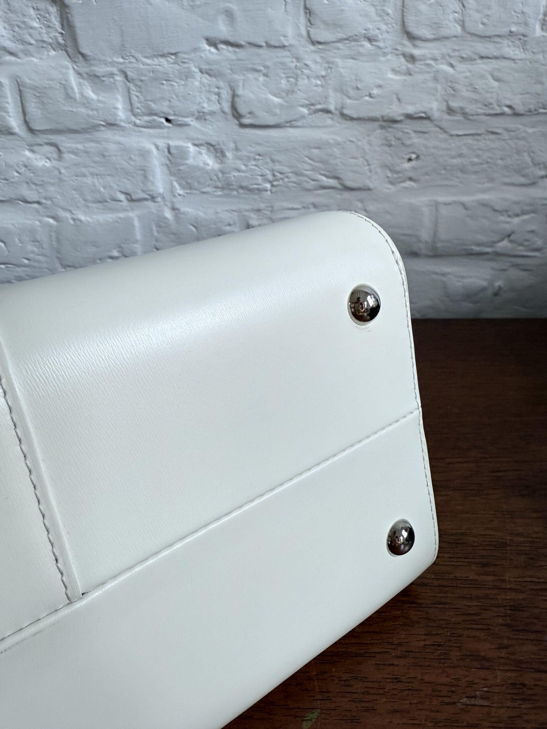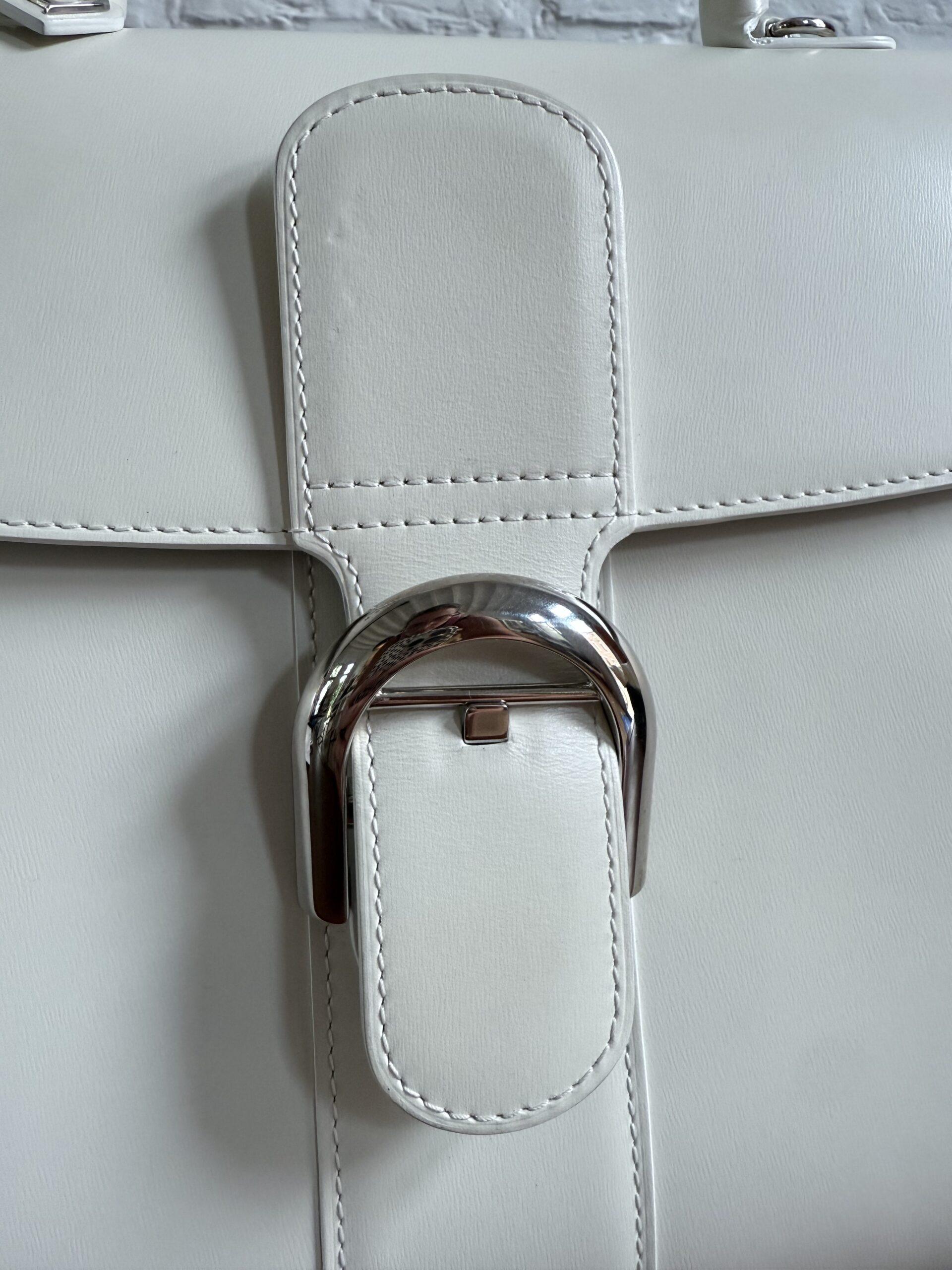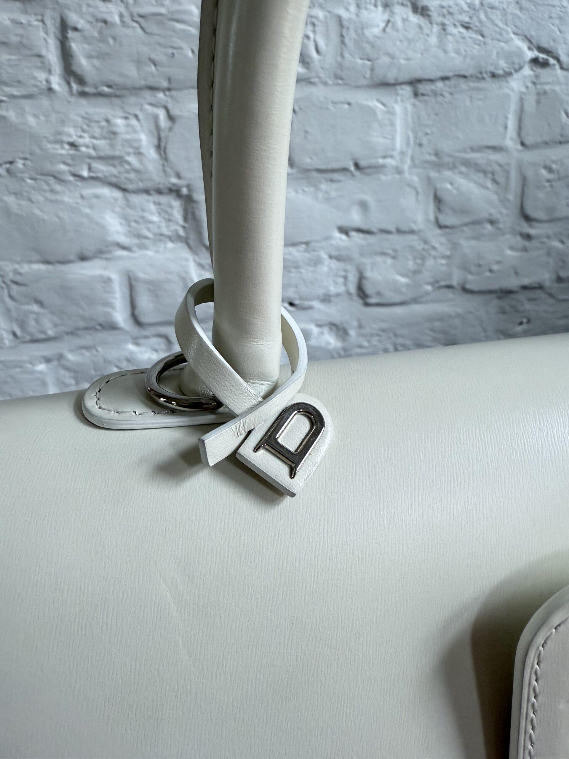 Het handvat en de riem zijn dan weer afgewerkt met zilveren kantverf, de rest van de tas in het wit.