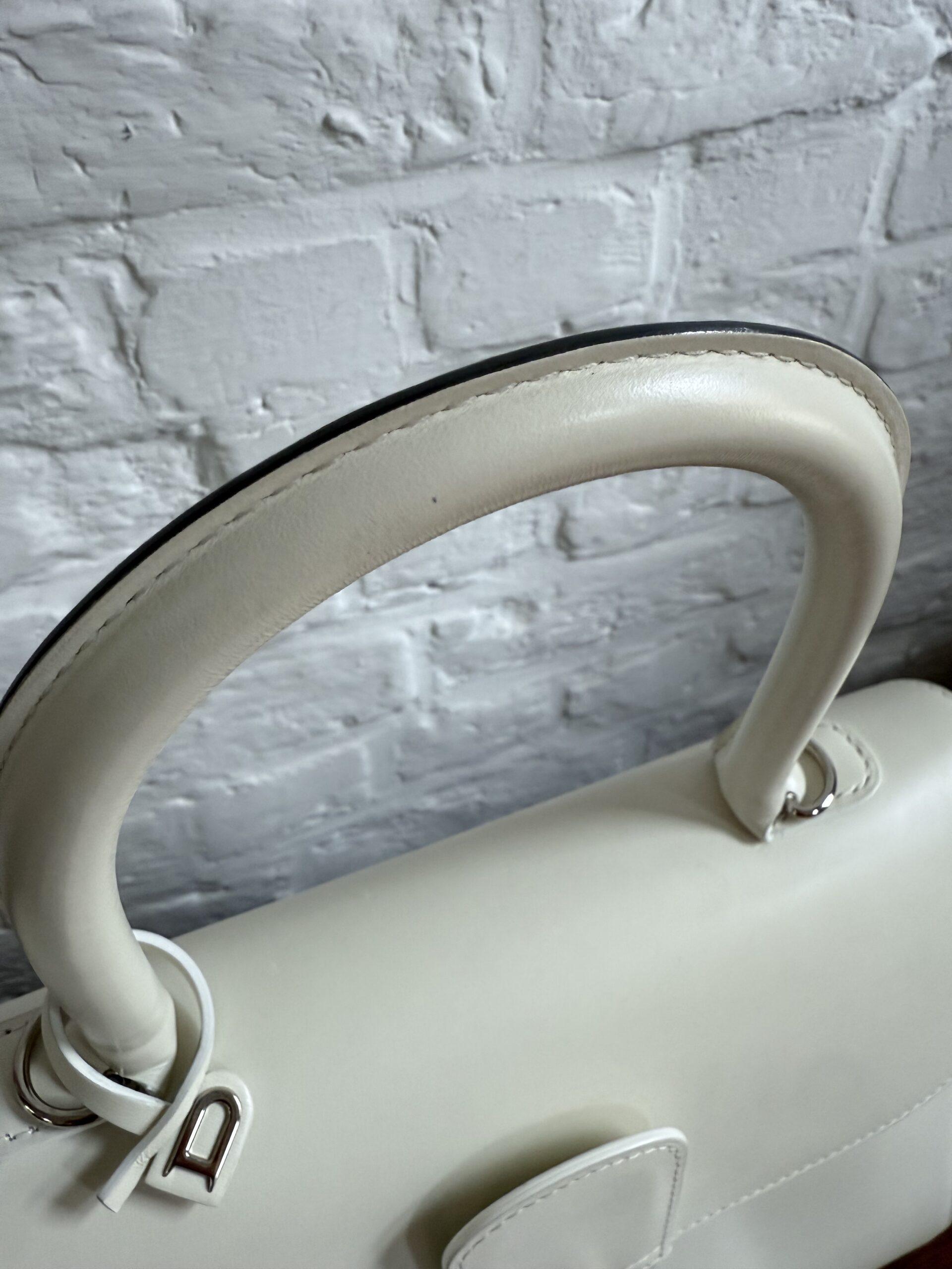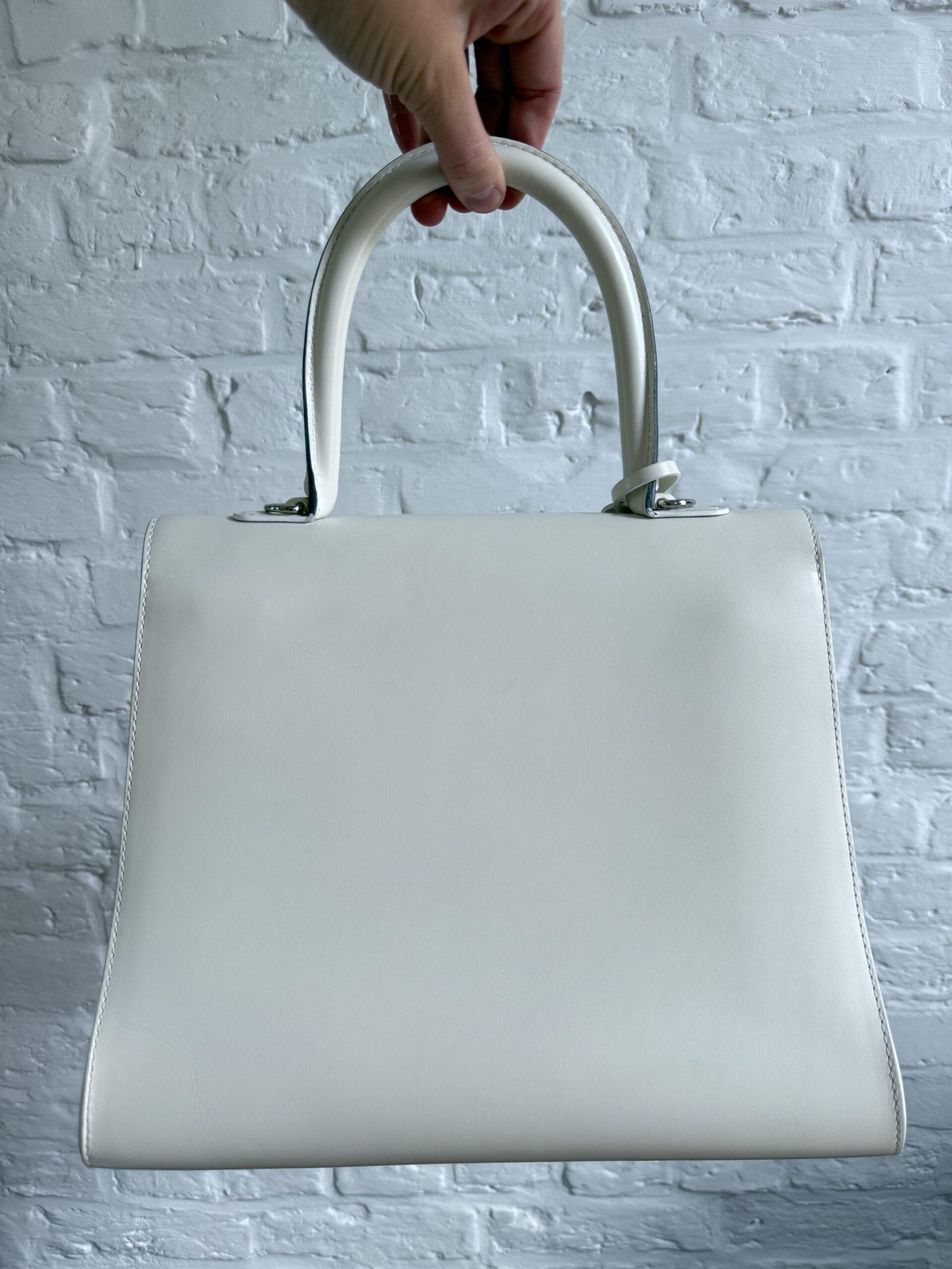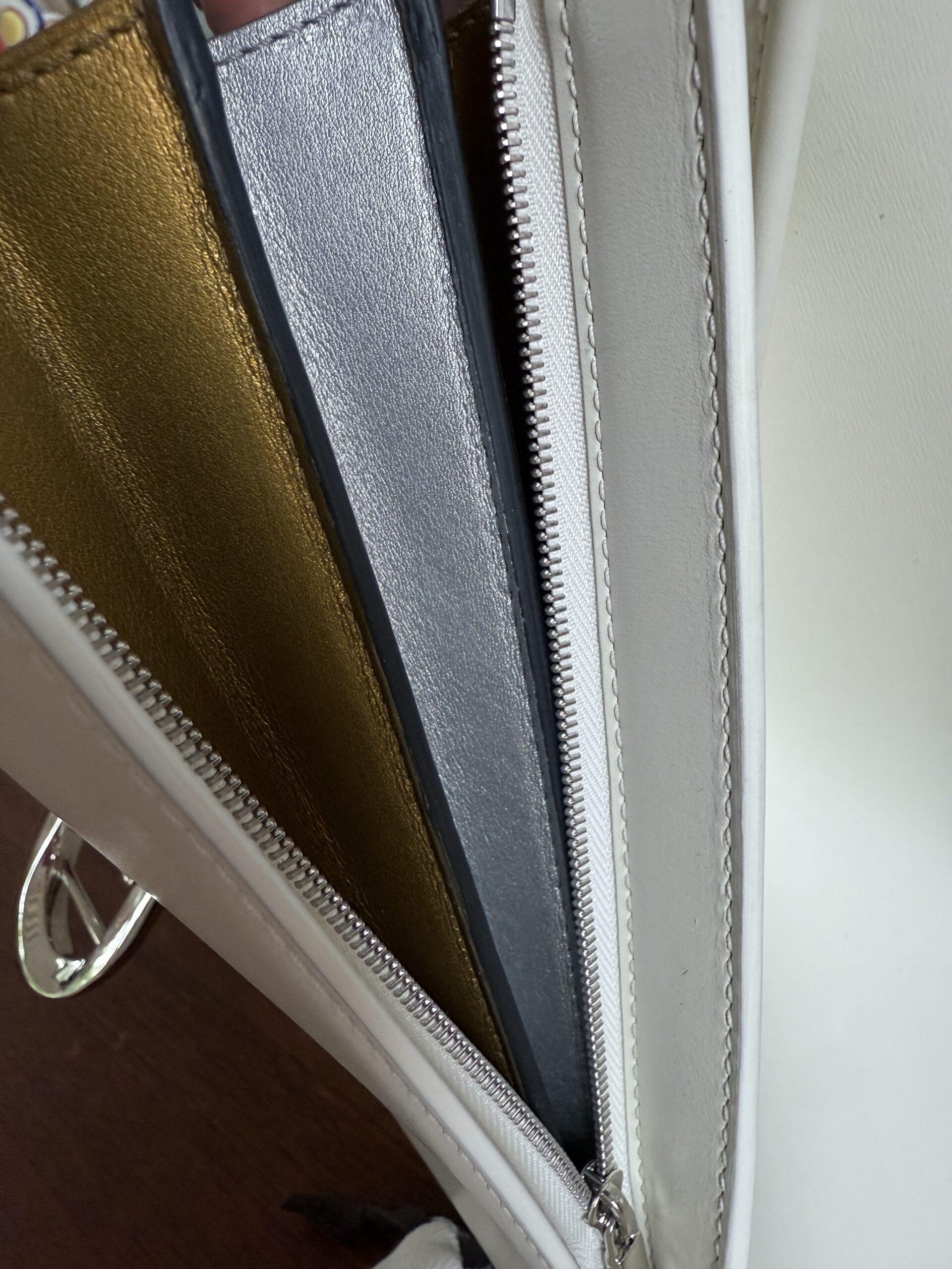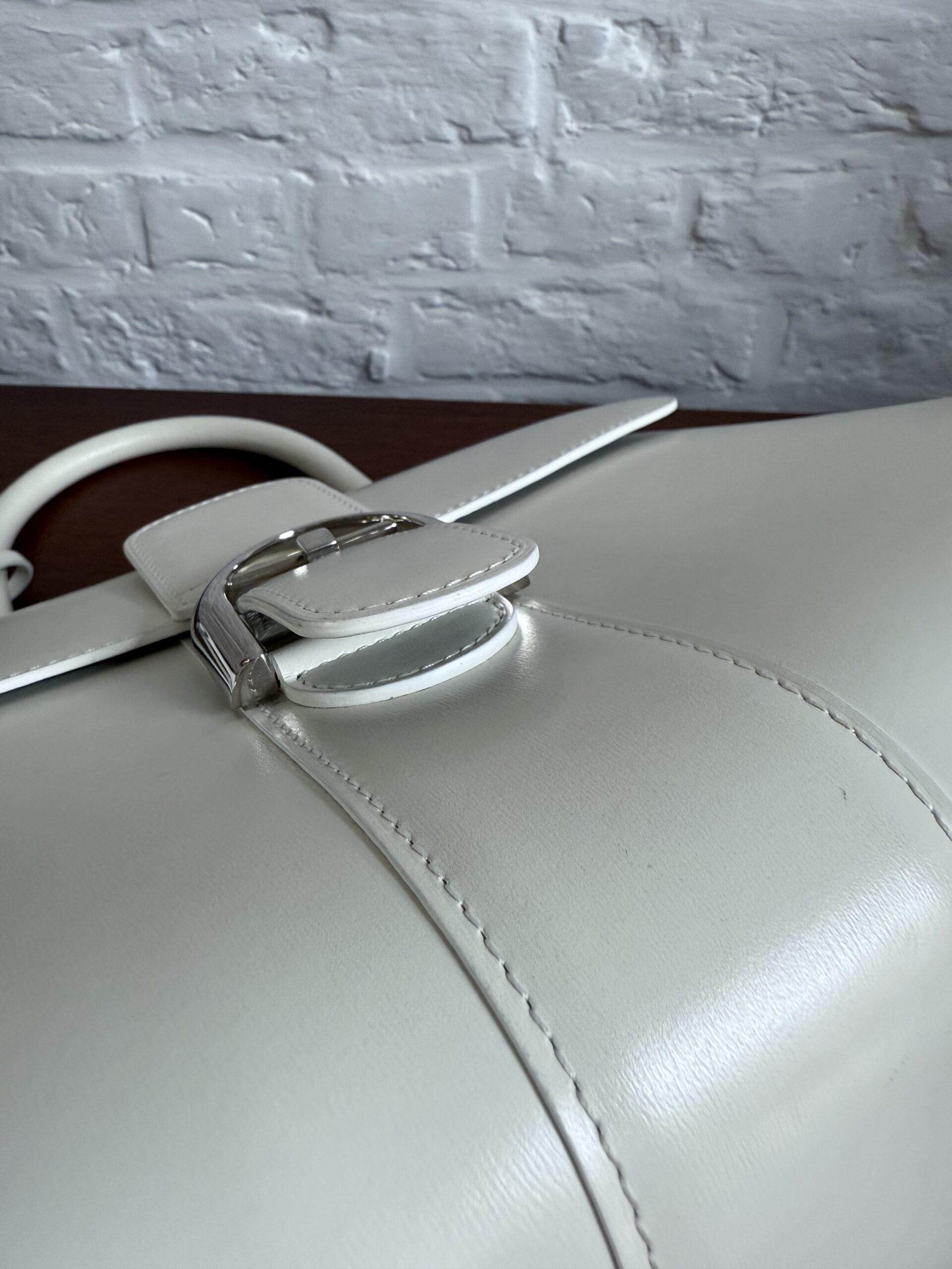 Het handvat en de riem zijn dan weer afgewerkt met zilveren kantverf, de rest van de tas in het wit.
