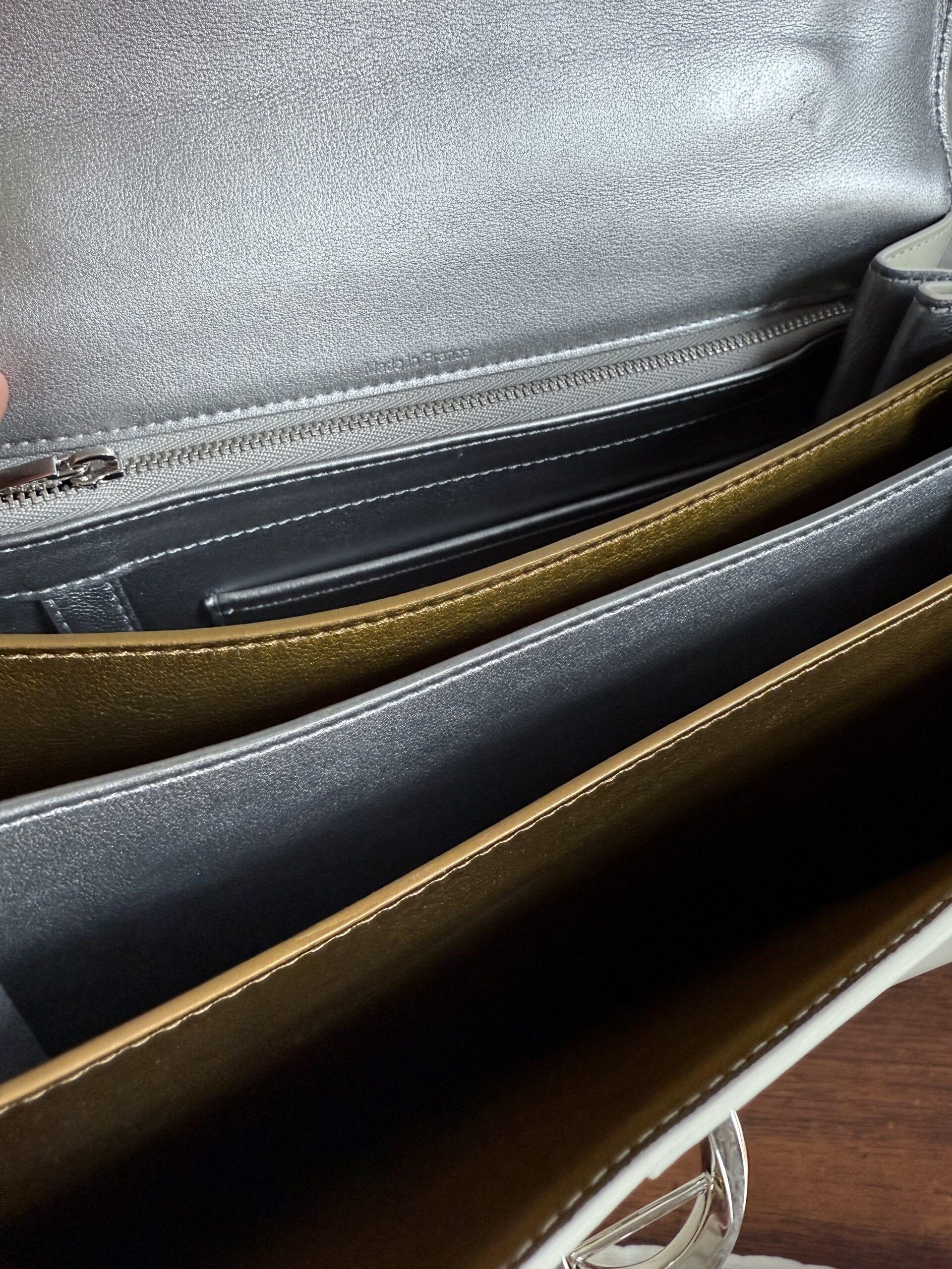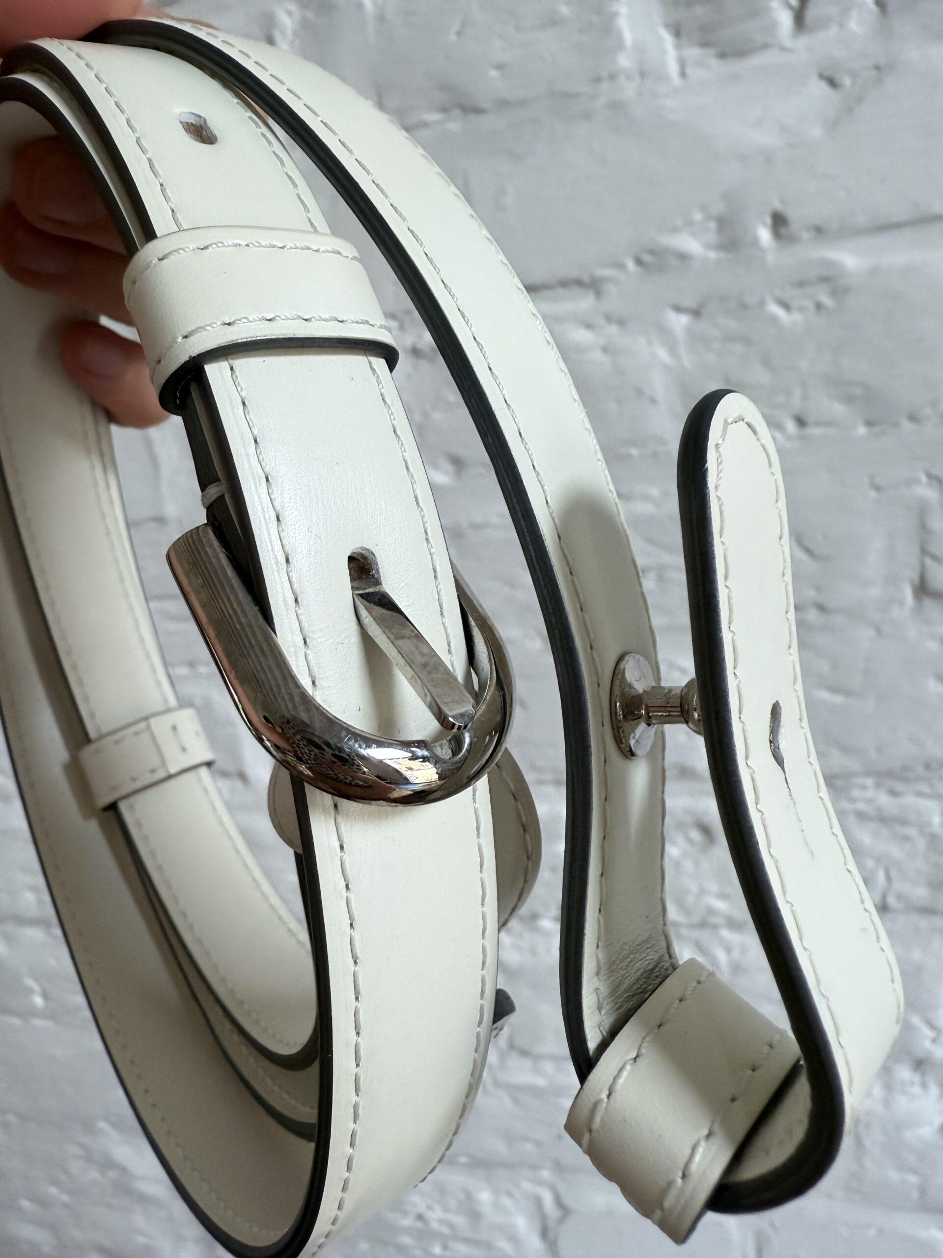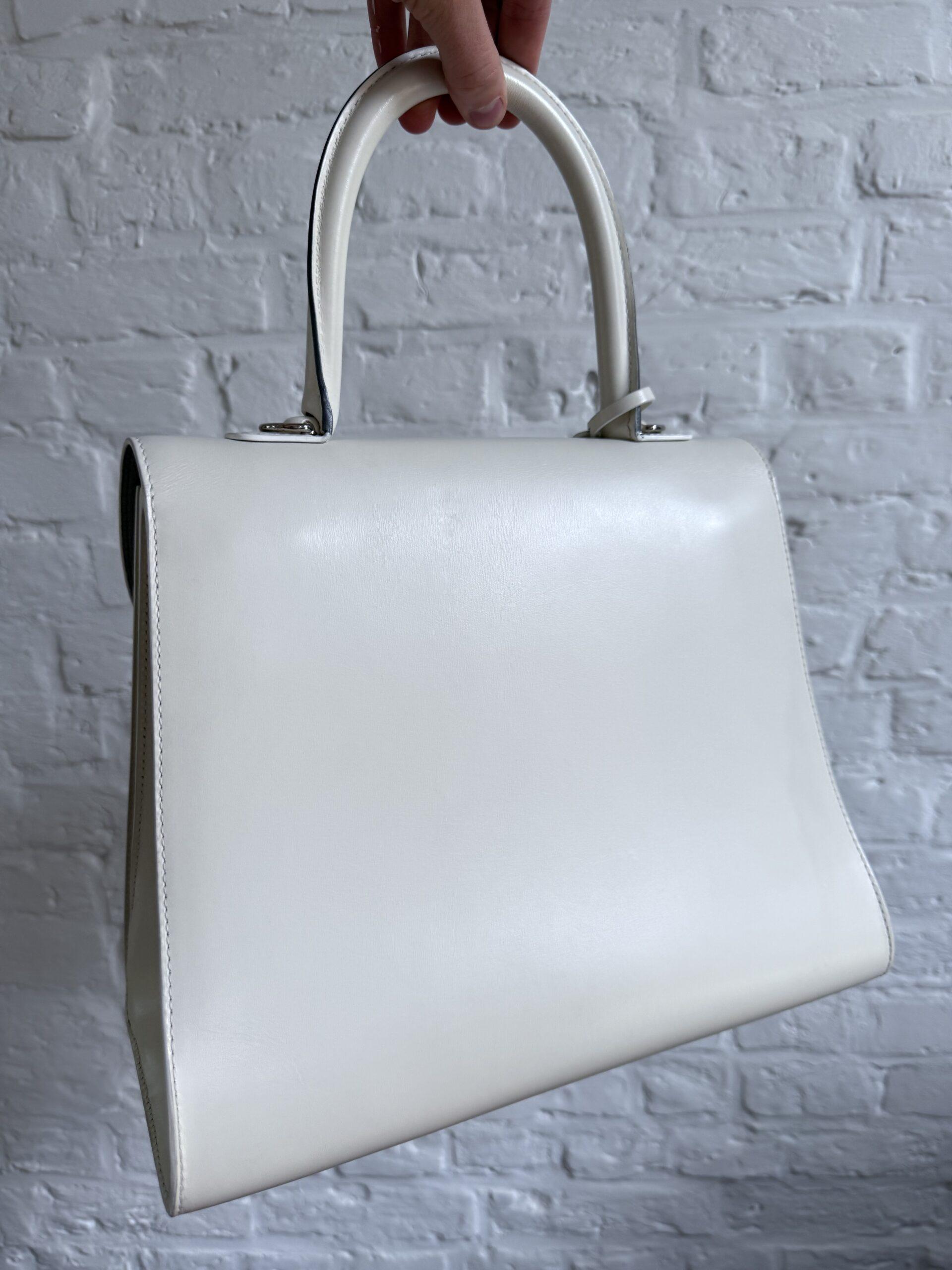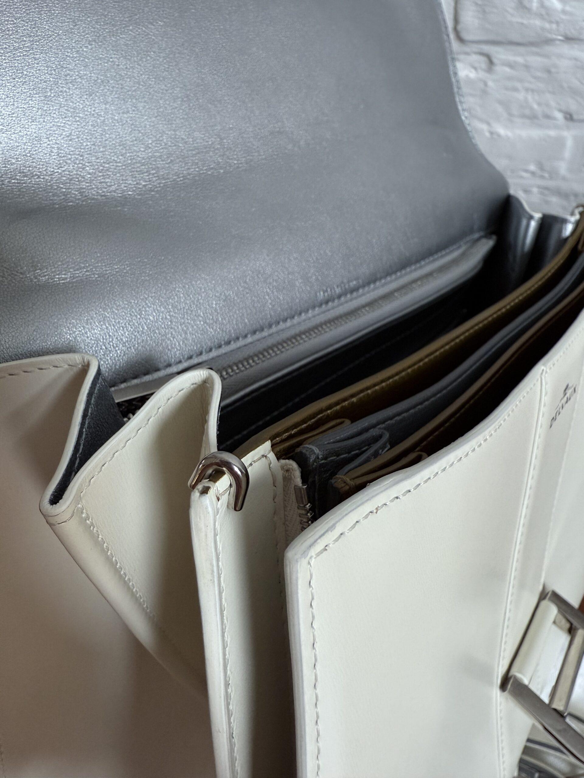 Het handvat en de riem zijn dan weer afgewerkt met zilveren kantverf, de rest van de tas in het wit.