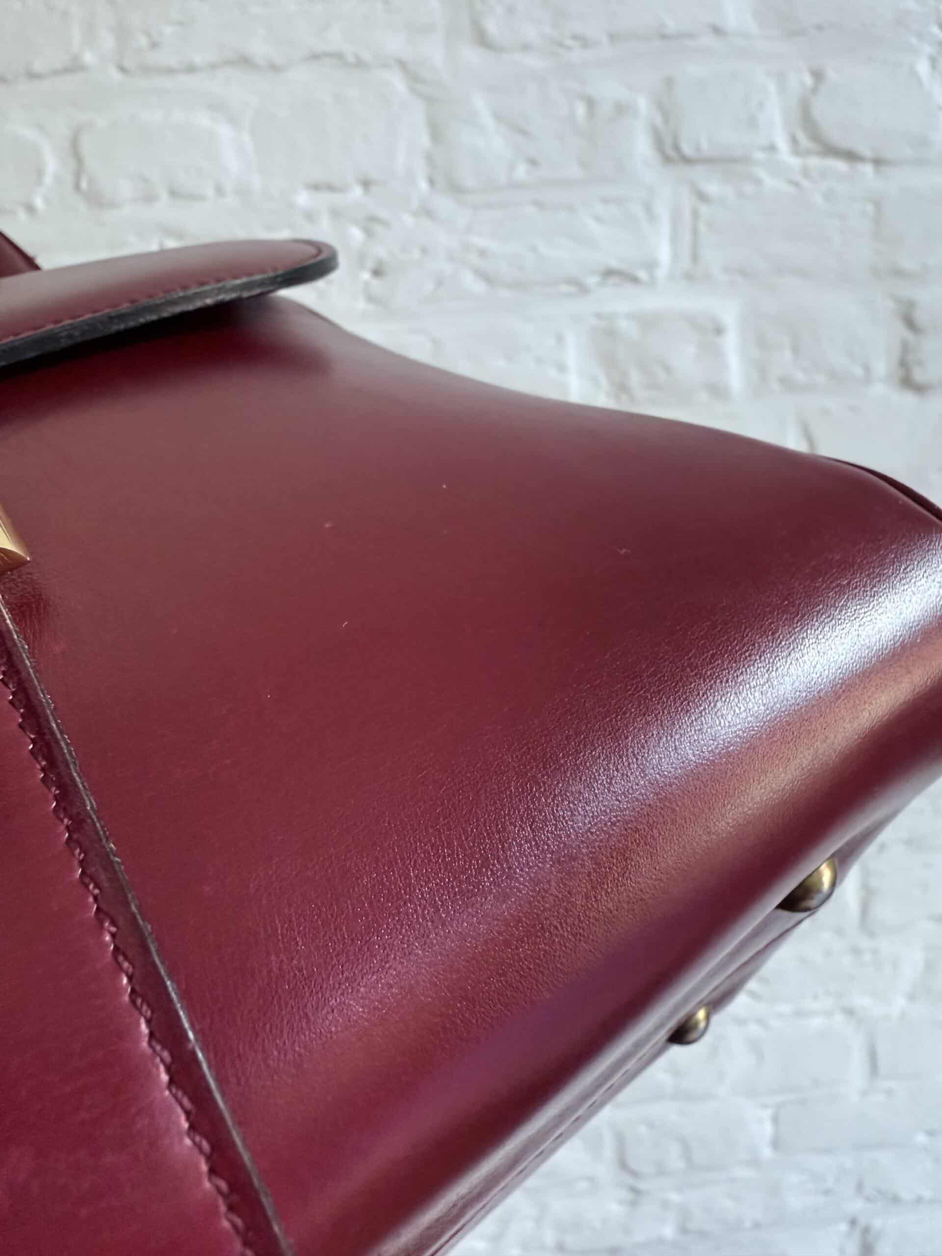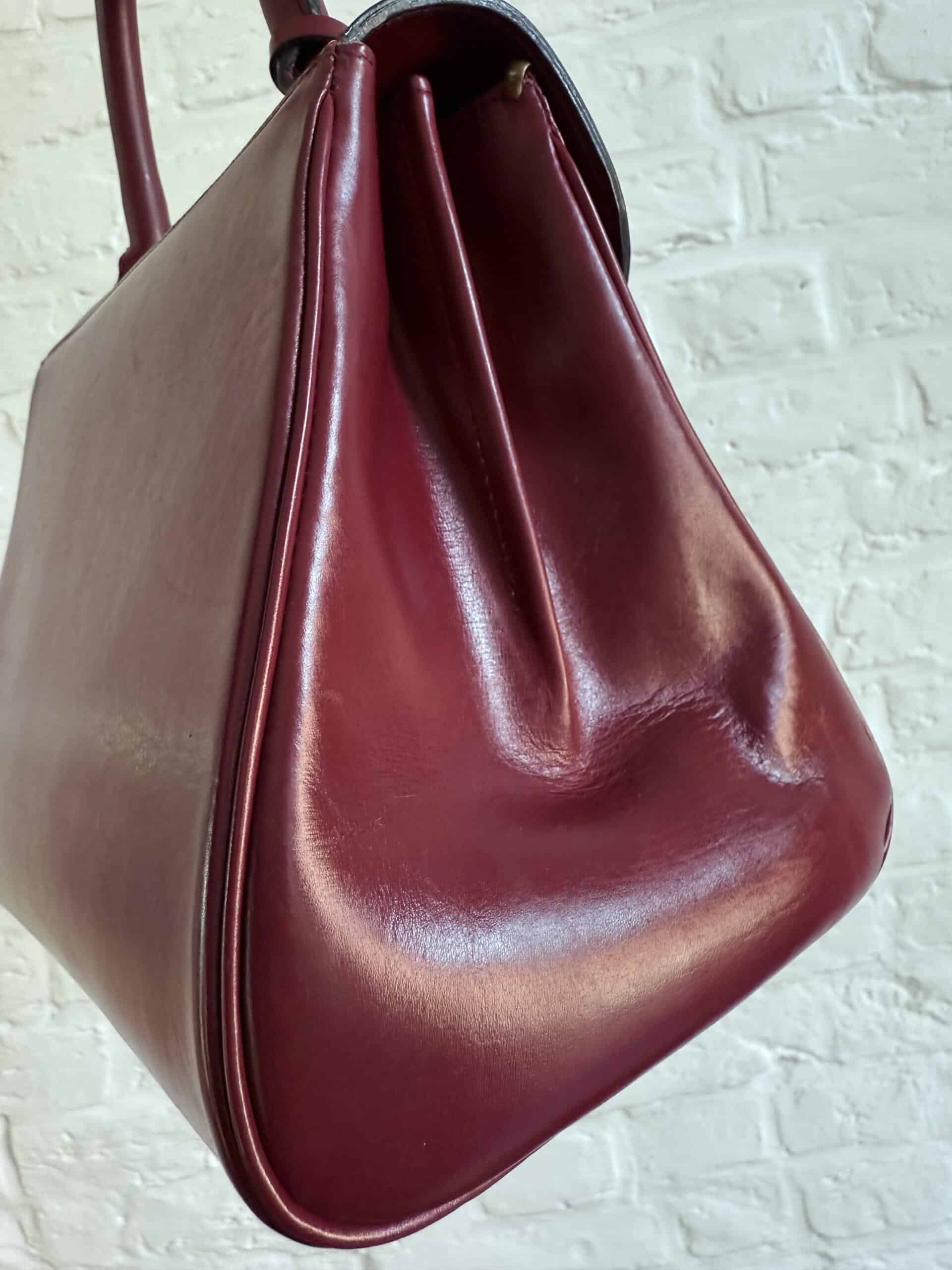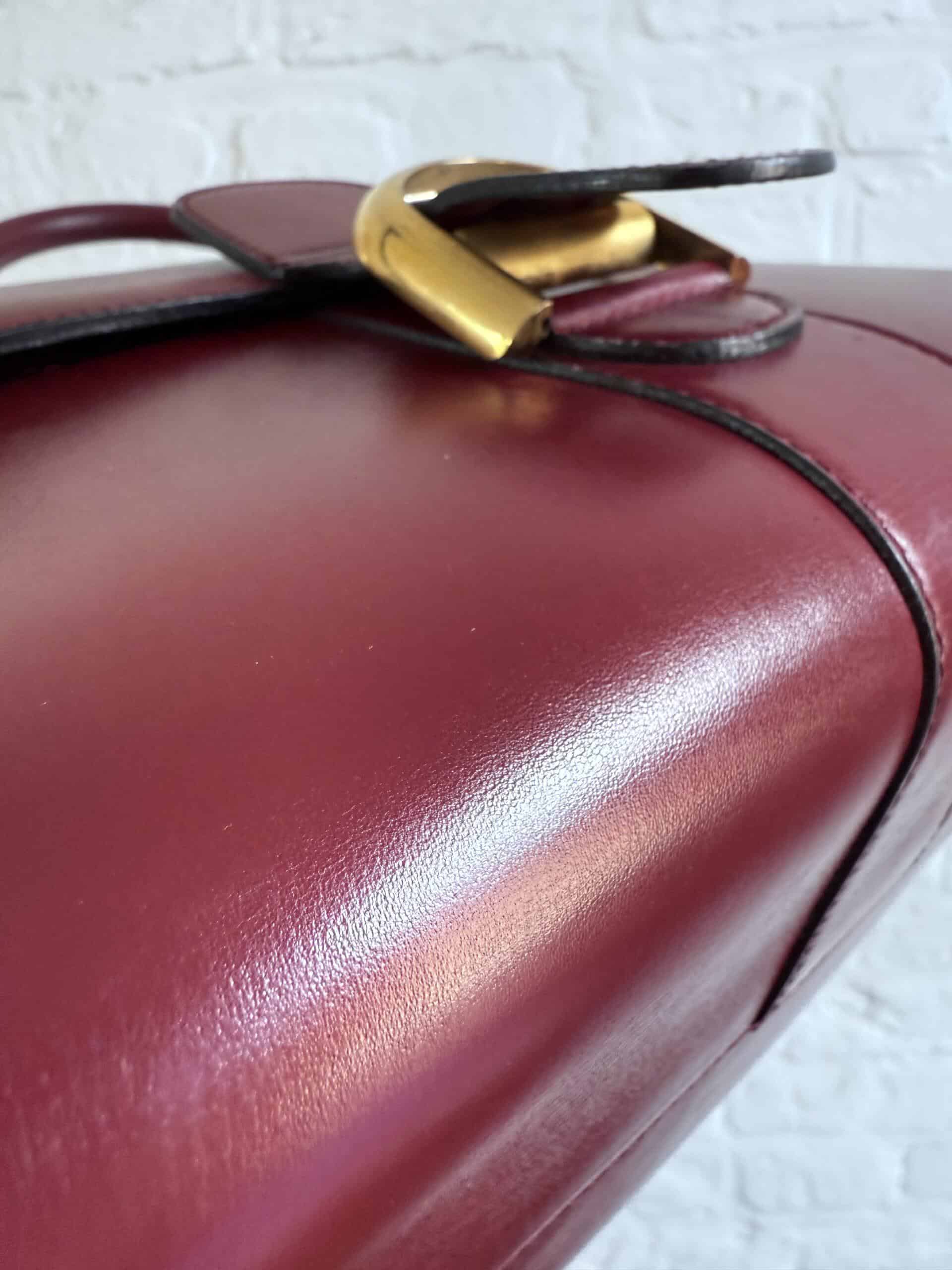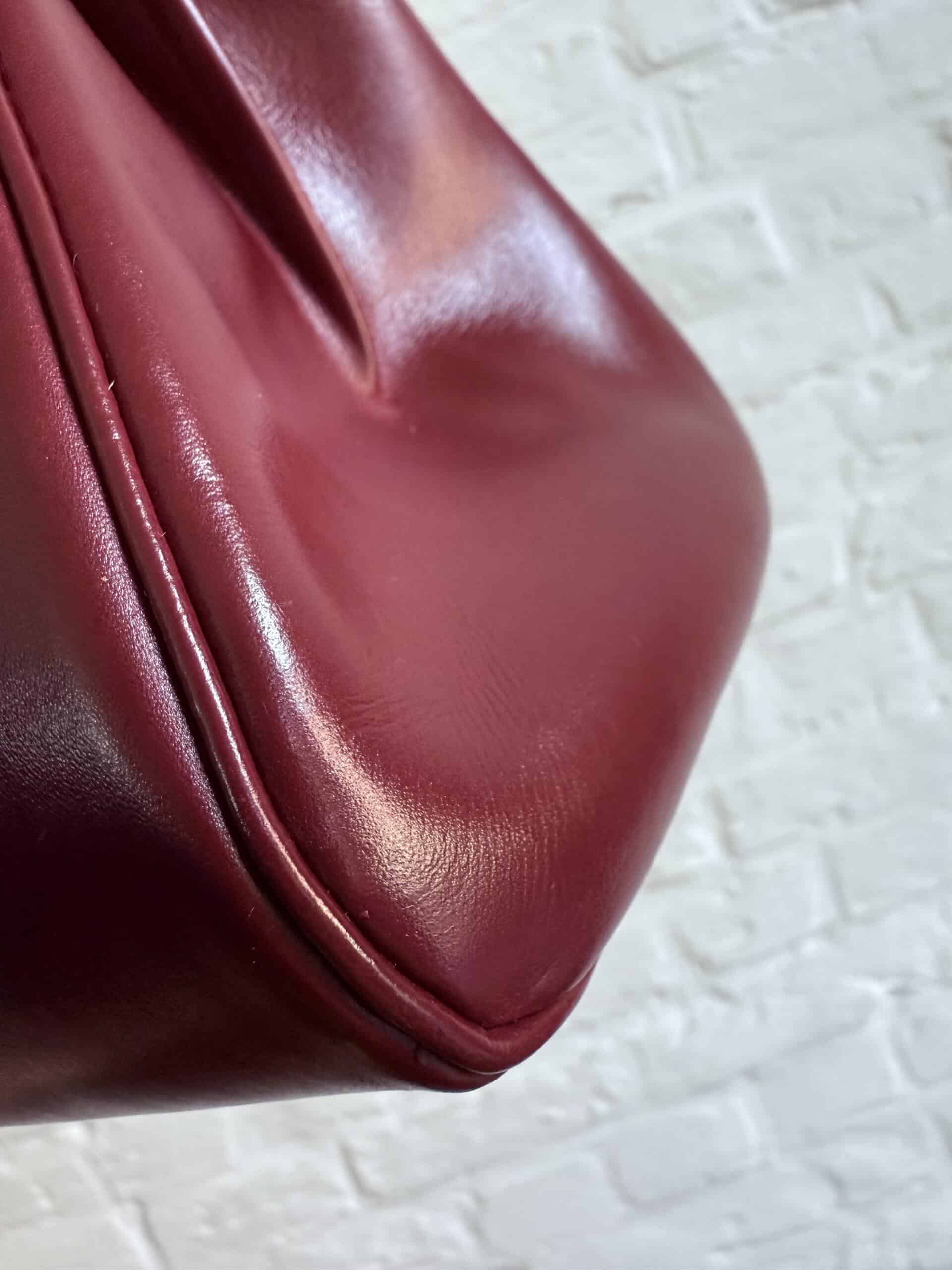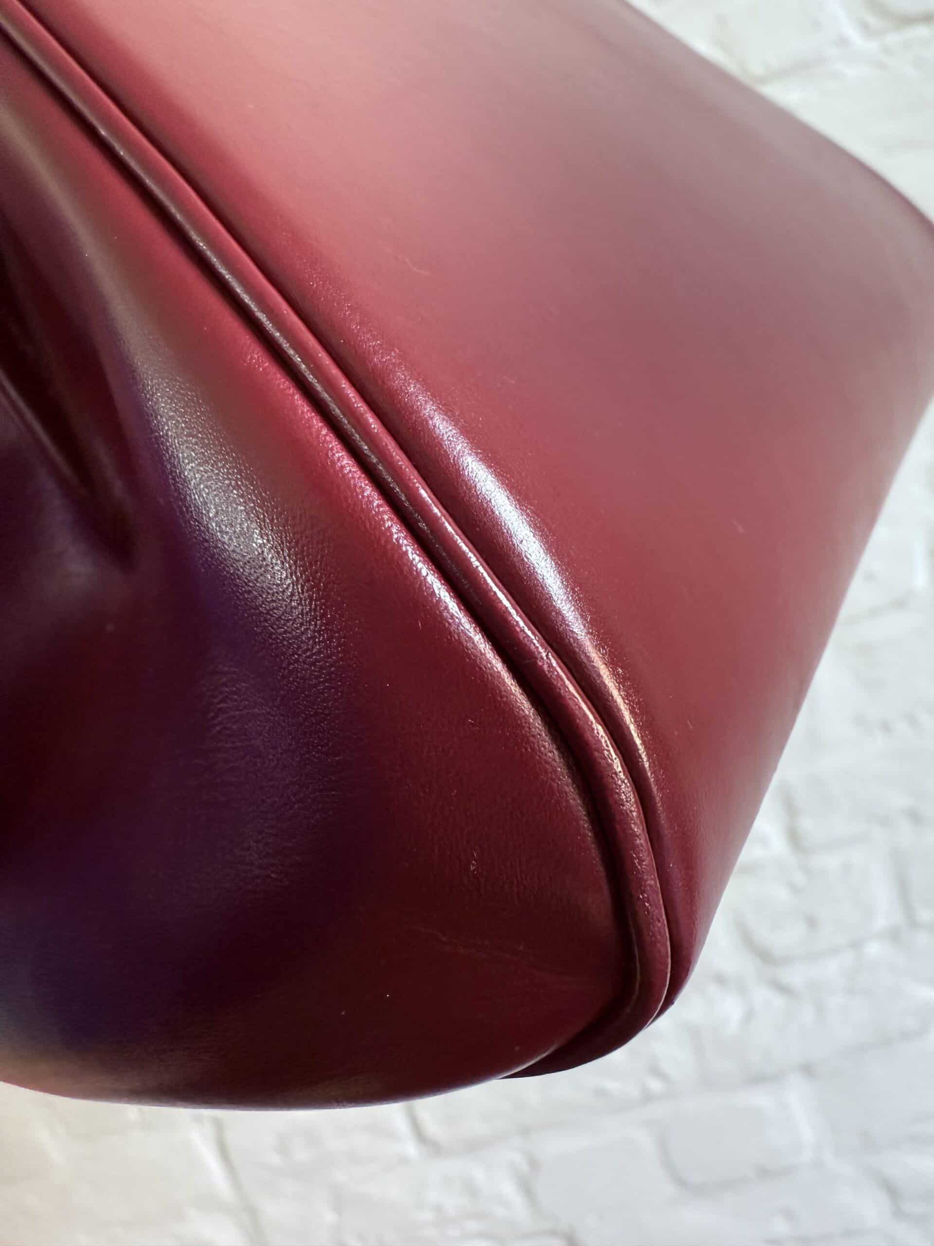 Een vintage Brillant PM in een ongelofelijk mooie uitvoering van Ruby Jumping Calf. Ongelofelijk mooi, en ook de conditie van de tas is om duimen en vingers bij af te likken. In heel mooie vorm; kijk maar naar die rug en dat handvat. De boekel blinkt als een spiegel en vertoont weinig tot geen krassen.