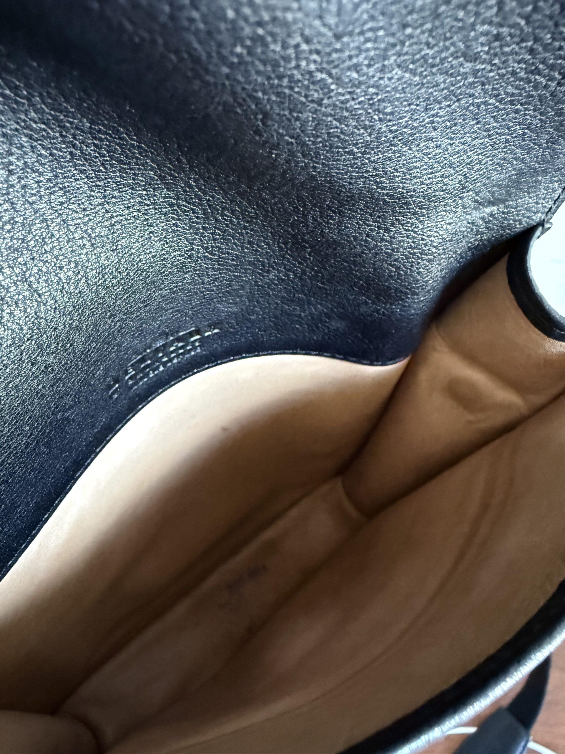 Hij komt in zwart kalfsleder met een bleek lederen interieur. De hardware is in geborsteld zilver.