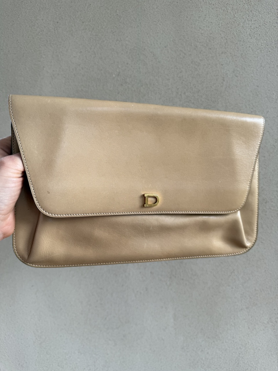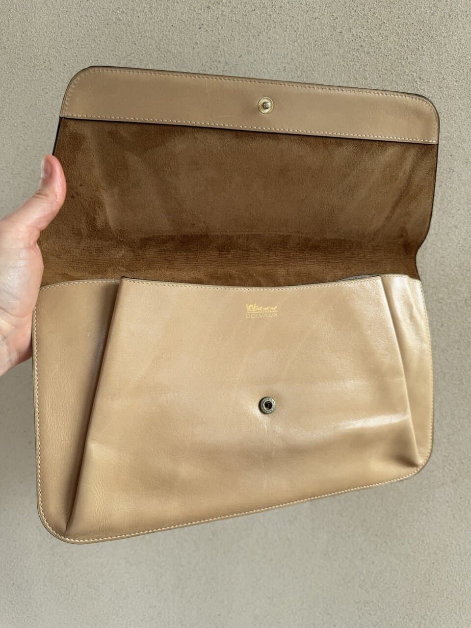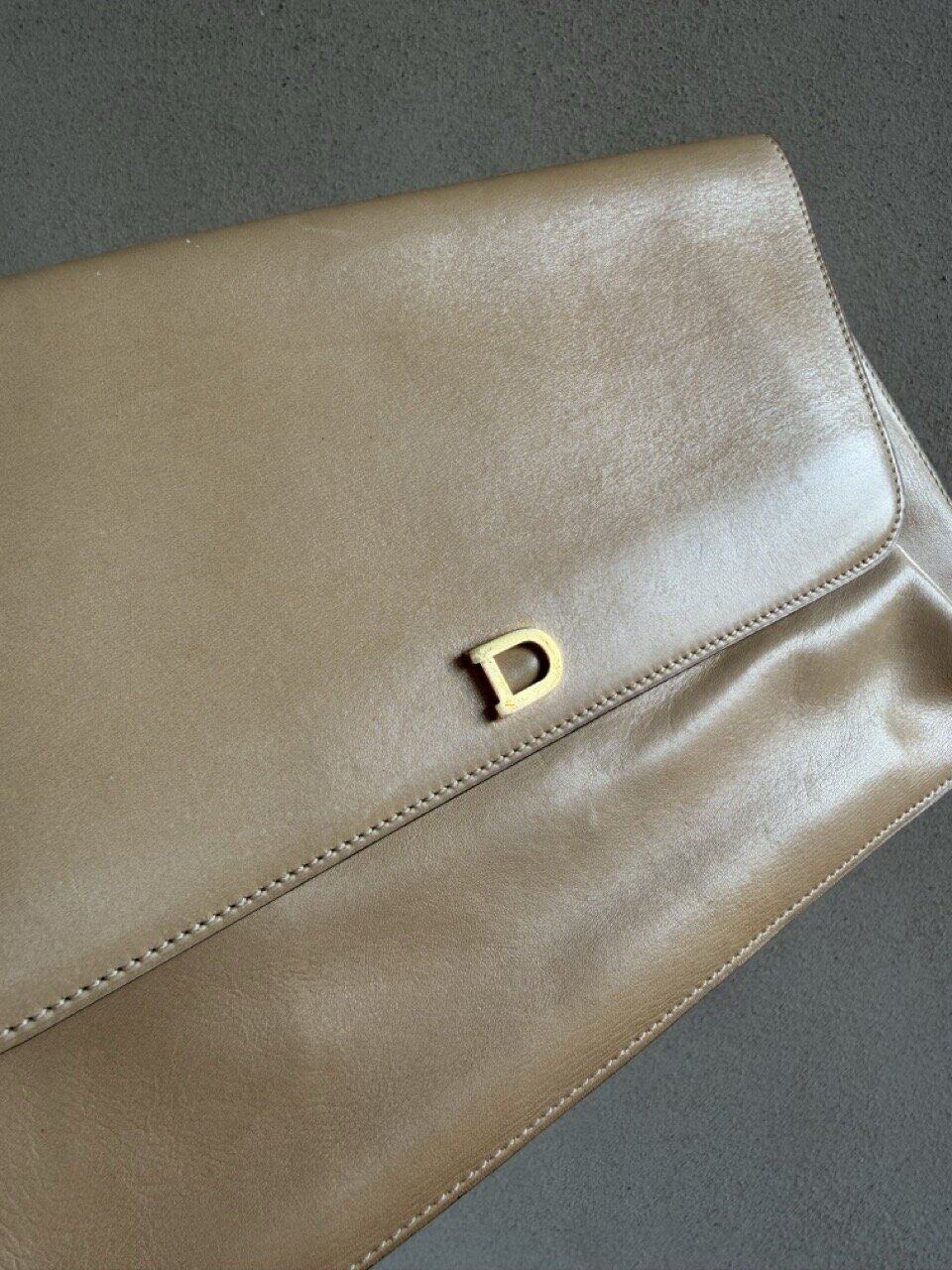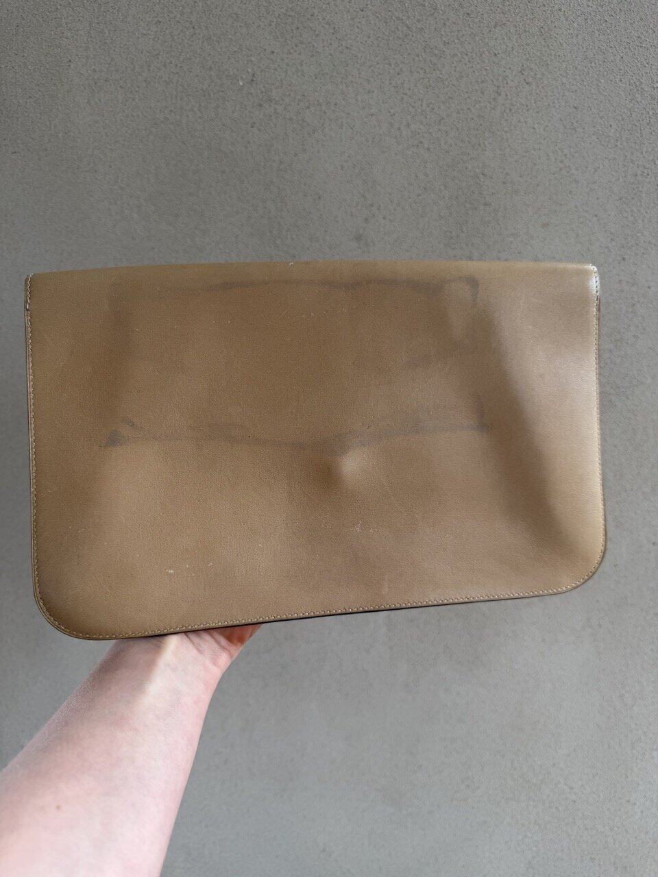 Deze Clutch komt in beige/camel zijdezacht kalfsleder en is uit de jaren 70.