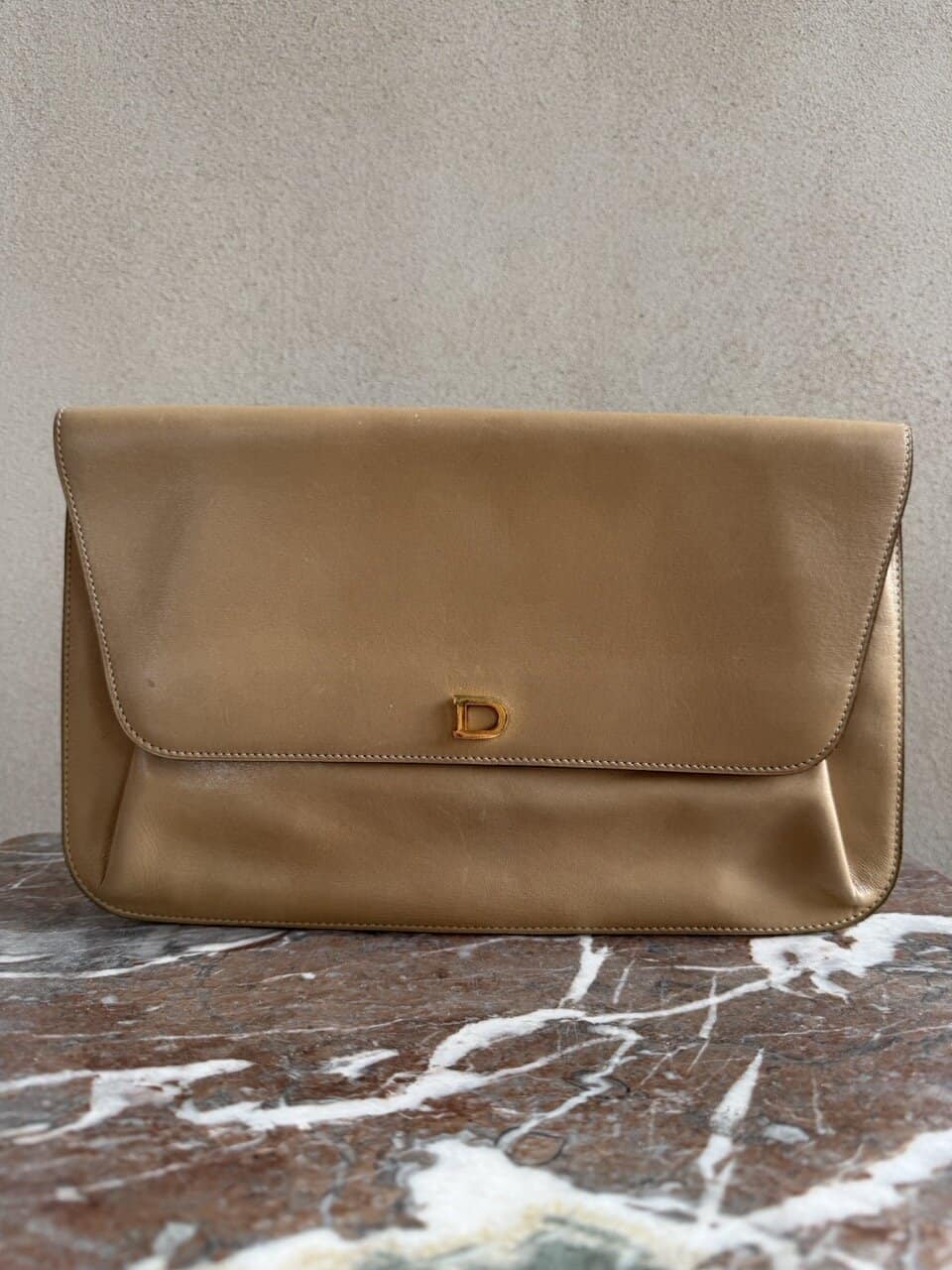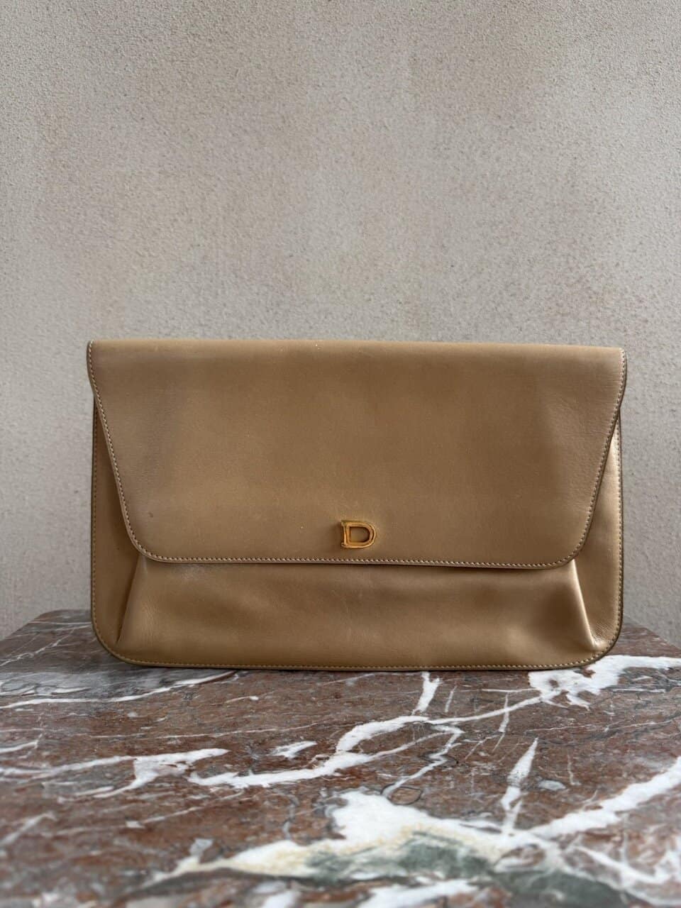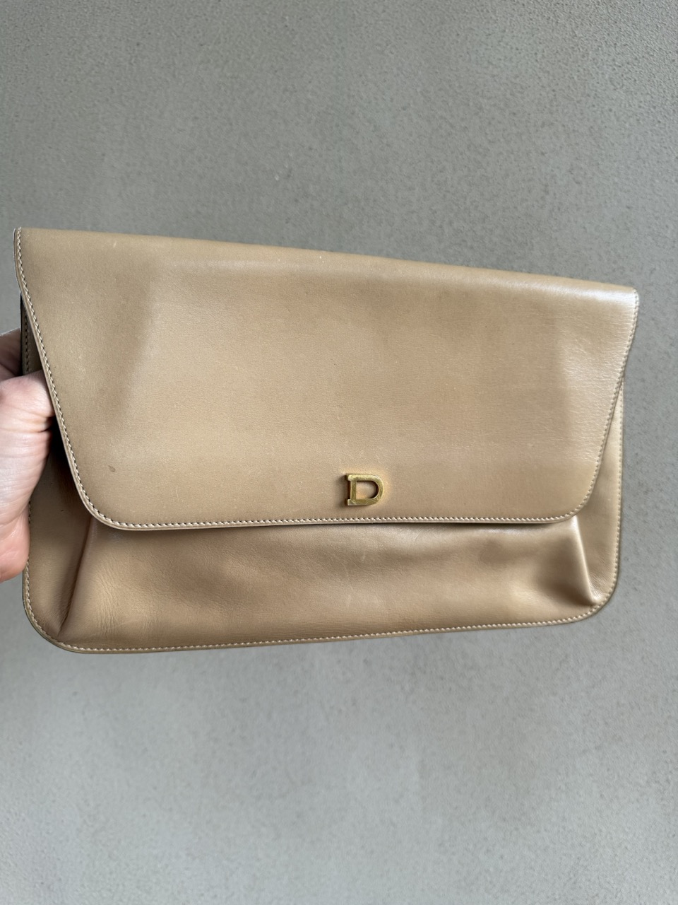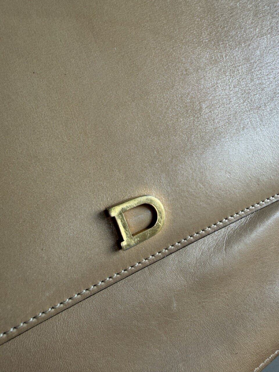 Deze Clutch komt in beige/camel zijdezacht kalfsleder en is uit de jaren 70.