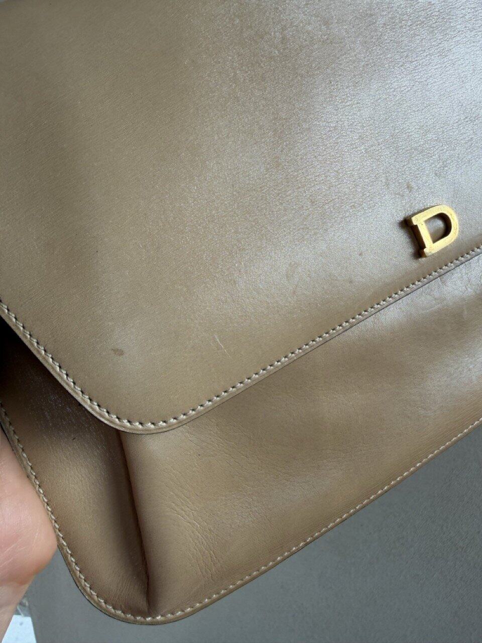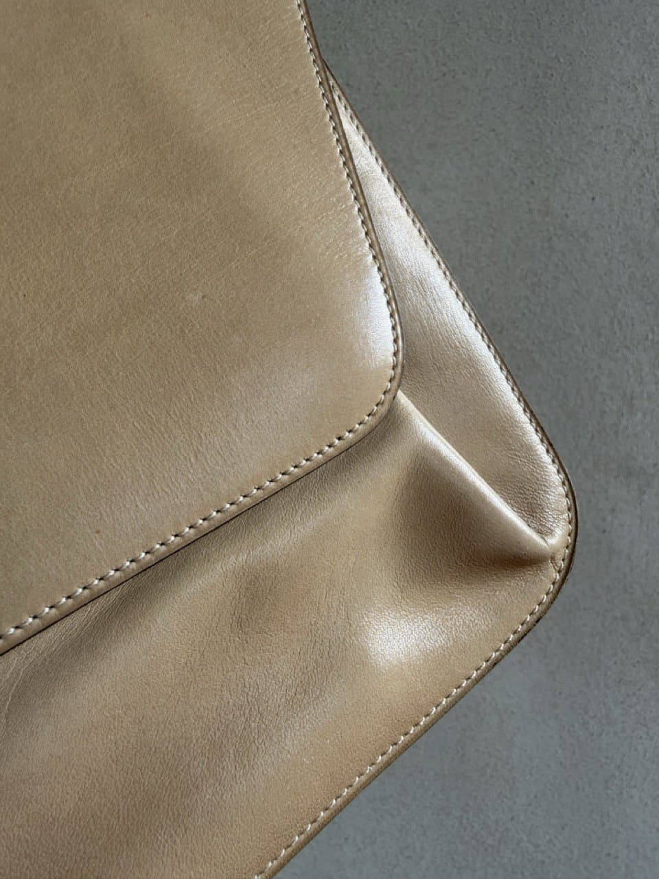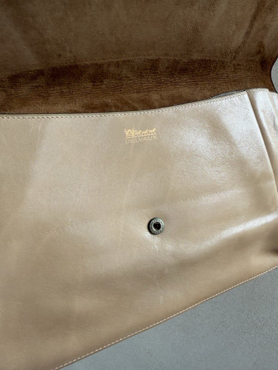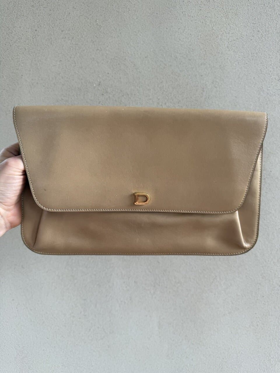 Deze Clutch komt in beige/camel zijdezacht kalfsleder en is uit de jaren 70.
