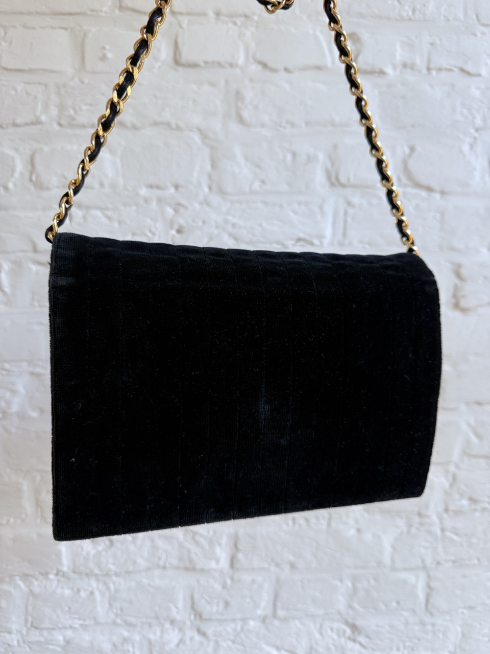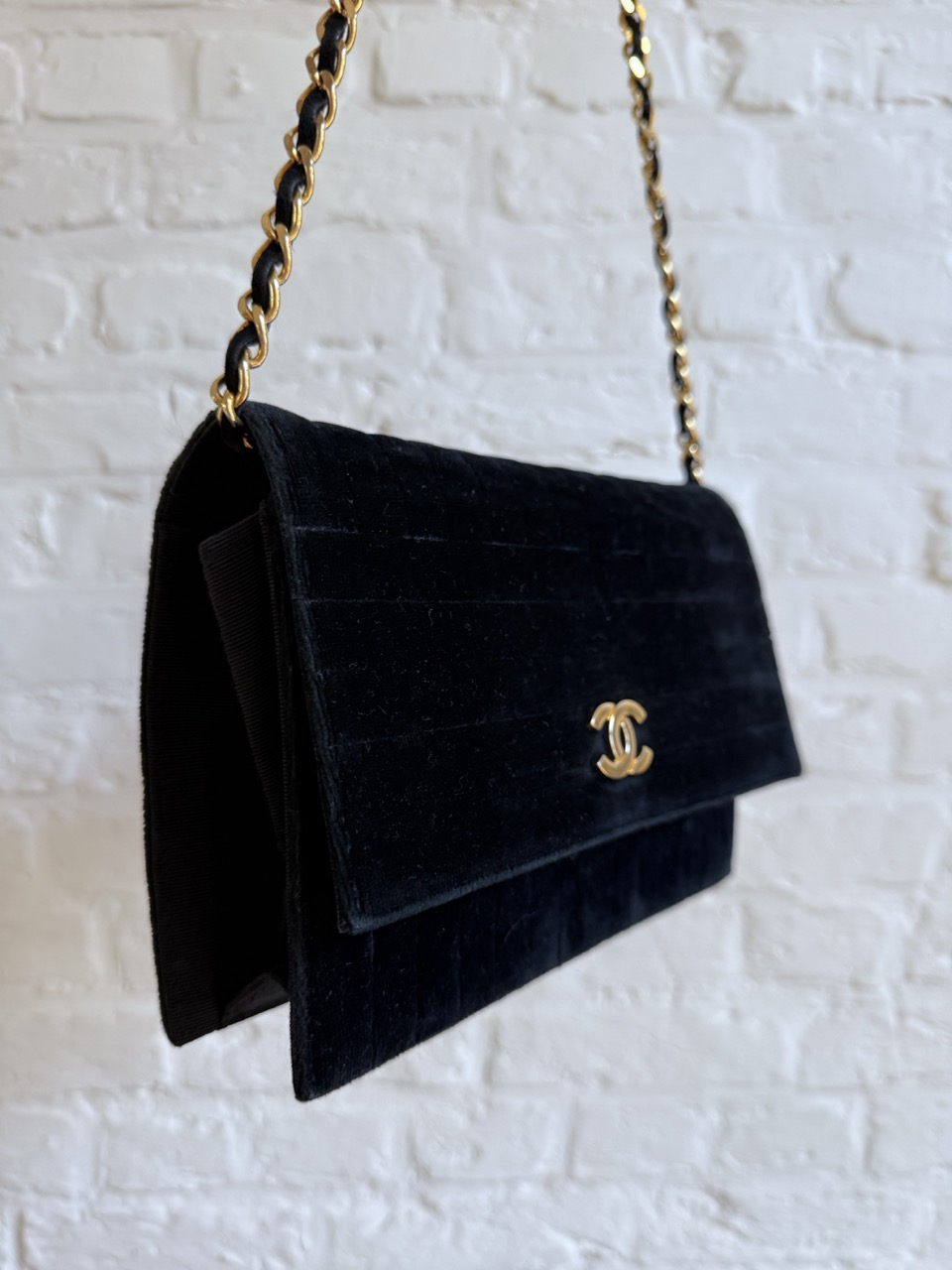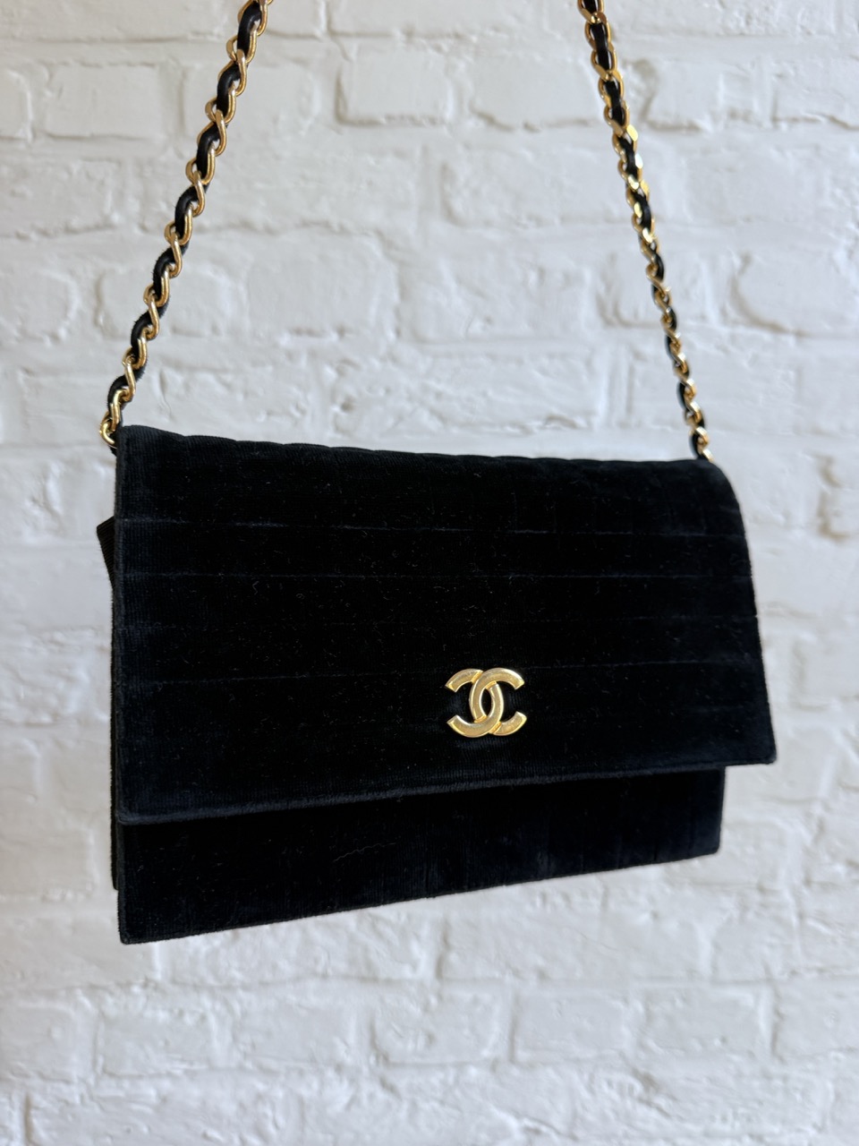 Een Chanel Wallet On Chain in zwarte velours en met gouden hardware.