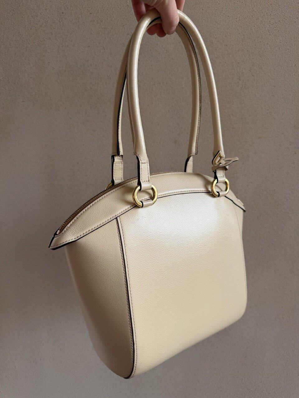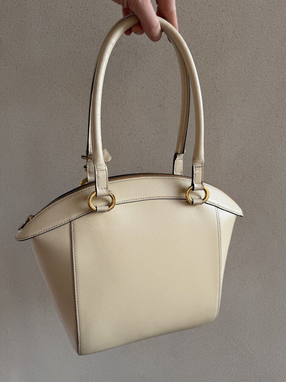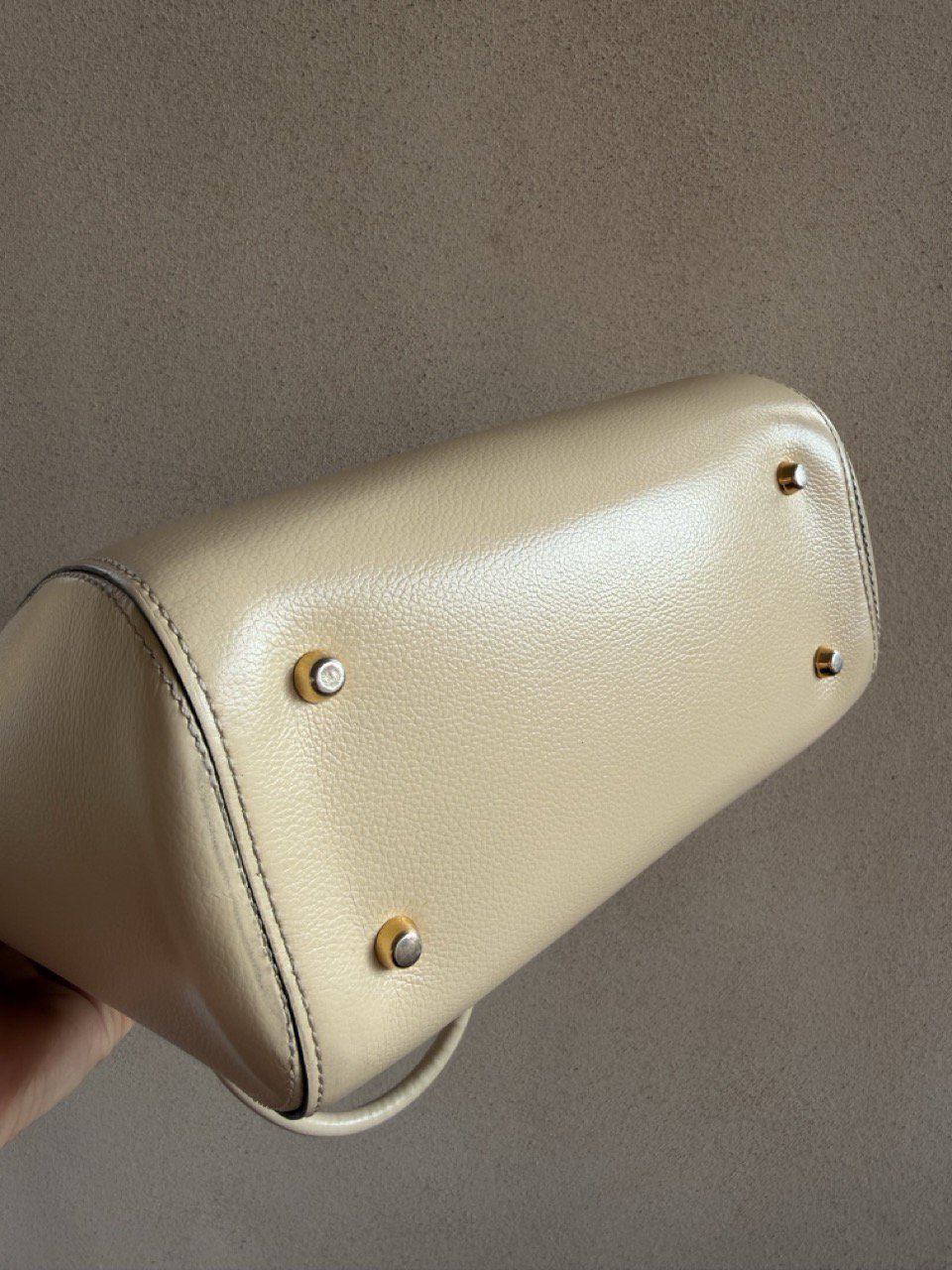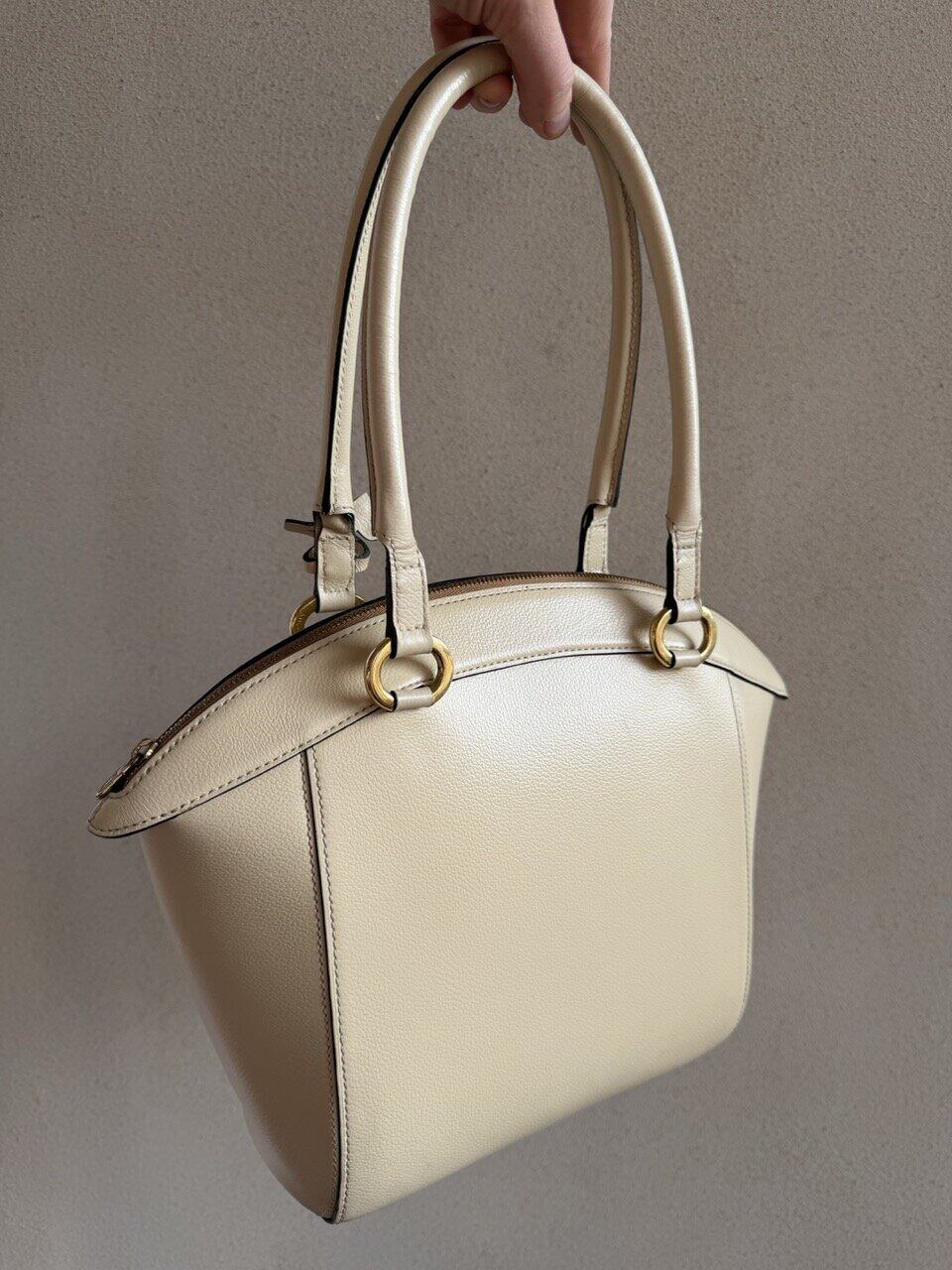 De Charme tas past helemaal bij zijn naam! Deze prachtige Delvaux tas is gemaakt van prachtig ivoorkleurig leder en heeft bijpassende goudkleurige hardware. Dit elegante ontwerp is net zo praktisch als stijlvol. De relatief grote tas opent met de bovenste rits naar het cognac suède interieur, dat twee zijvakken heeft.
