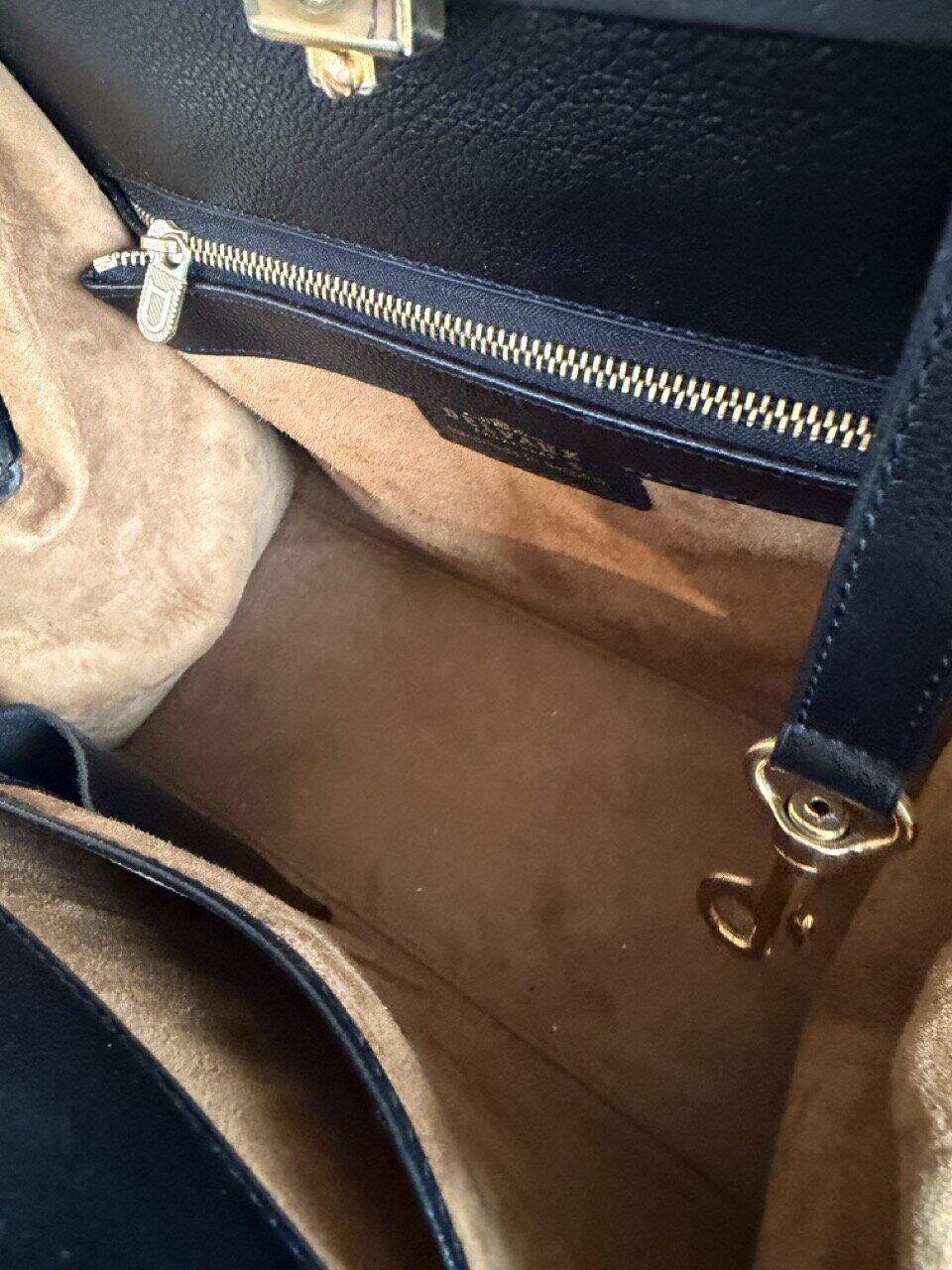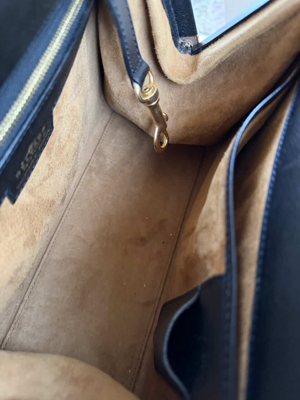 Het is een beugeltas die je opent via een knopje bovenaan en toegang geeft tot een ruim suède interieur.