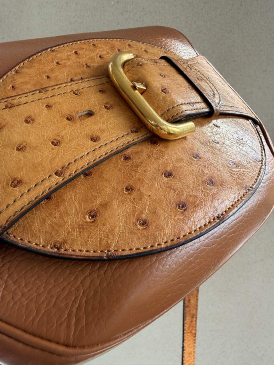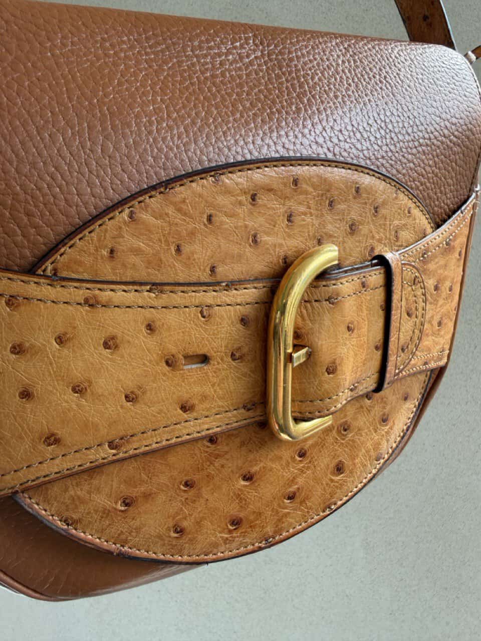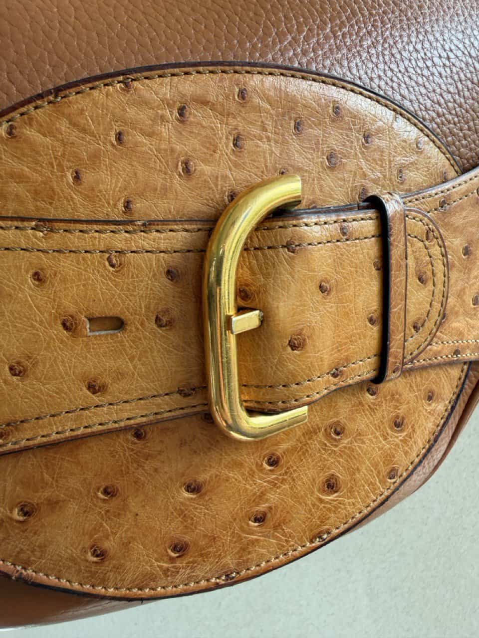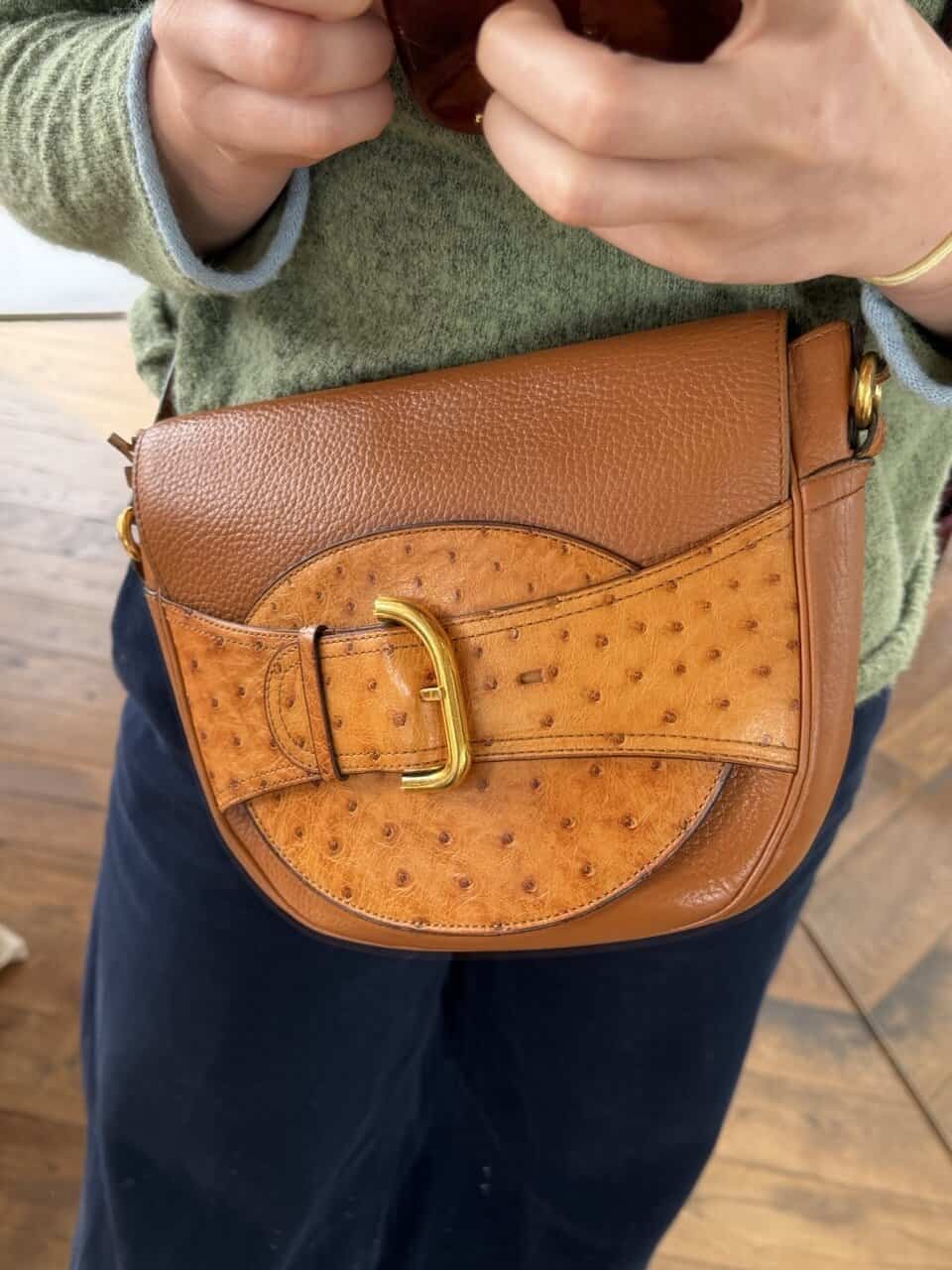 De tas is uitgevoerd in struisvogelhuid en wordt alleen maar mooier met de jaren.