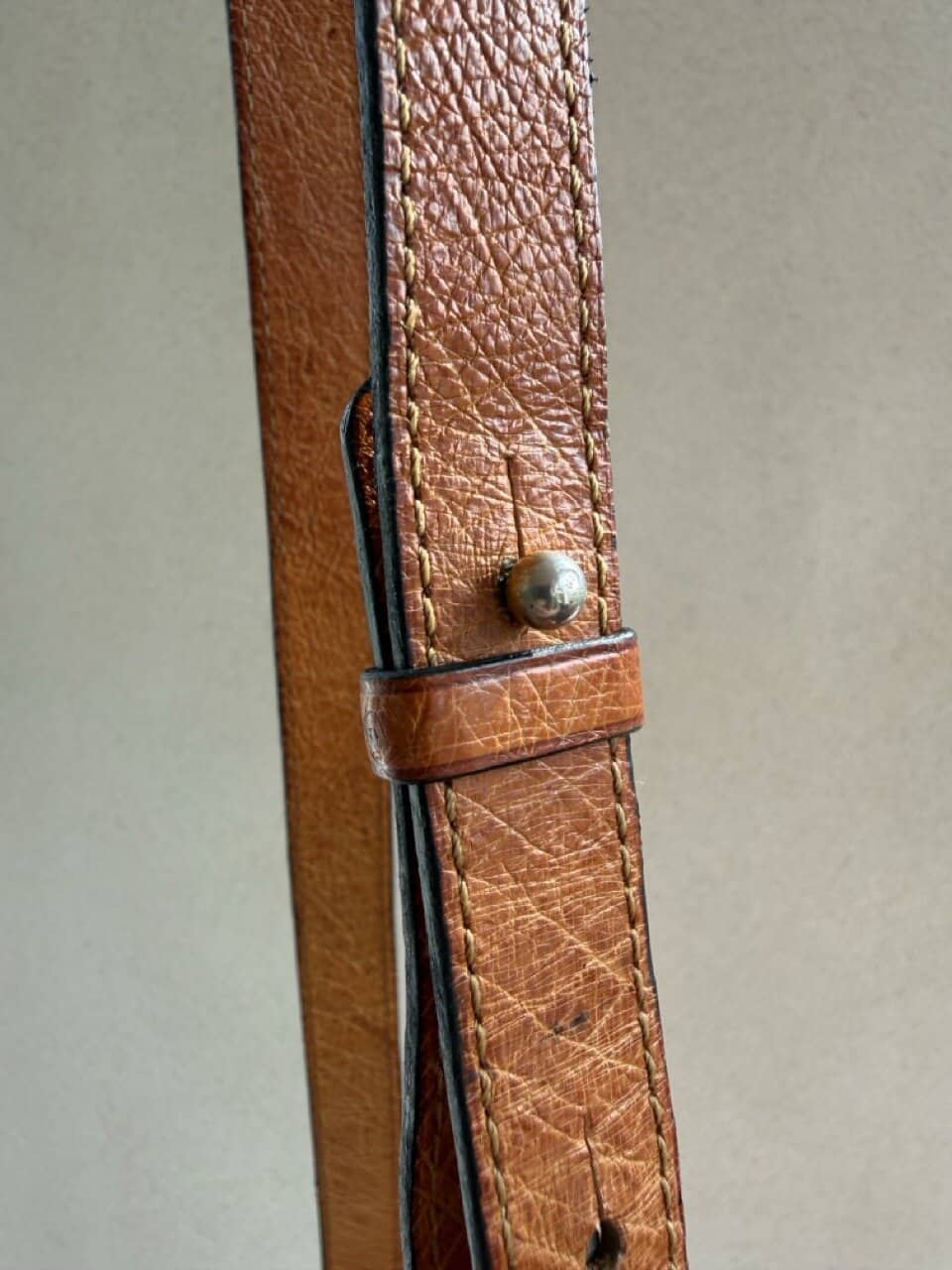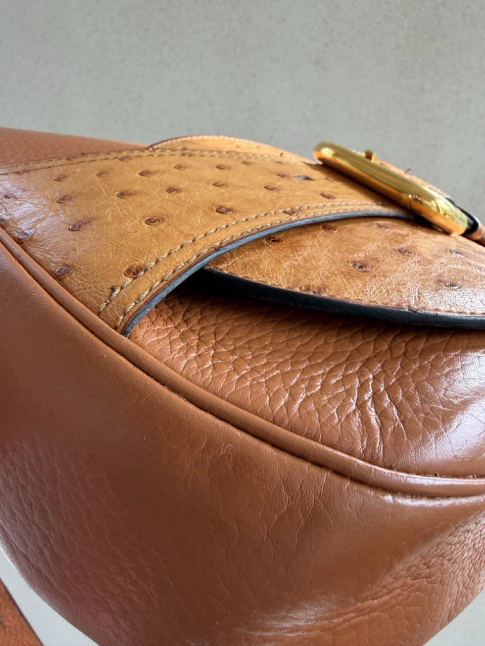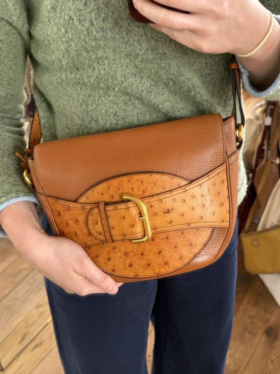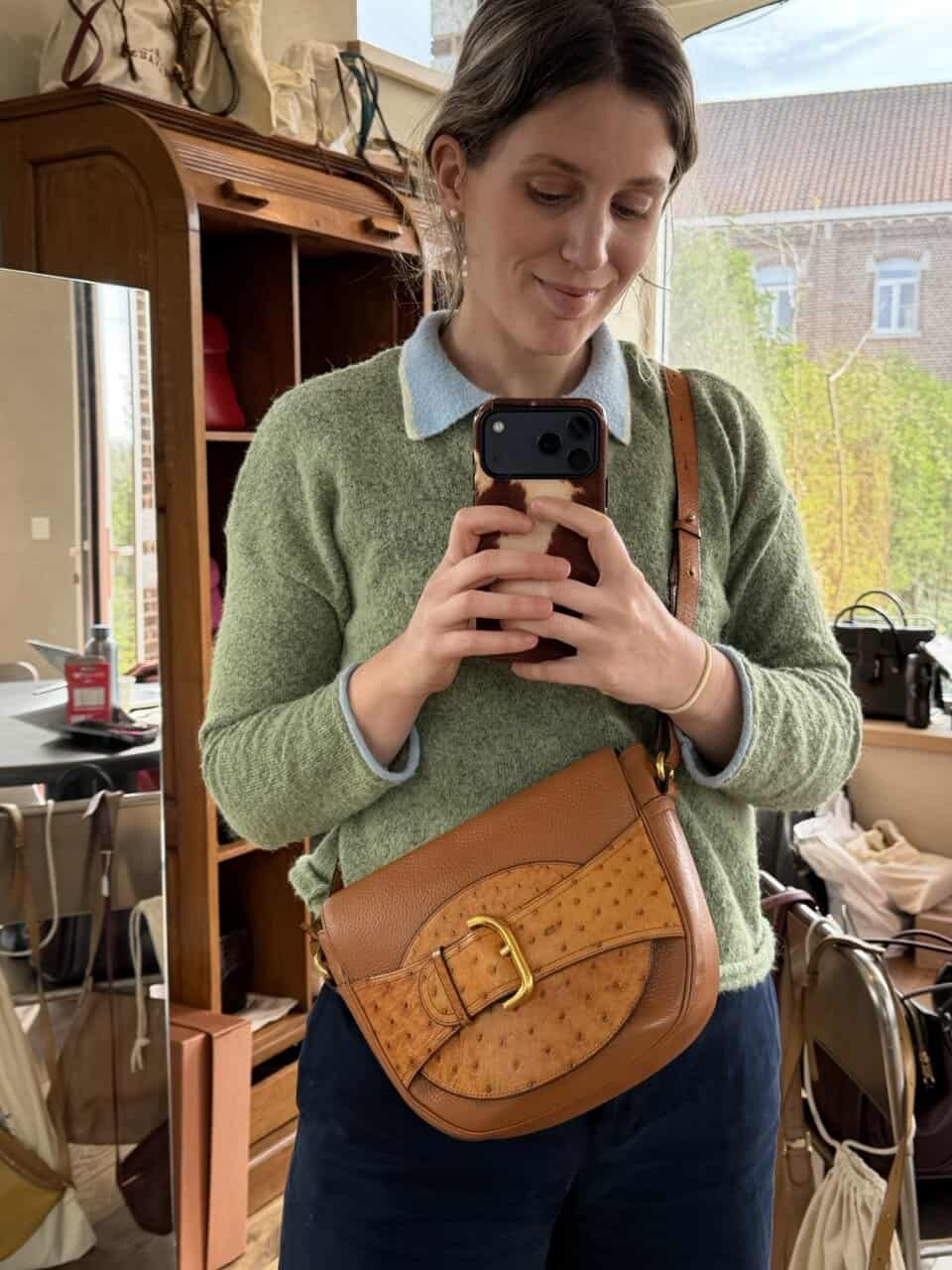 De tas is uitgevoerd in struisvogelhuid en wordt alleen maar mooier met de jaren.