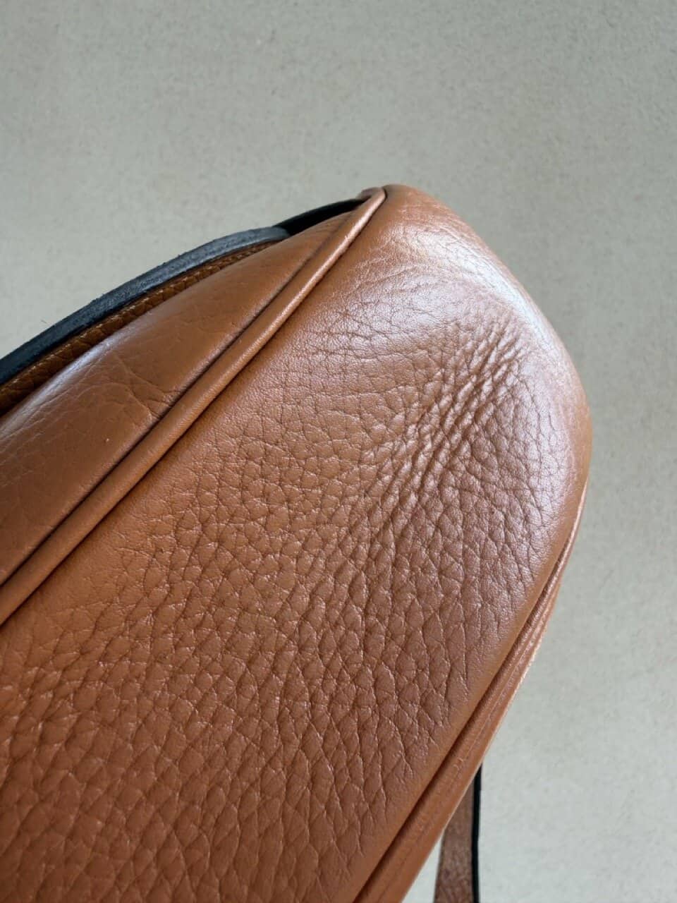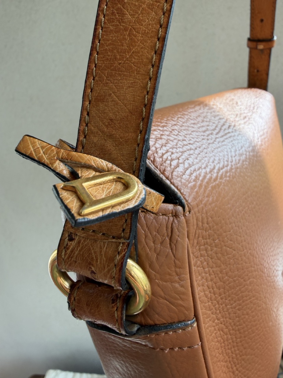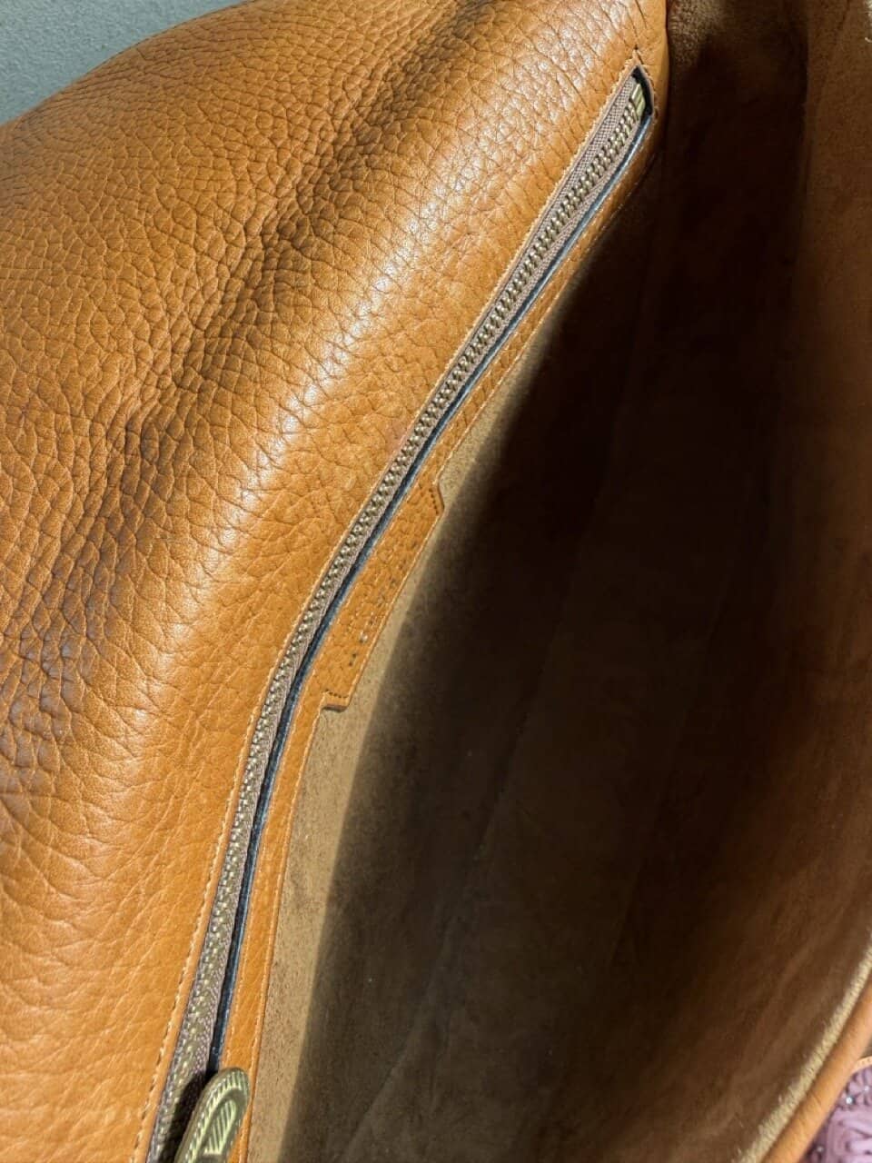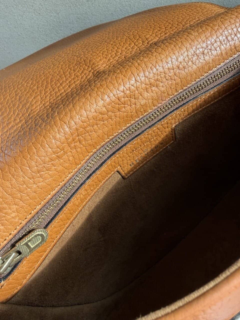 De tas is uitgevoerd in struisvogelhuid en wordt alleen maar mooier met de jaren.