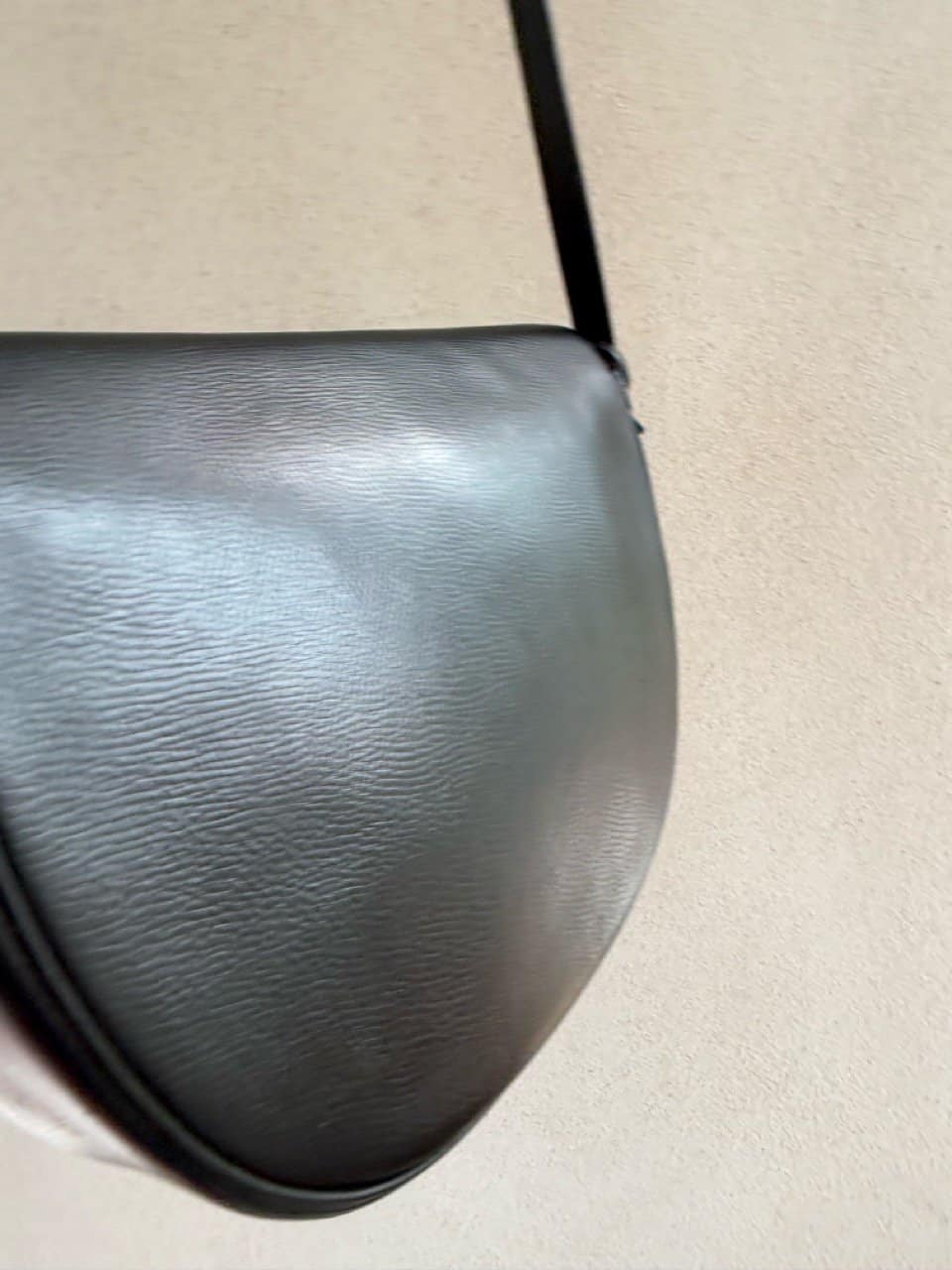 Je draagt hem als hoge crossbody of over de schouder of aan de hand. De riem is namelijk met een gesp af te stellen op verschillende standen.