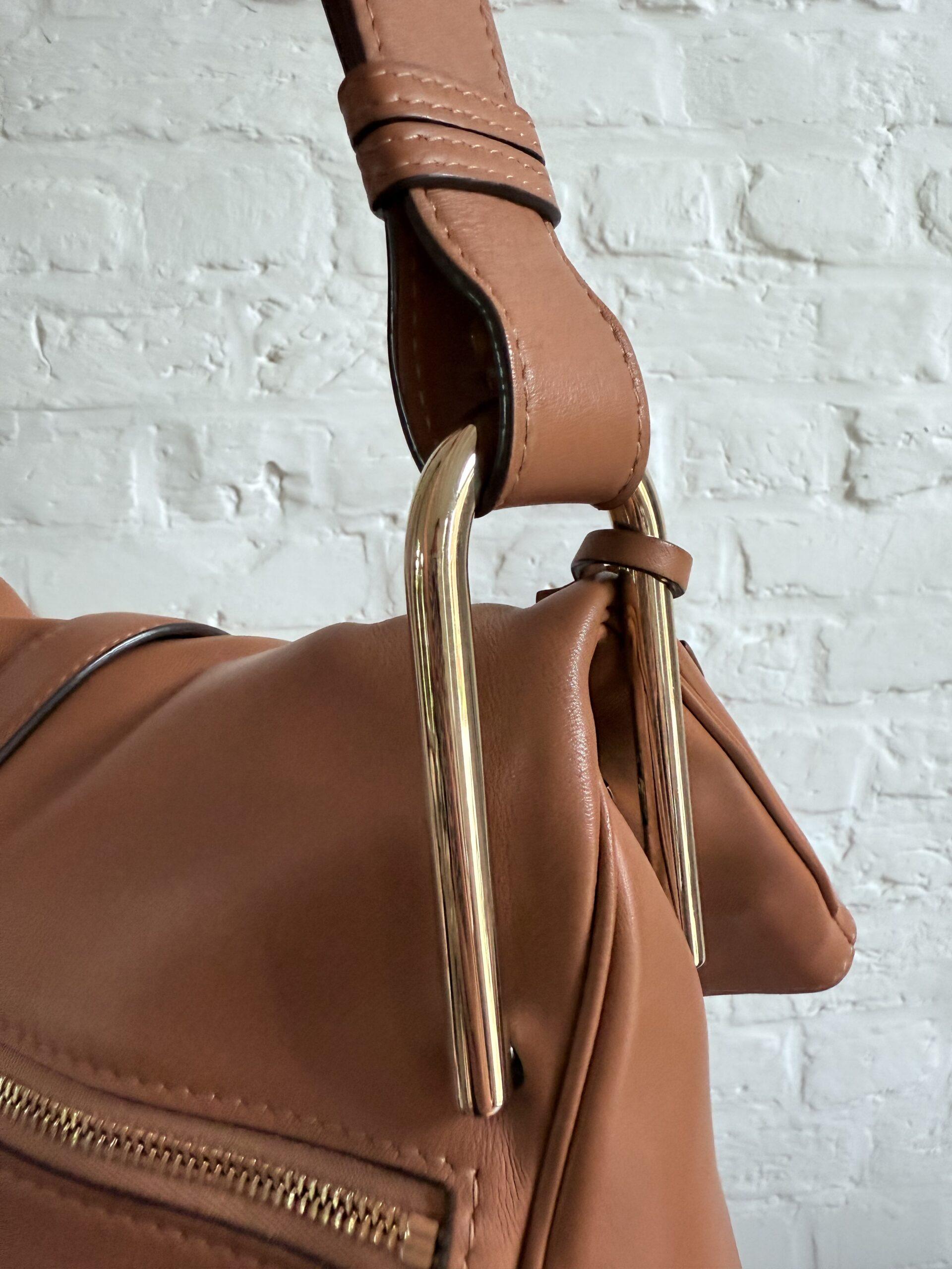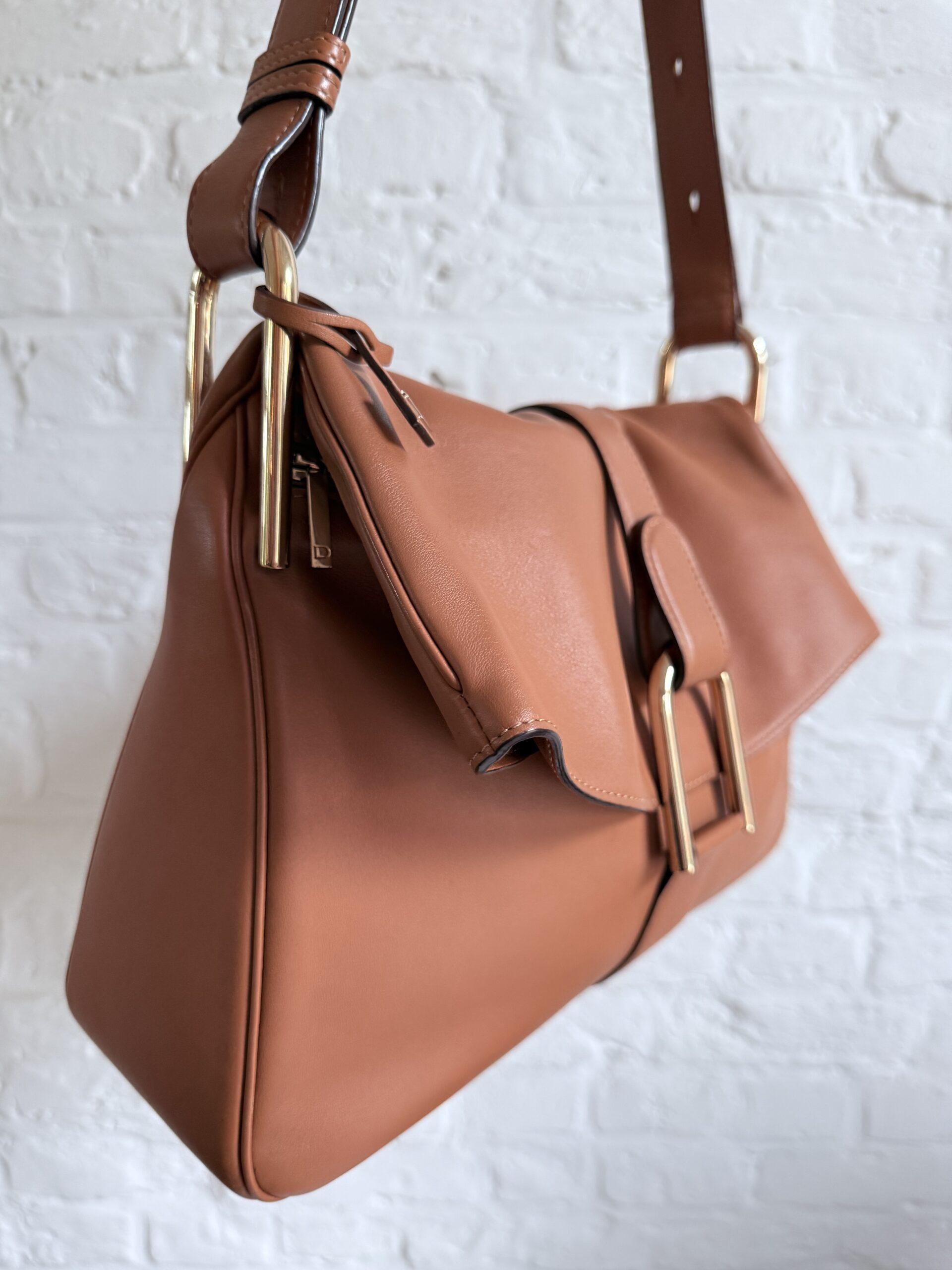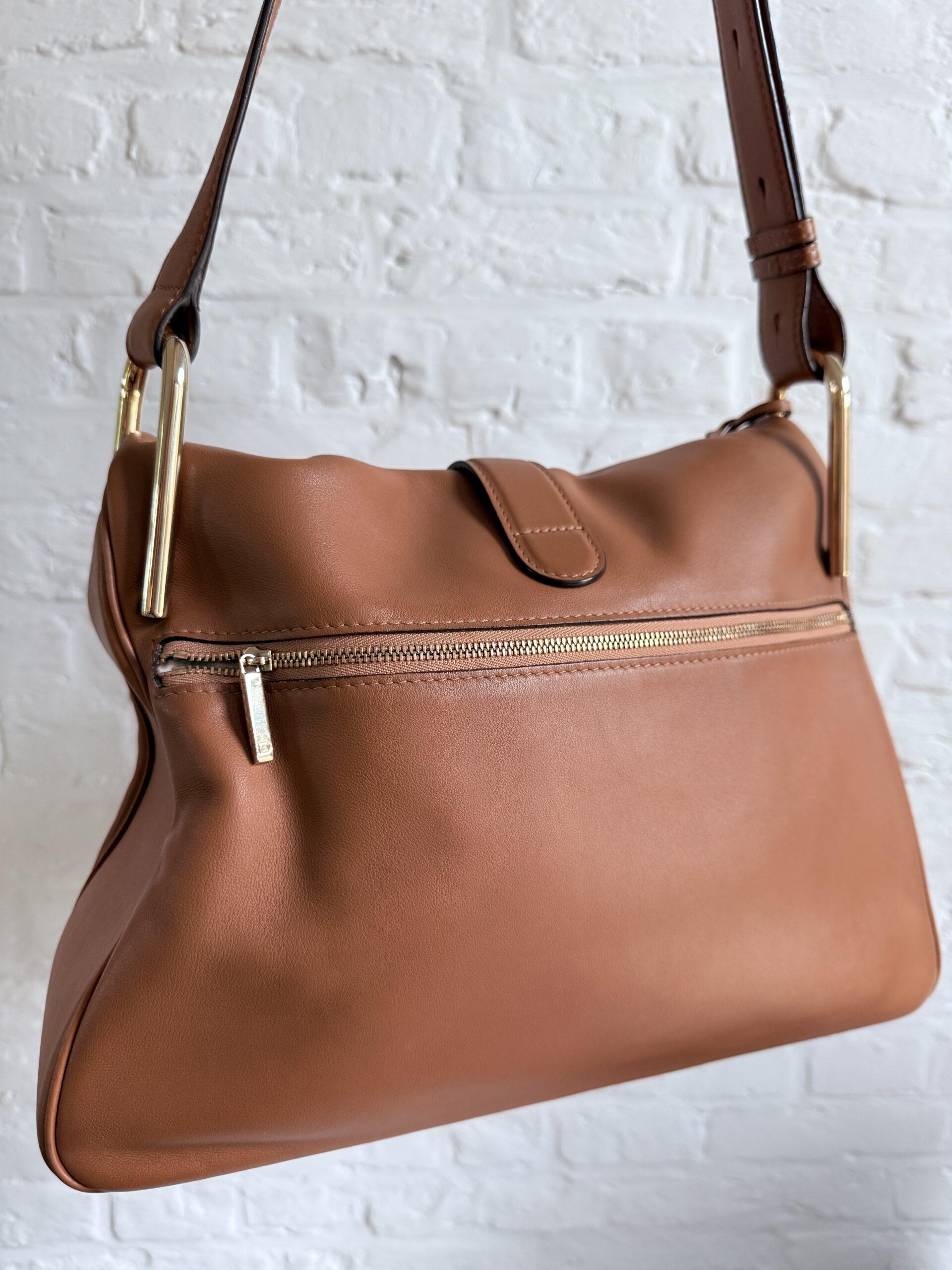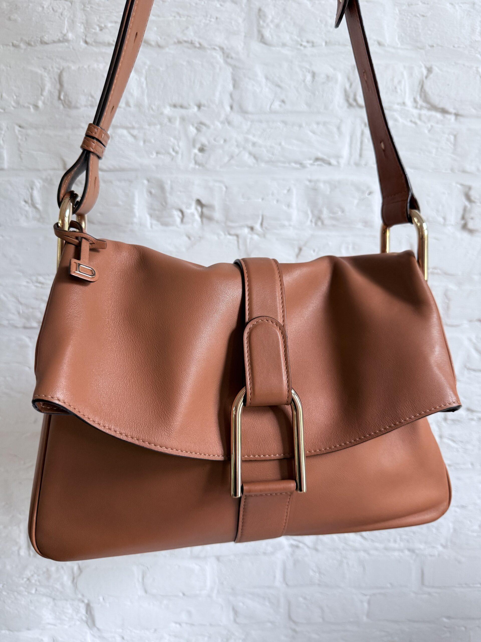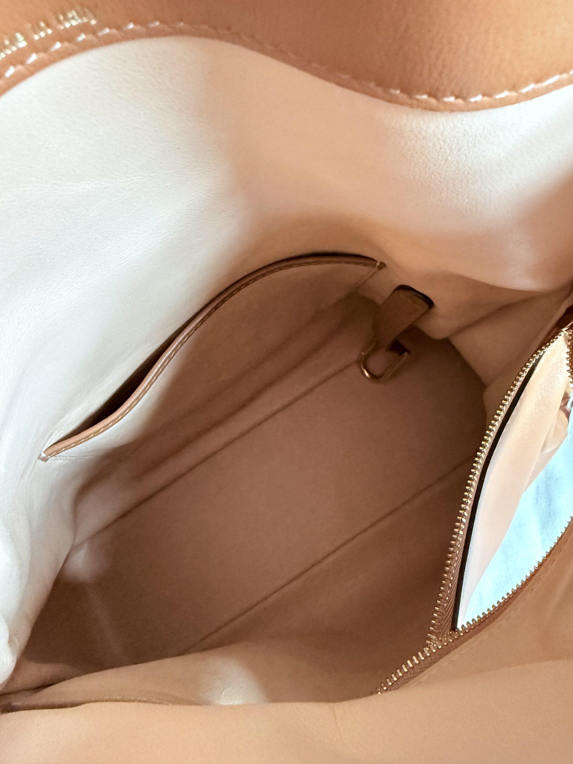 Het is een grote tas bestaande uit één groot compartiment die je dubbelvouwt en afsluit met een magnetische sluiting. Achteraan de tas heb je nog een apart compartiment met ritssluiting, gevoerd met toile de lin.